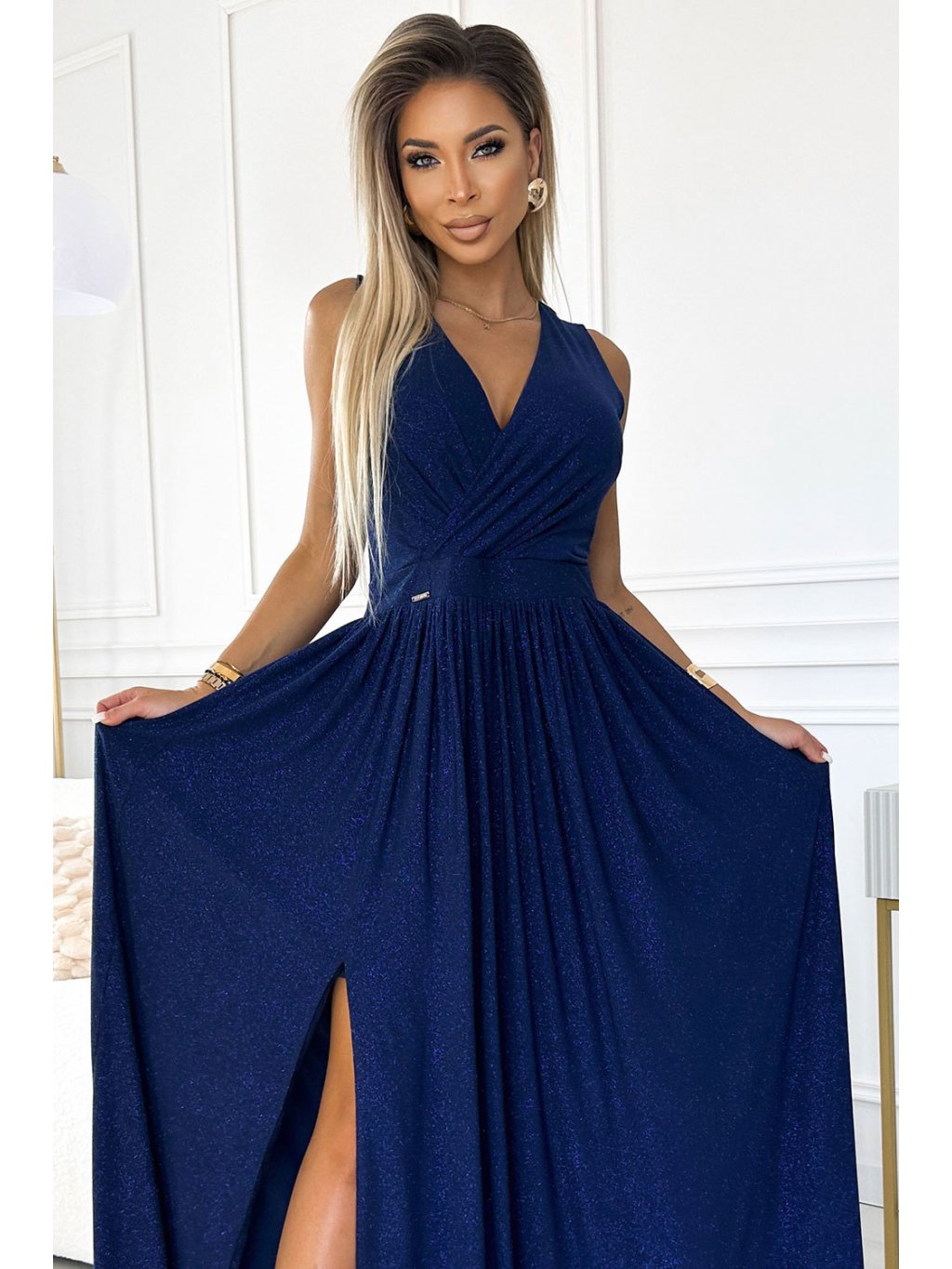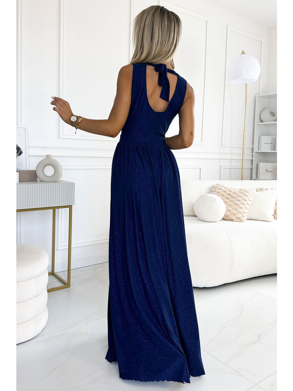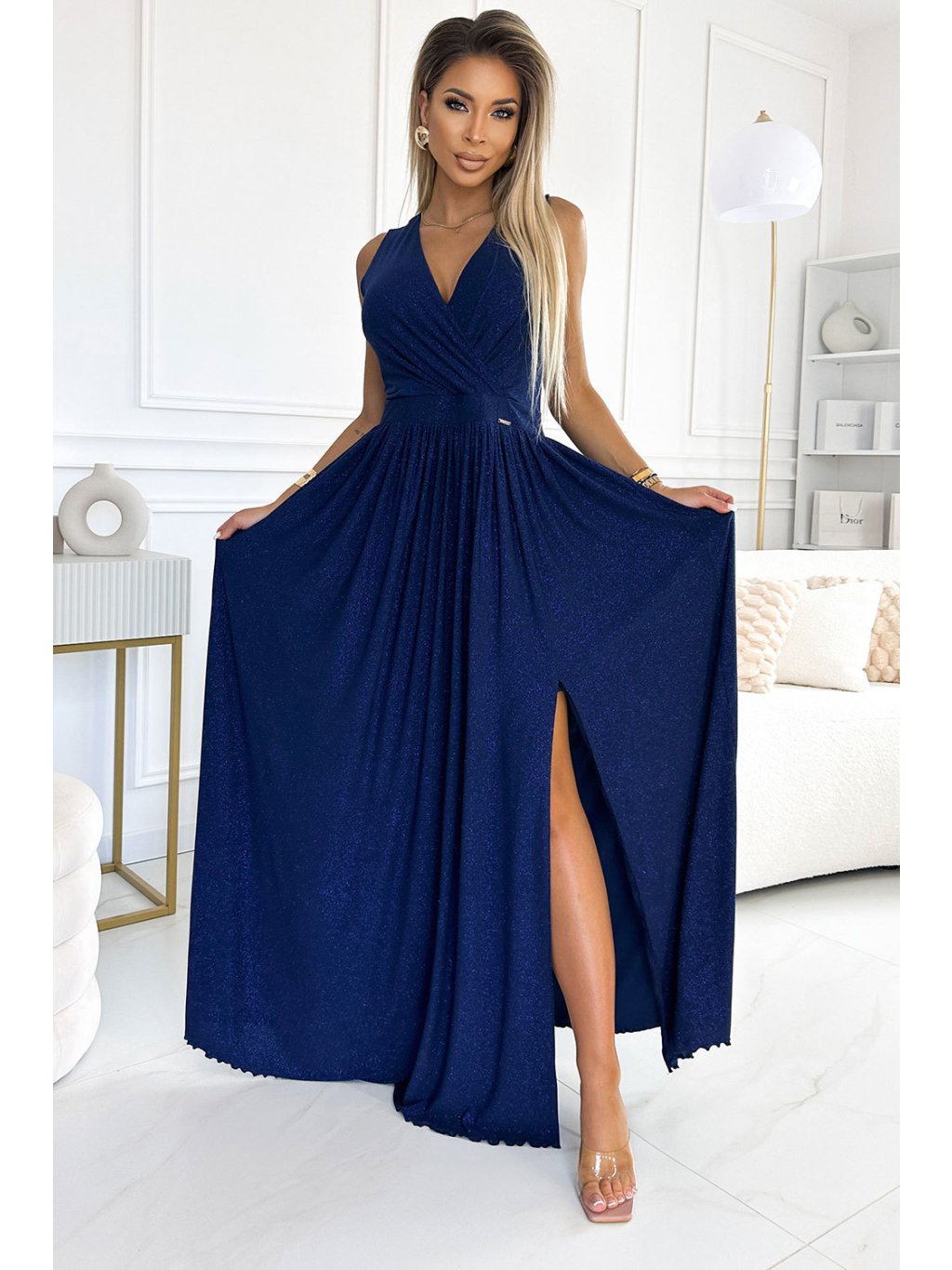 (Vel. XL) Dlouhé tmavě modré společenské šaty s výstřihem JUSTINE