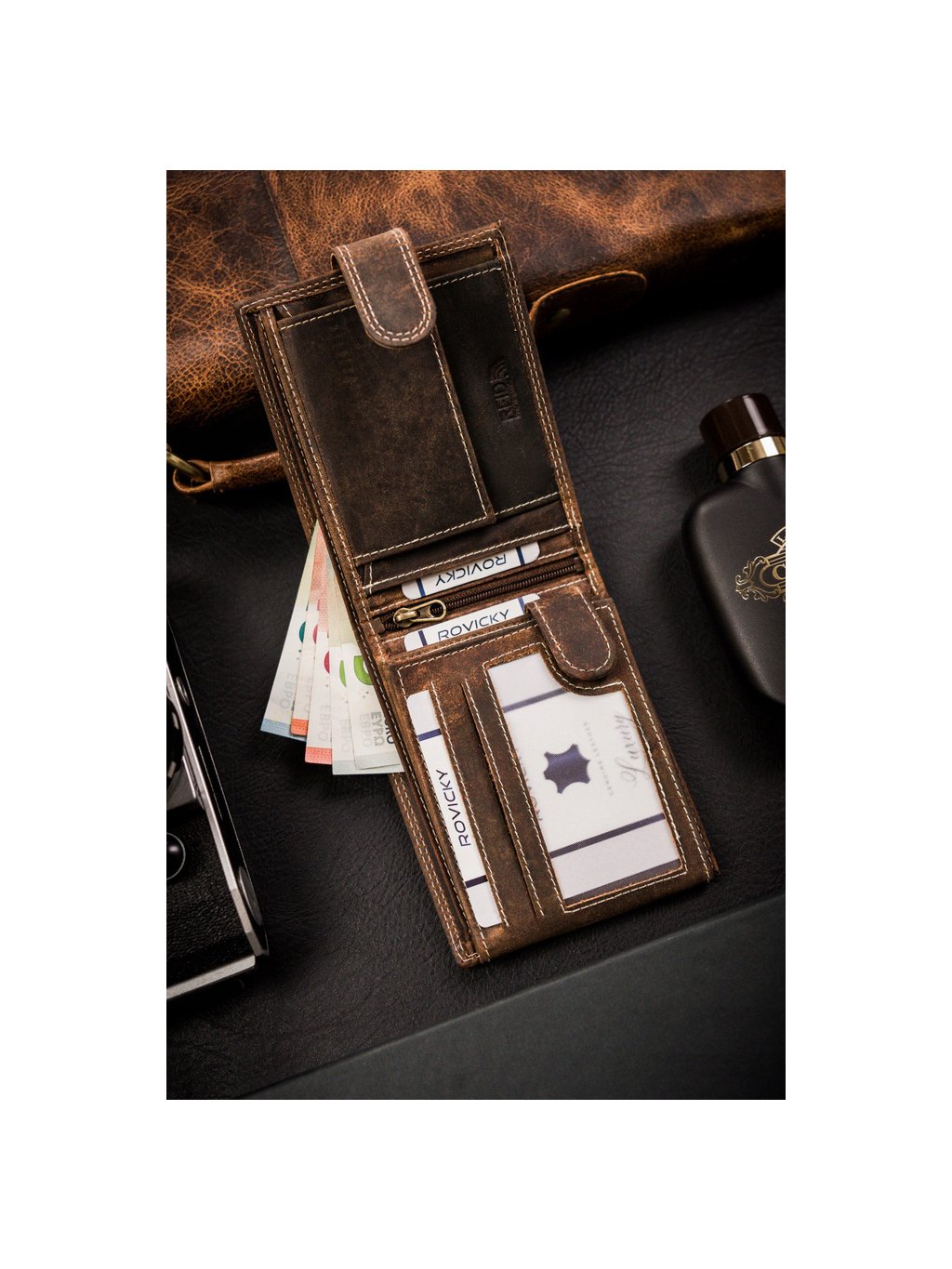 - 1 přihrádka na zip uprostřed peněženky