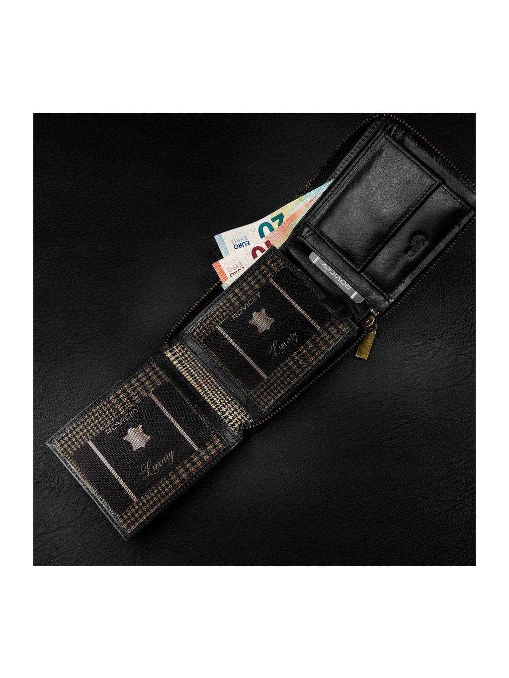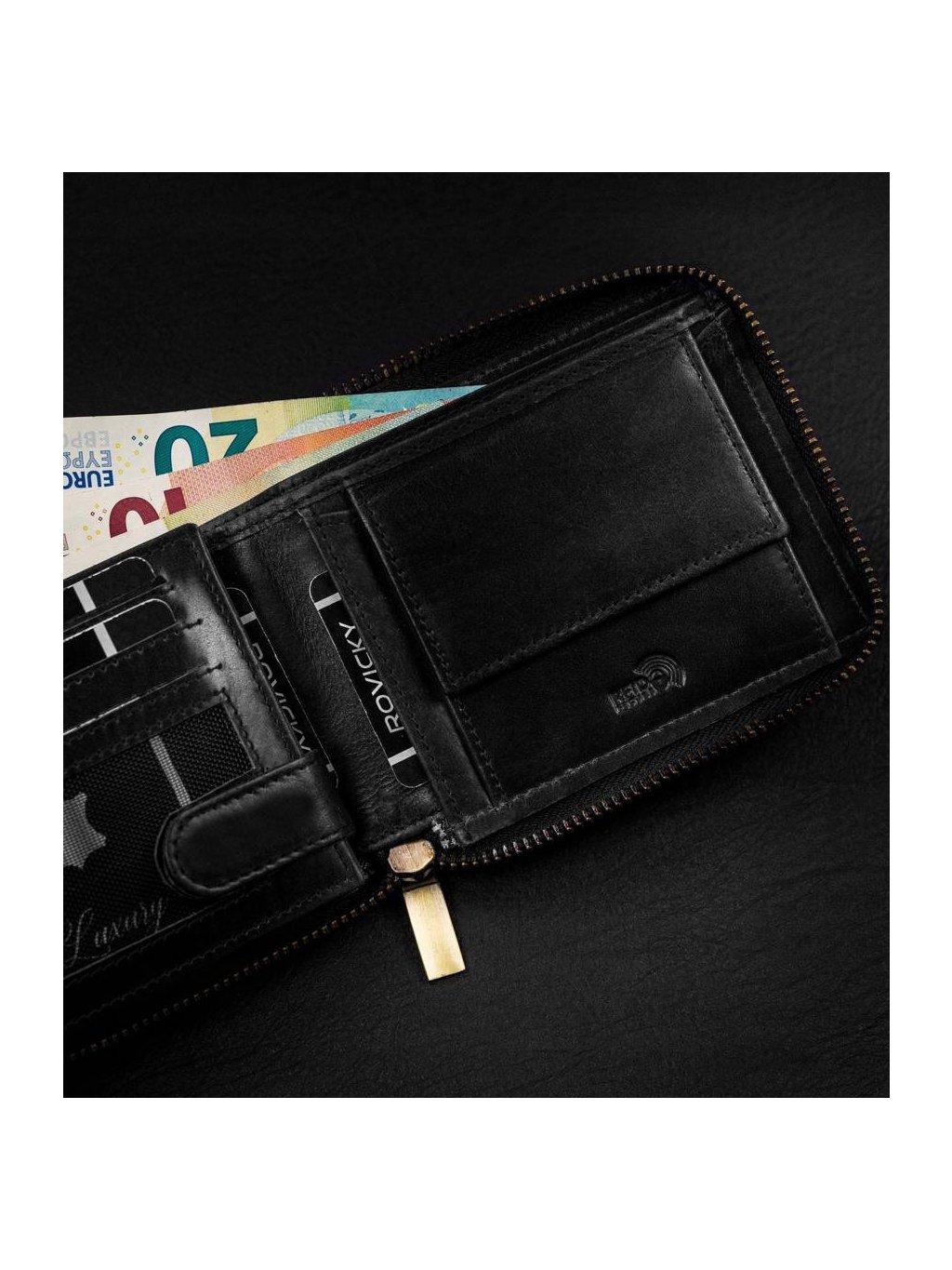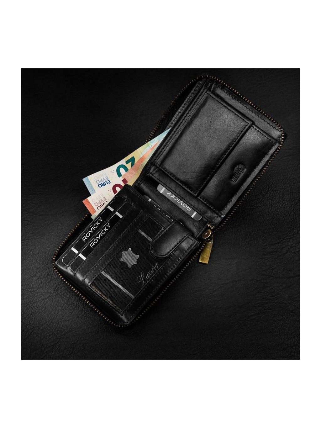 • uvnitř jsou 2 přihrádky na bankovky, kapsa na mince, 11 míst na karty, 4 místa na větší doklady