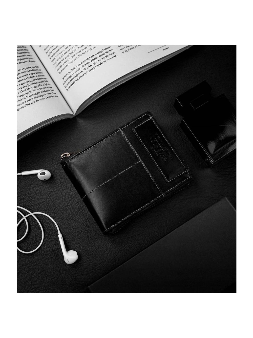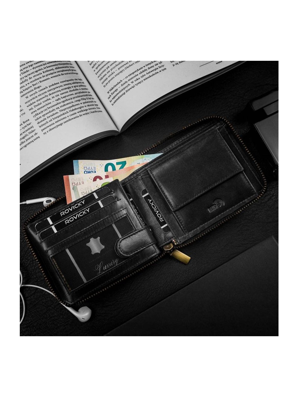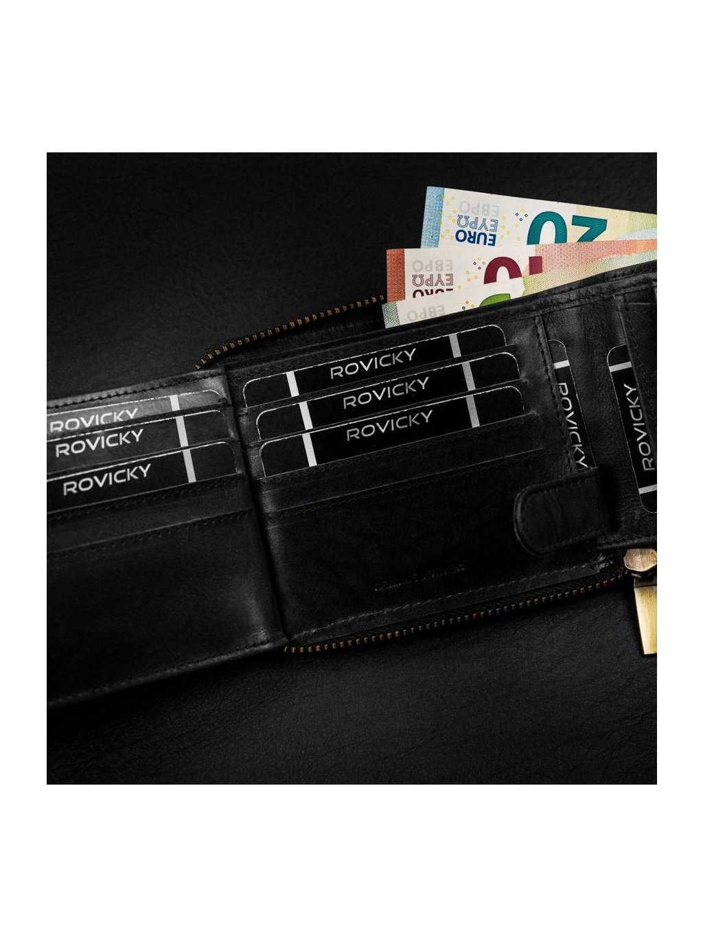 • uvnitř jsou 2 přihrádky na bankovky, kapsa na mince, 11 míst na karty, 4 místa na větší doklady