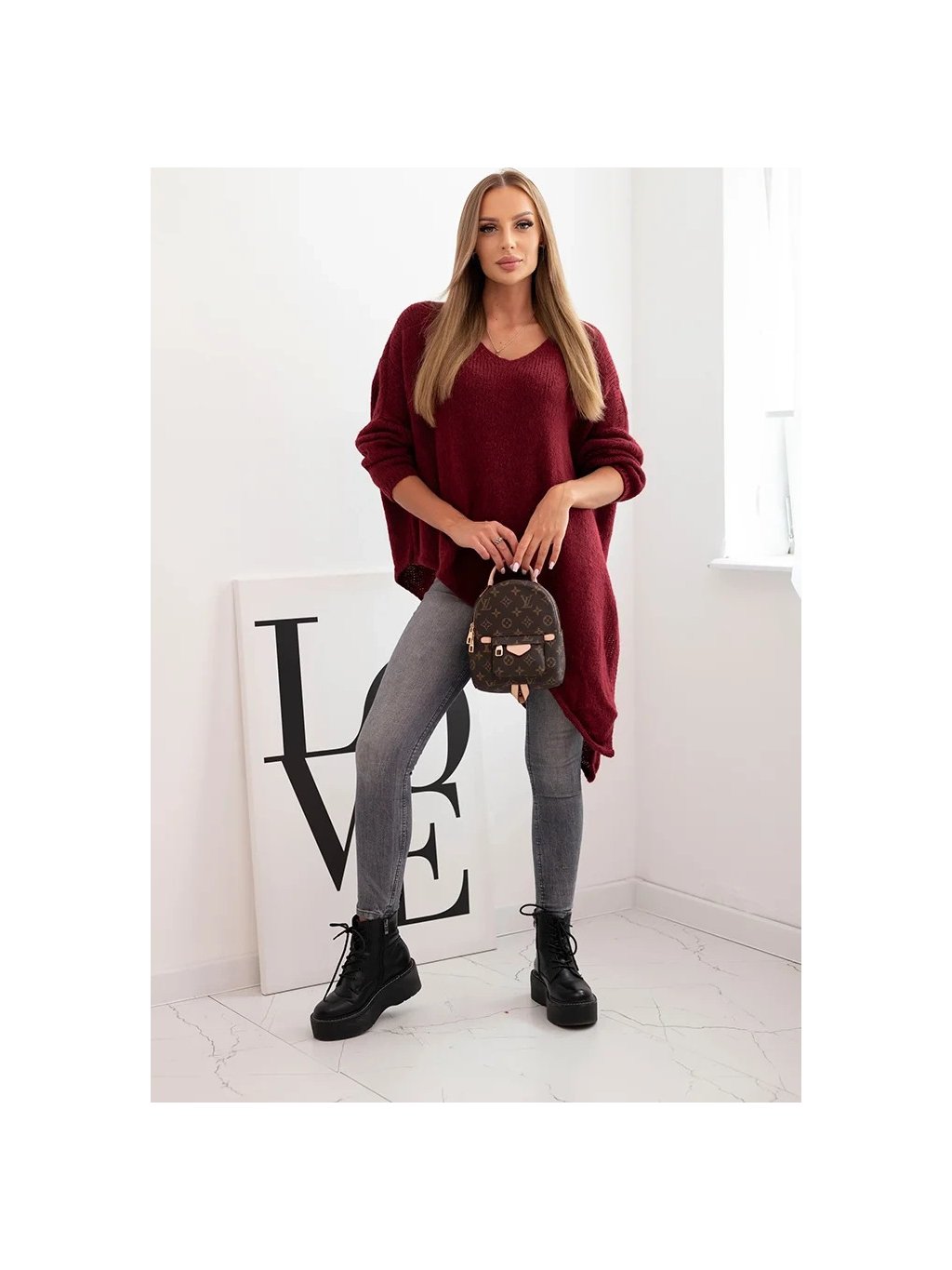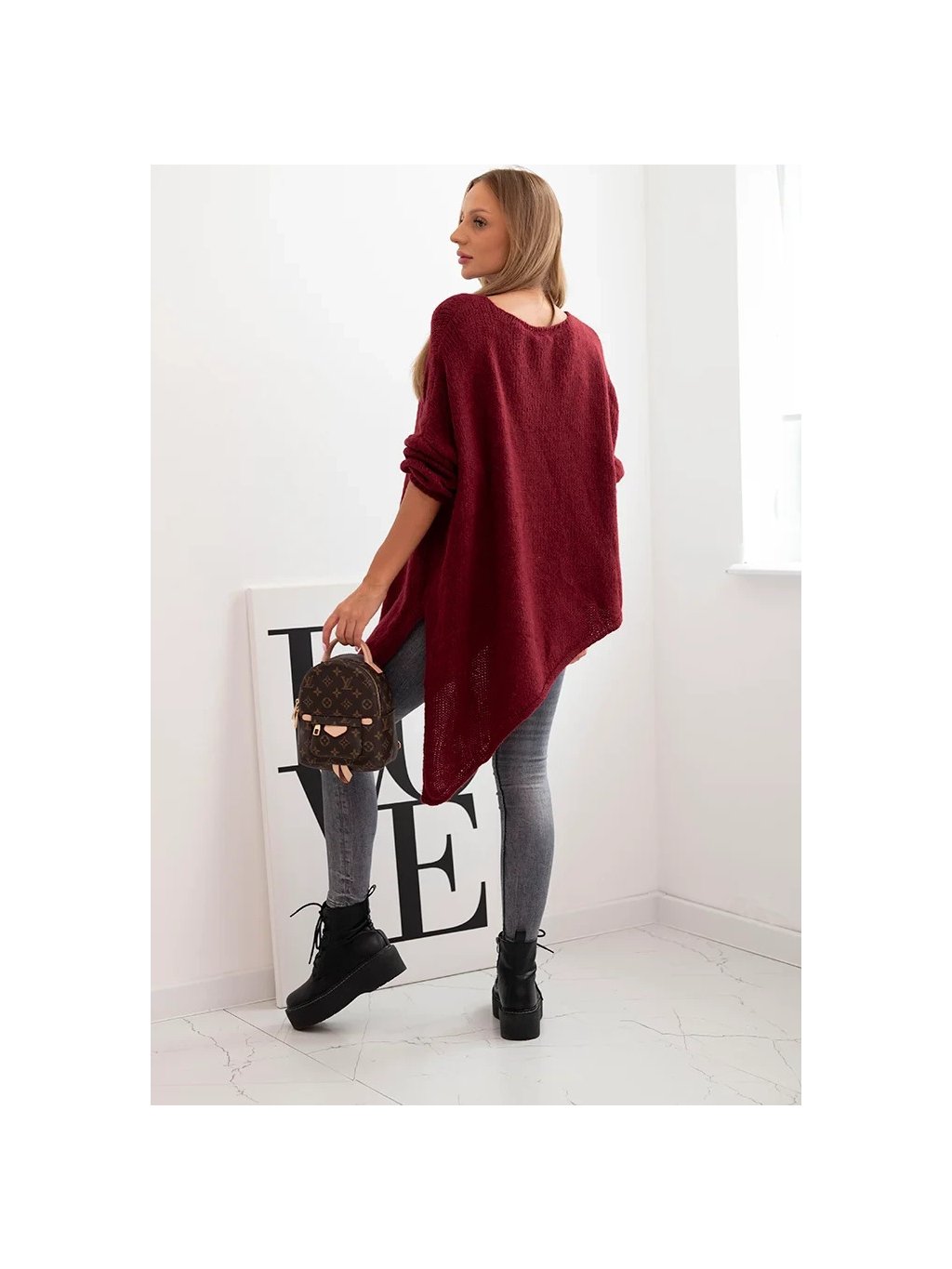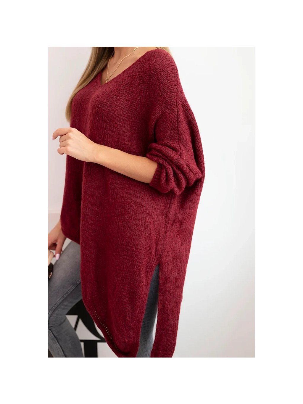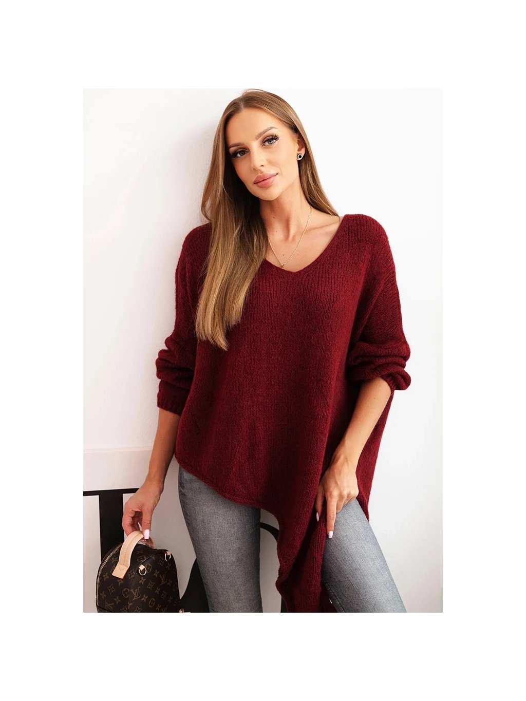 Asymetrický dámský vínový plus size svetr s výstřihem do V