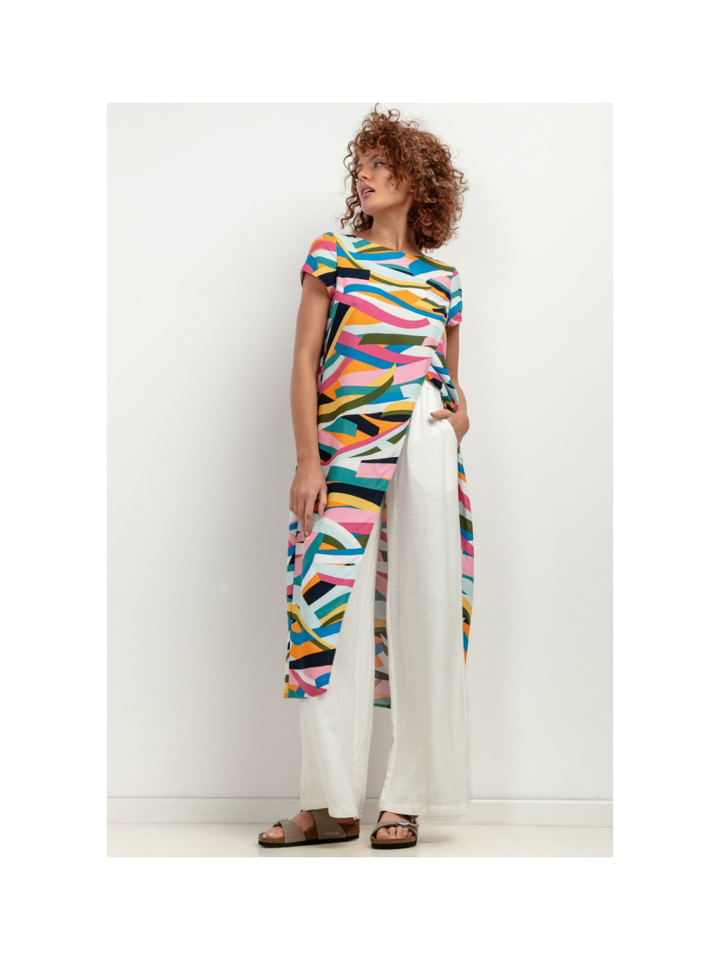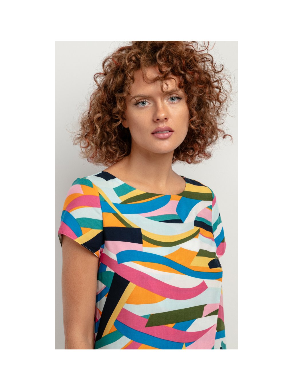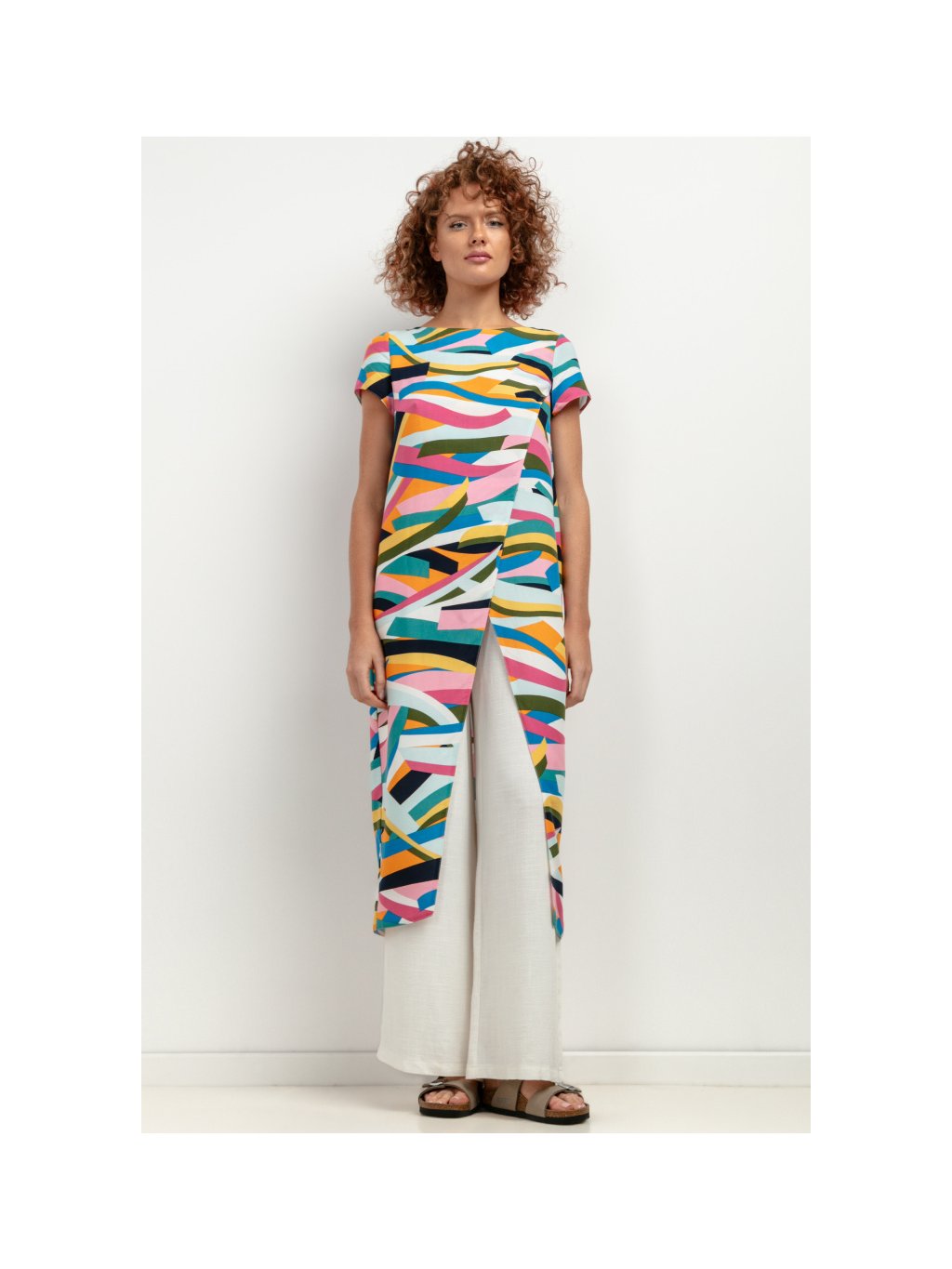 Barevná dámská halenka s asymetrickým střihem a abstraktním vzorem