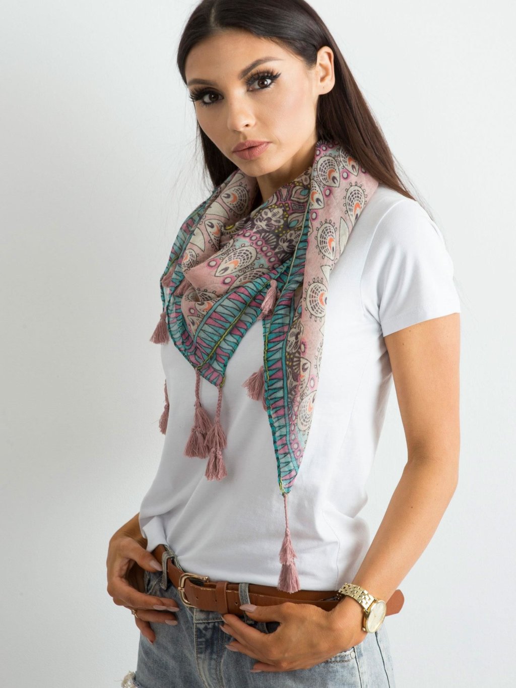 Dámský šátek s bohatě etnickými vzory a třásněmi