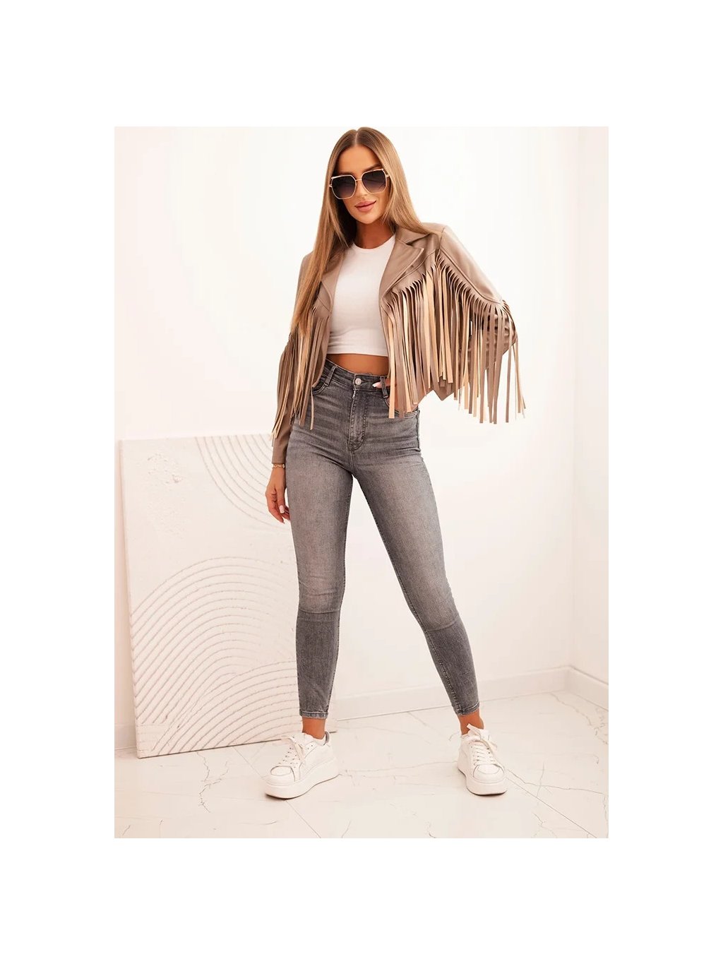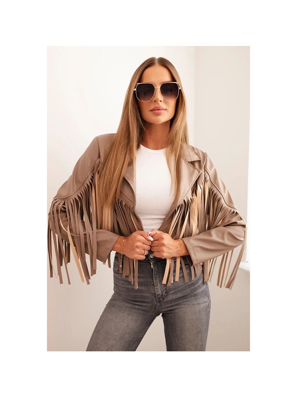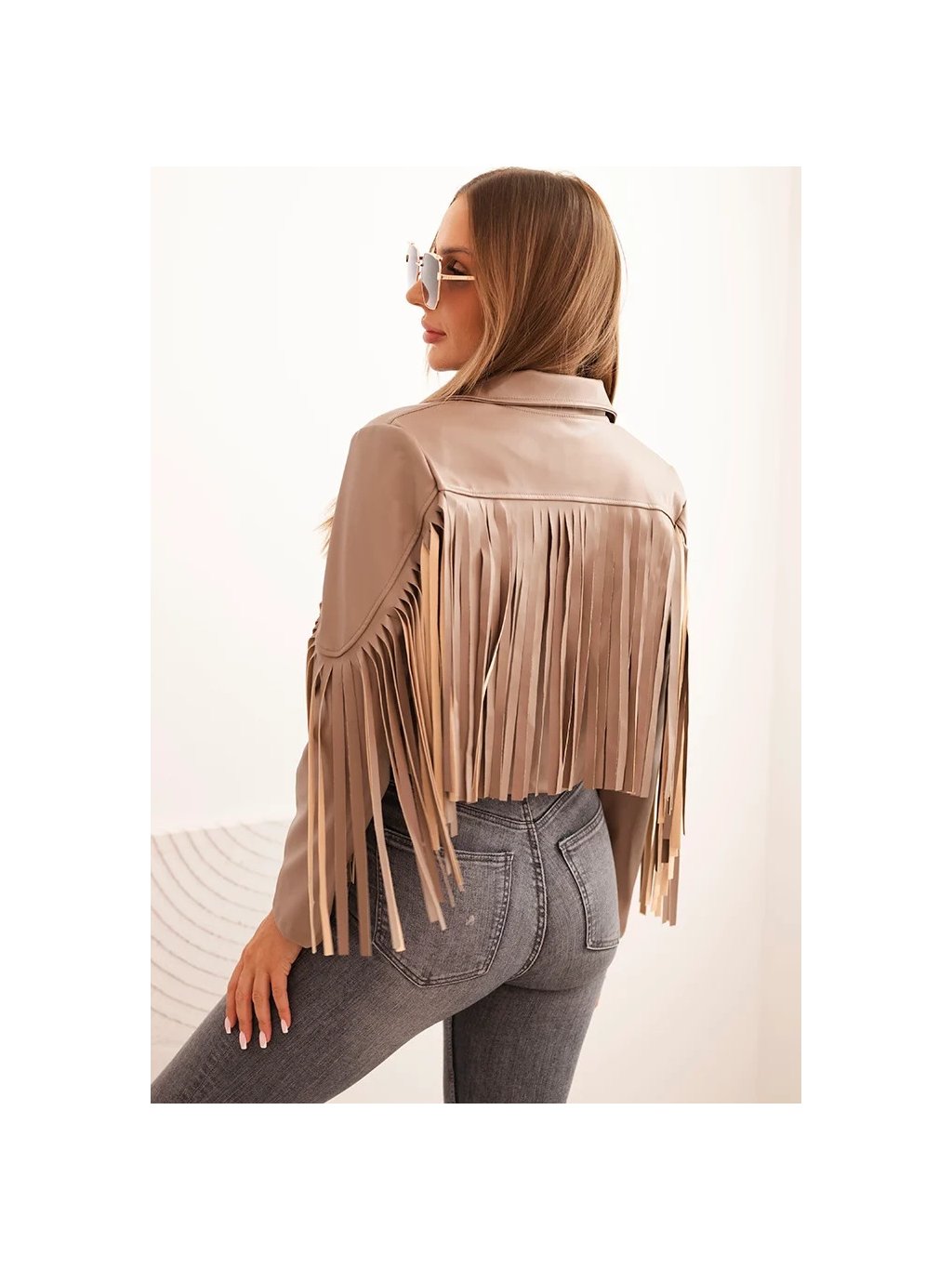 Béžová dámská koženková bunda s třásněmi