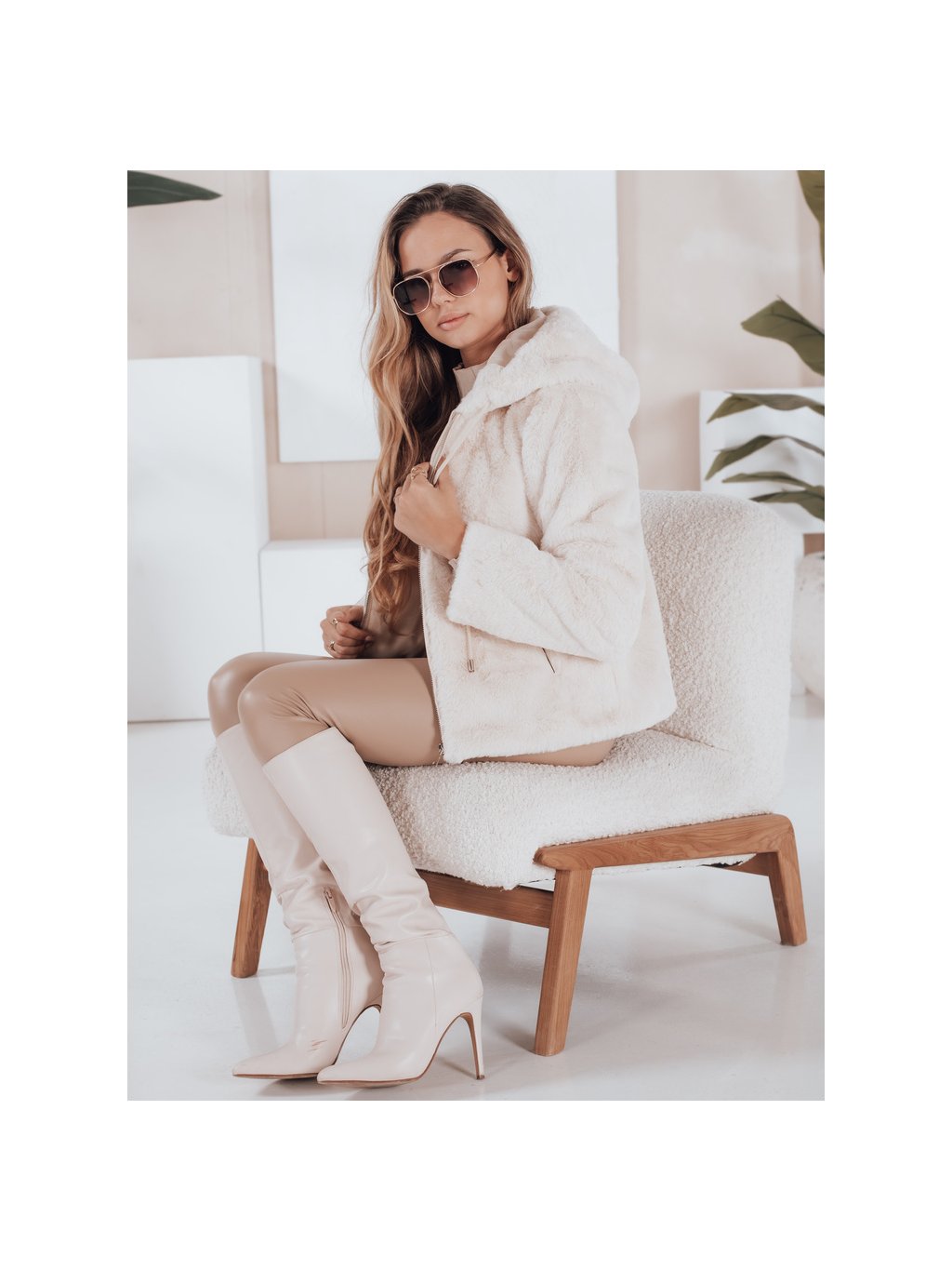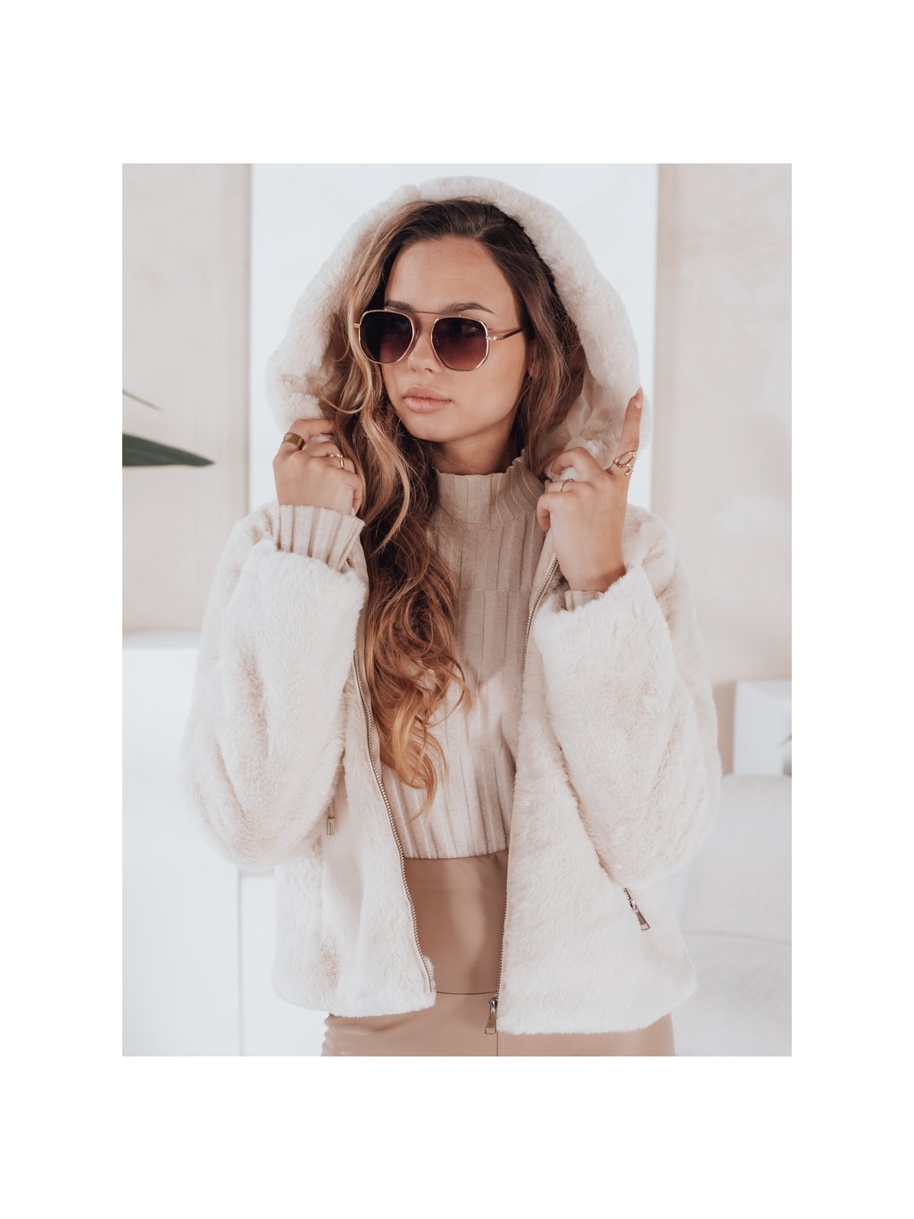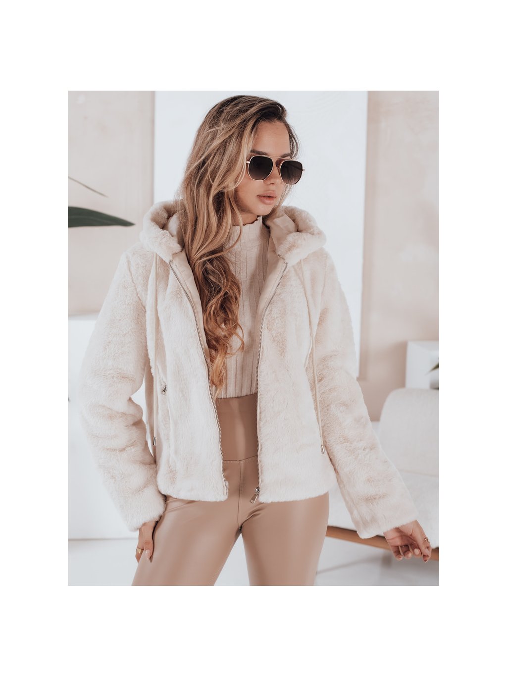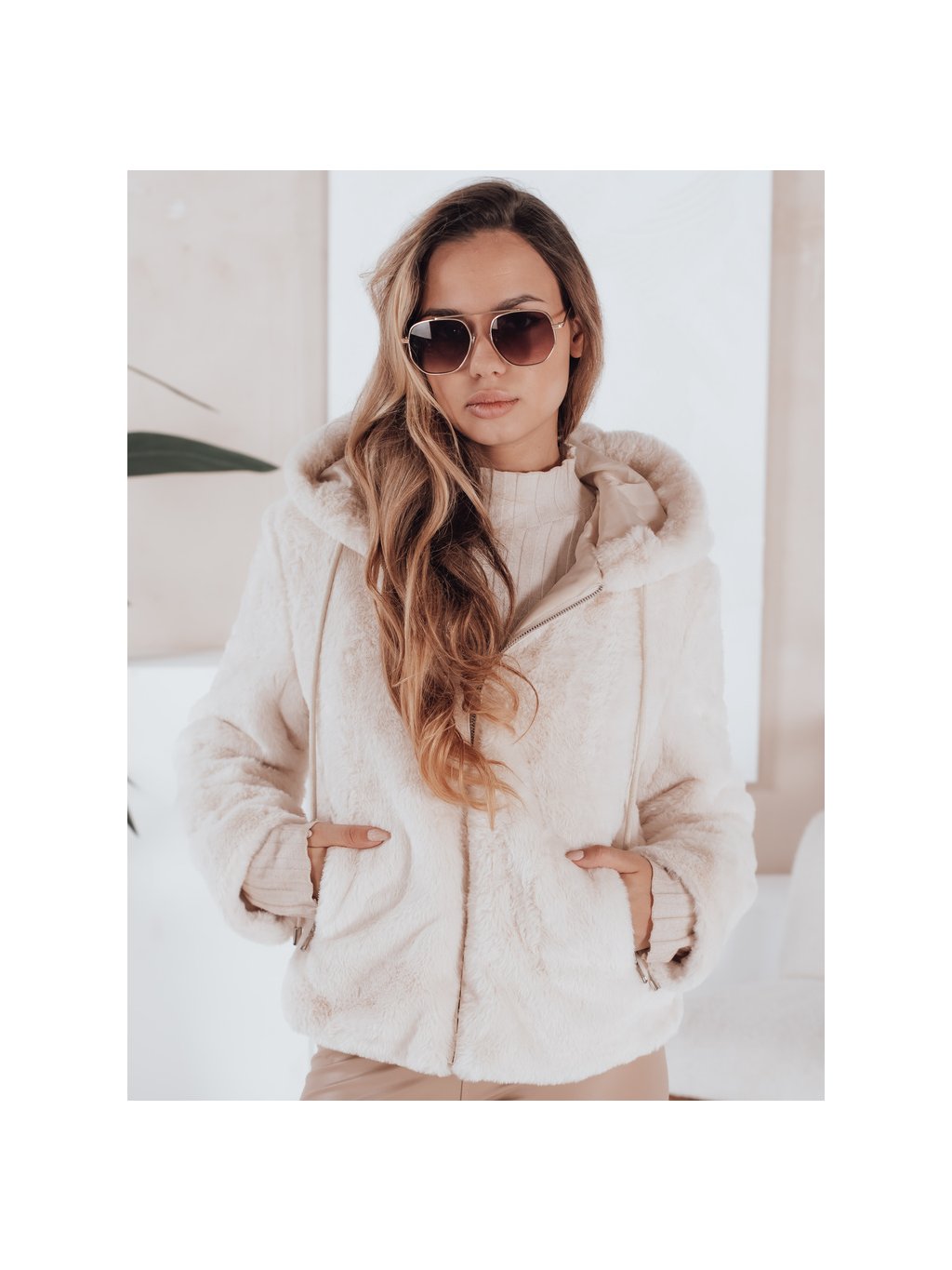 Béžová dámská kožíšková bunda ELMIRIS s kapsami