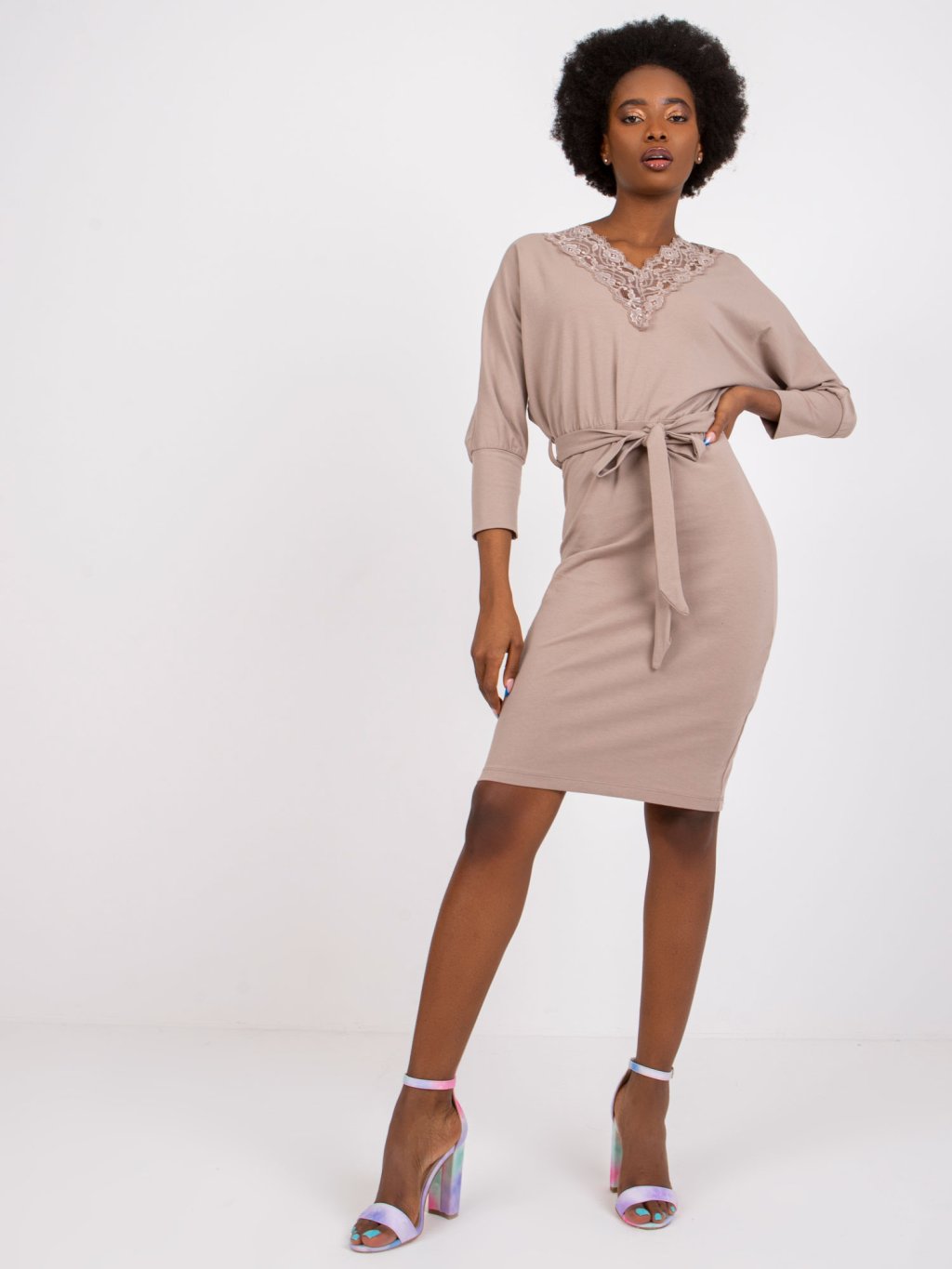 Béžové mini šaty Toronto s krajkovým výstřihem (Velikost S)