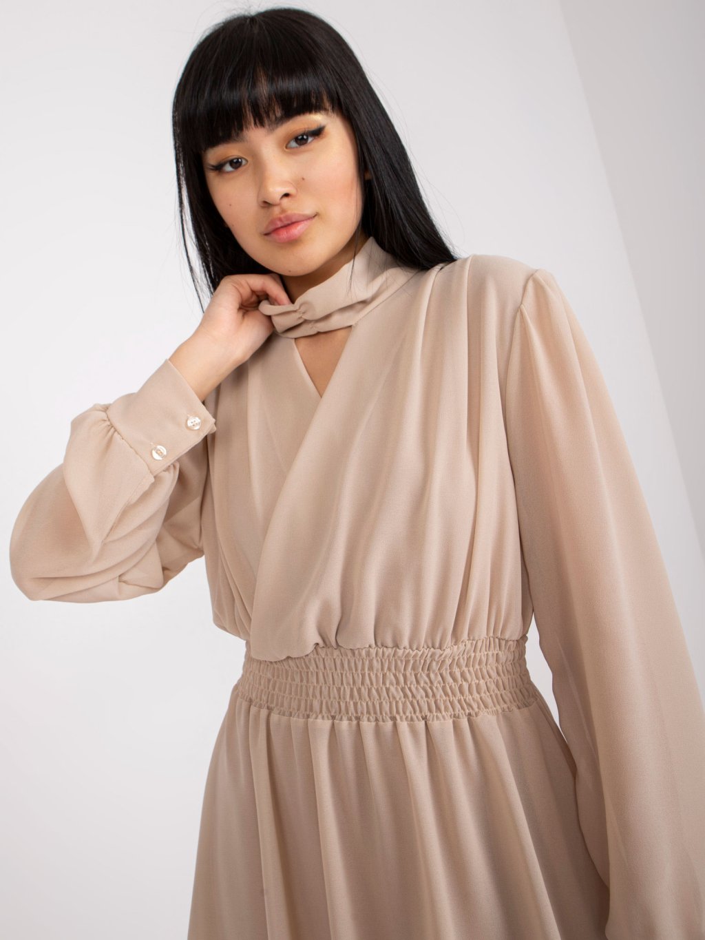 Béžové řasené mini šaty s dlouhými rukávy
