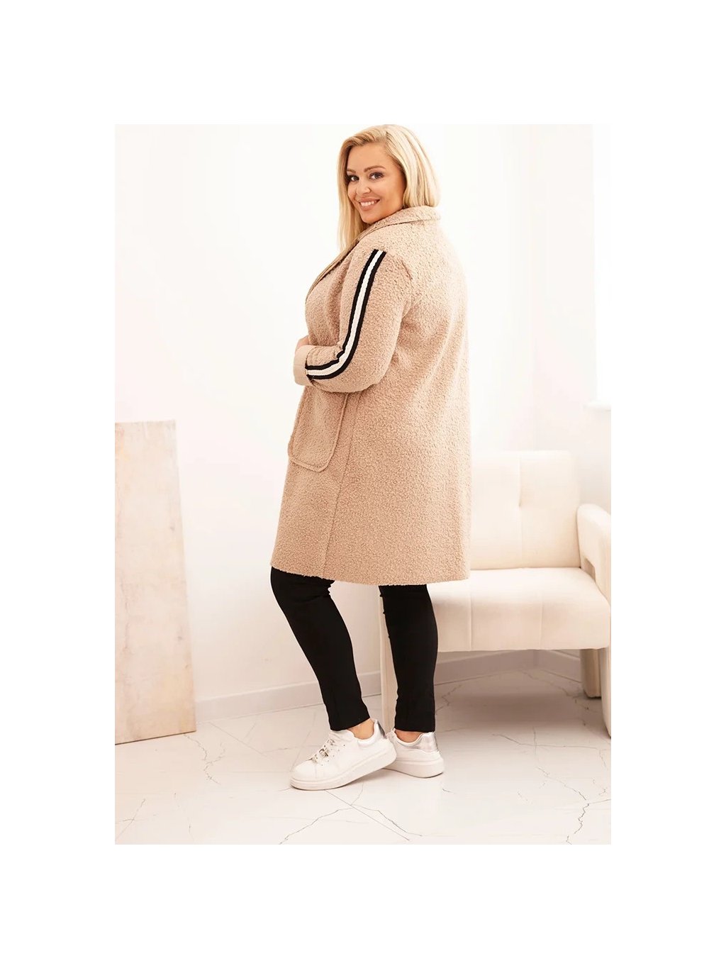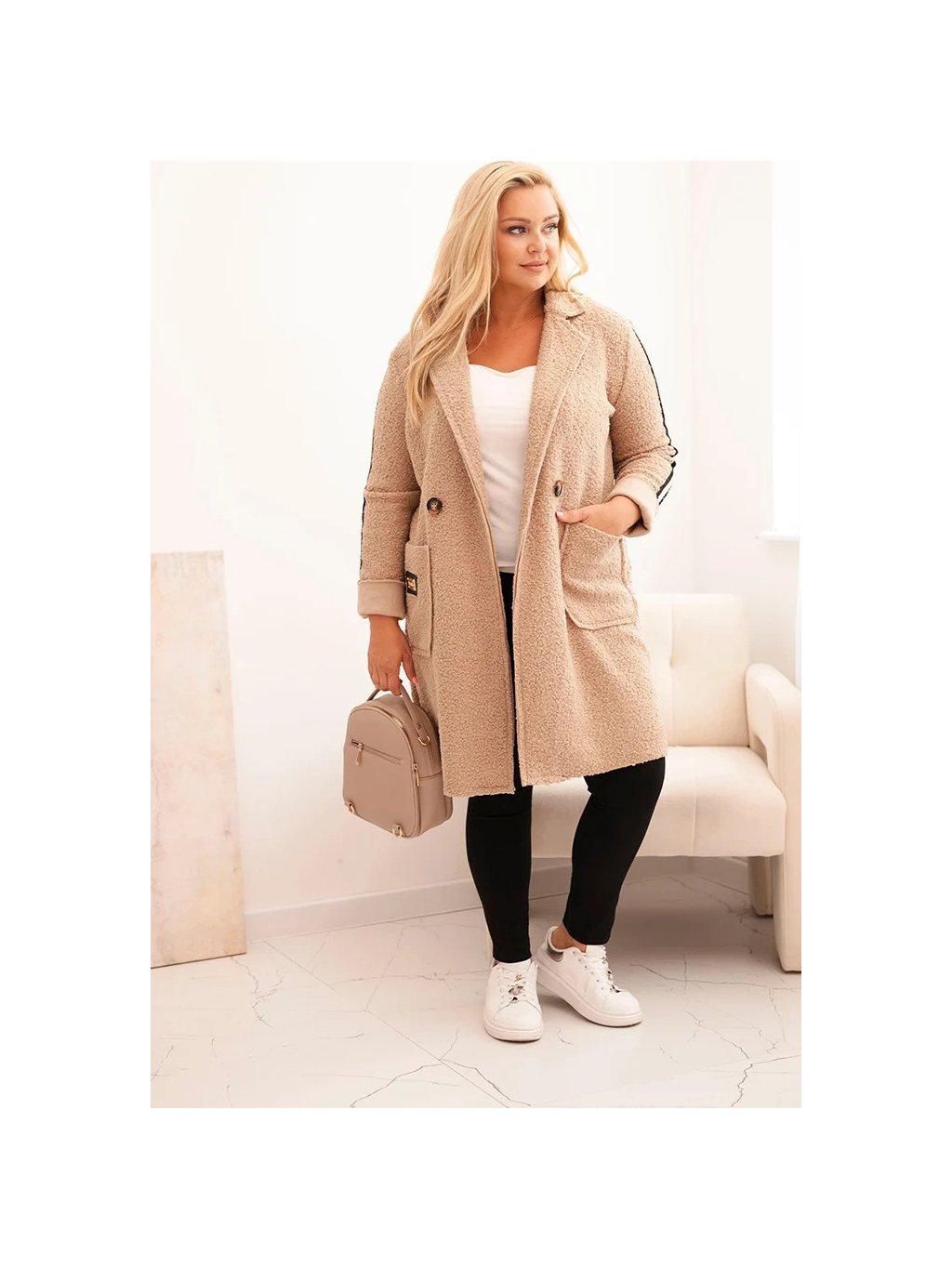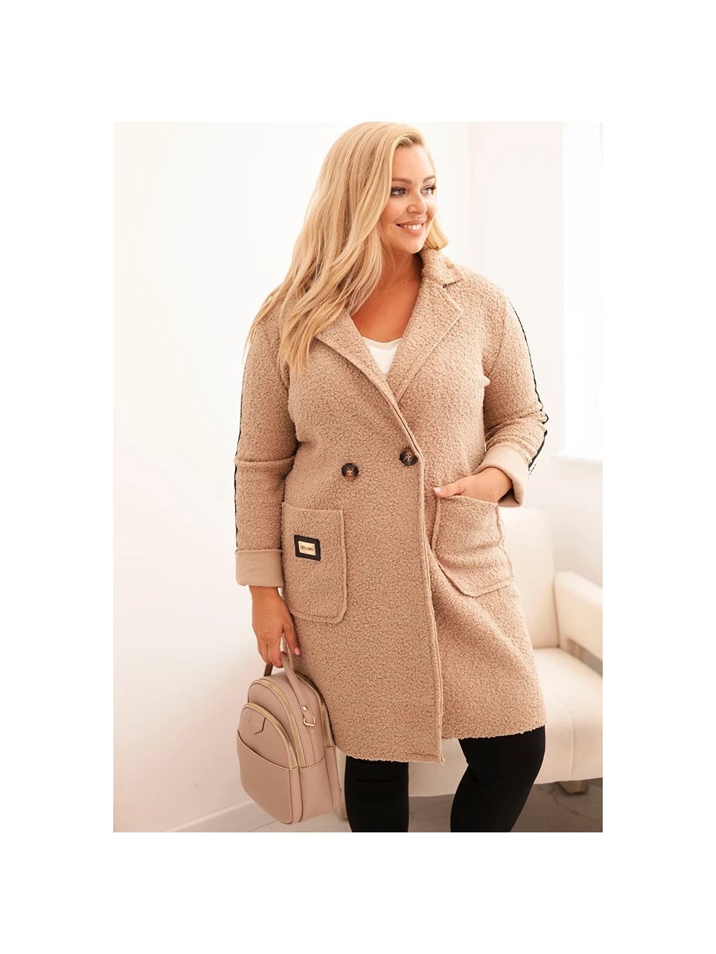 Béžový dámský plus size teddy kabát s kapsami
