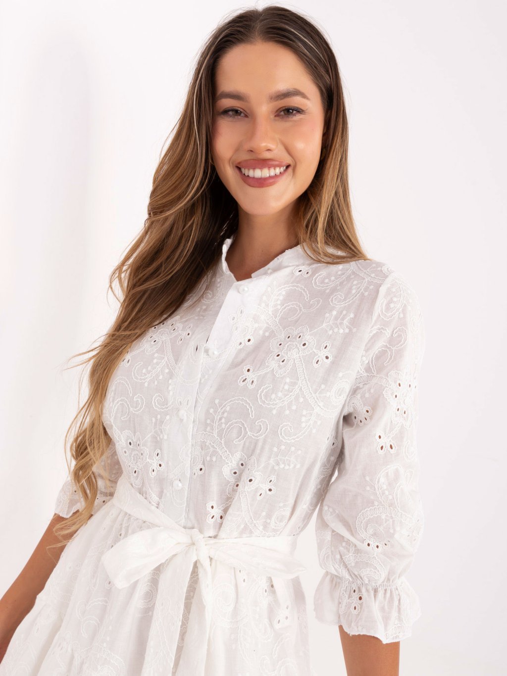 Bílé dámské mini šaty s páskem a vyšívanými vzory