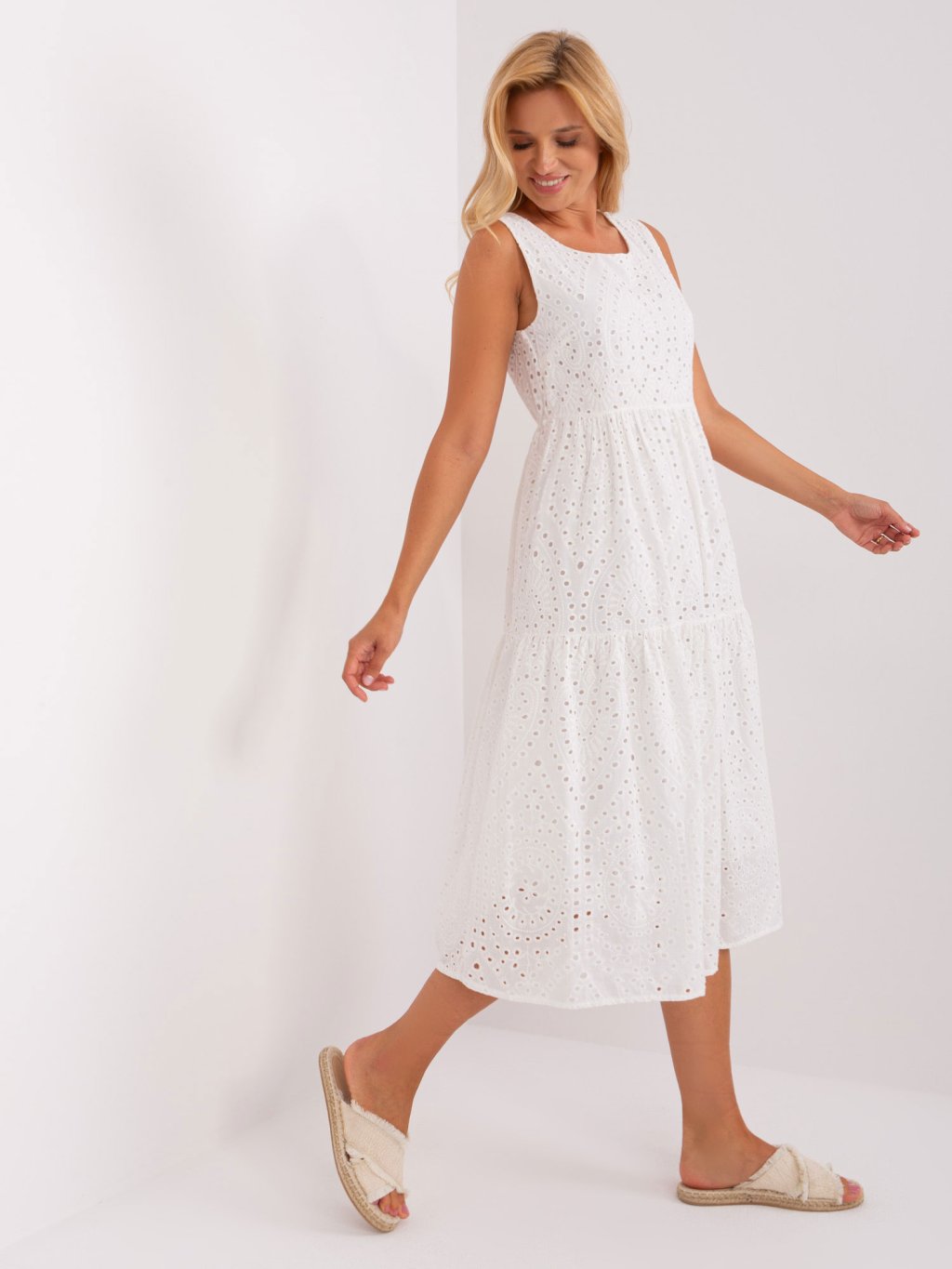 Bílé madeirové volánové midi šaty