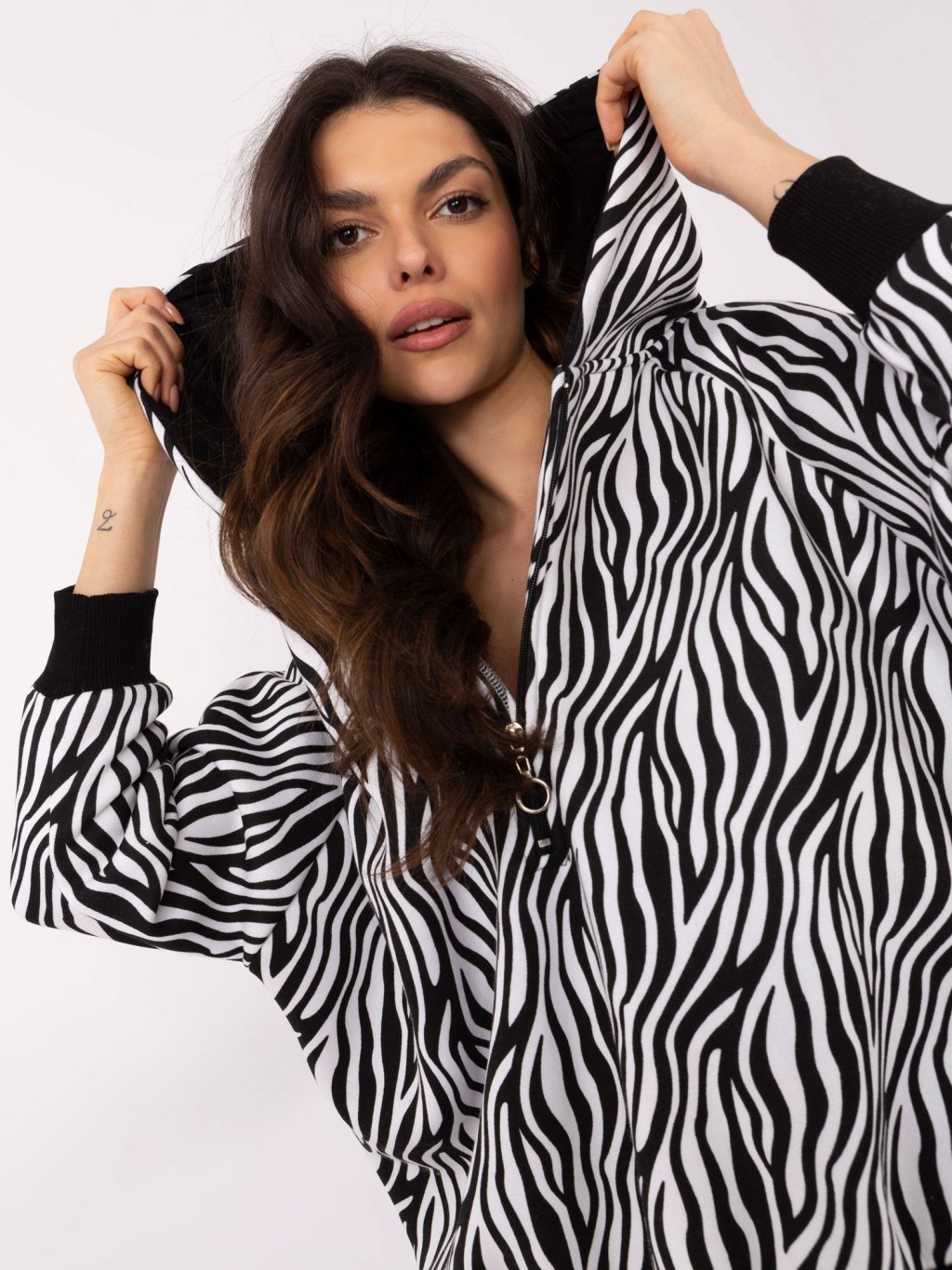 Modelka na obrázcích je vysoká 173 cm, obvod přes prsa má 85 cm, obvod pasu 62 cm a boky 95 cm.