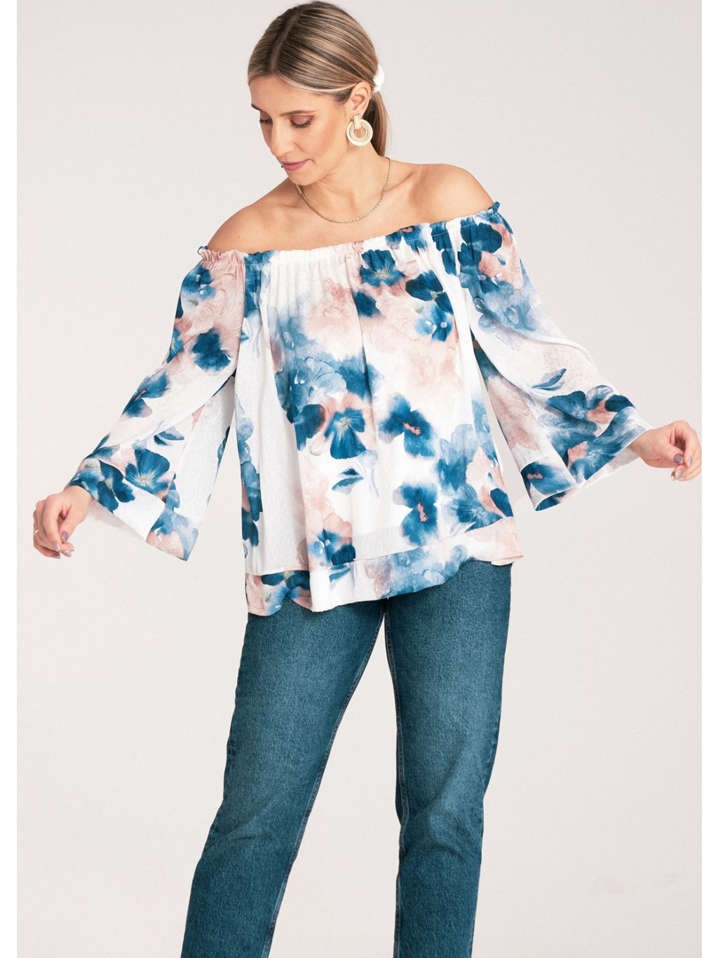 Bílo-modrá dámská španělská halenka s širokým výstřihem