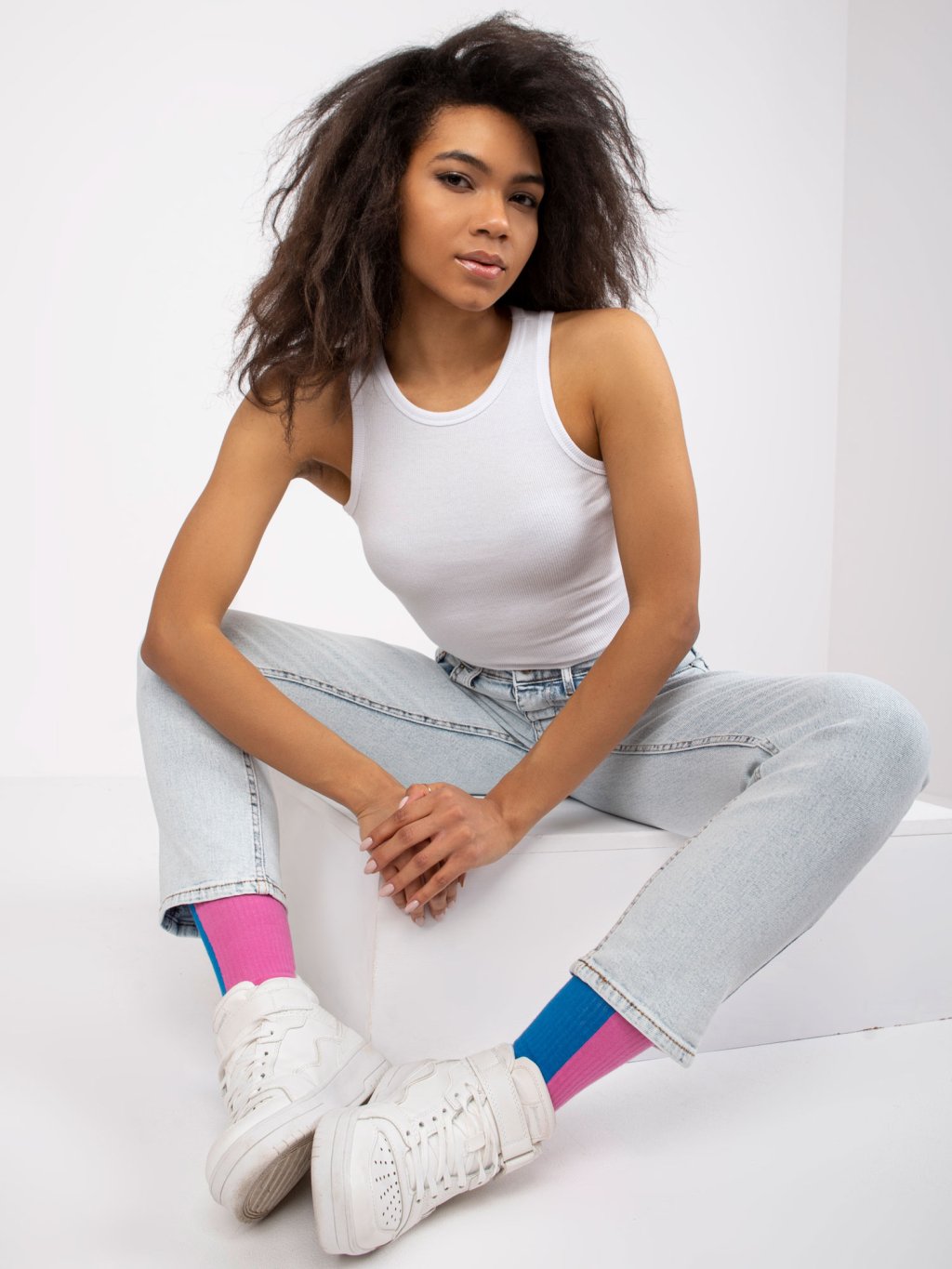 Modelka na obrázcích je vysoká 167 cm, obvod přes prsa má 82 cm, obvod pasu 59 cm a přes boky 83 cm.