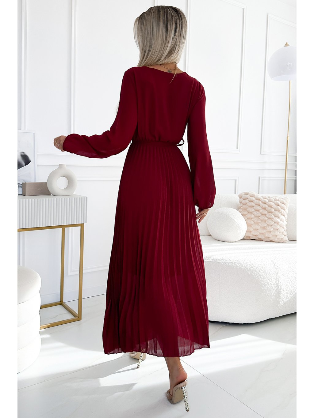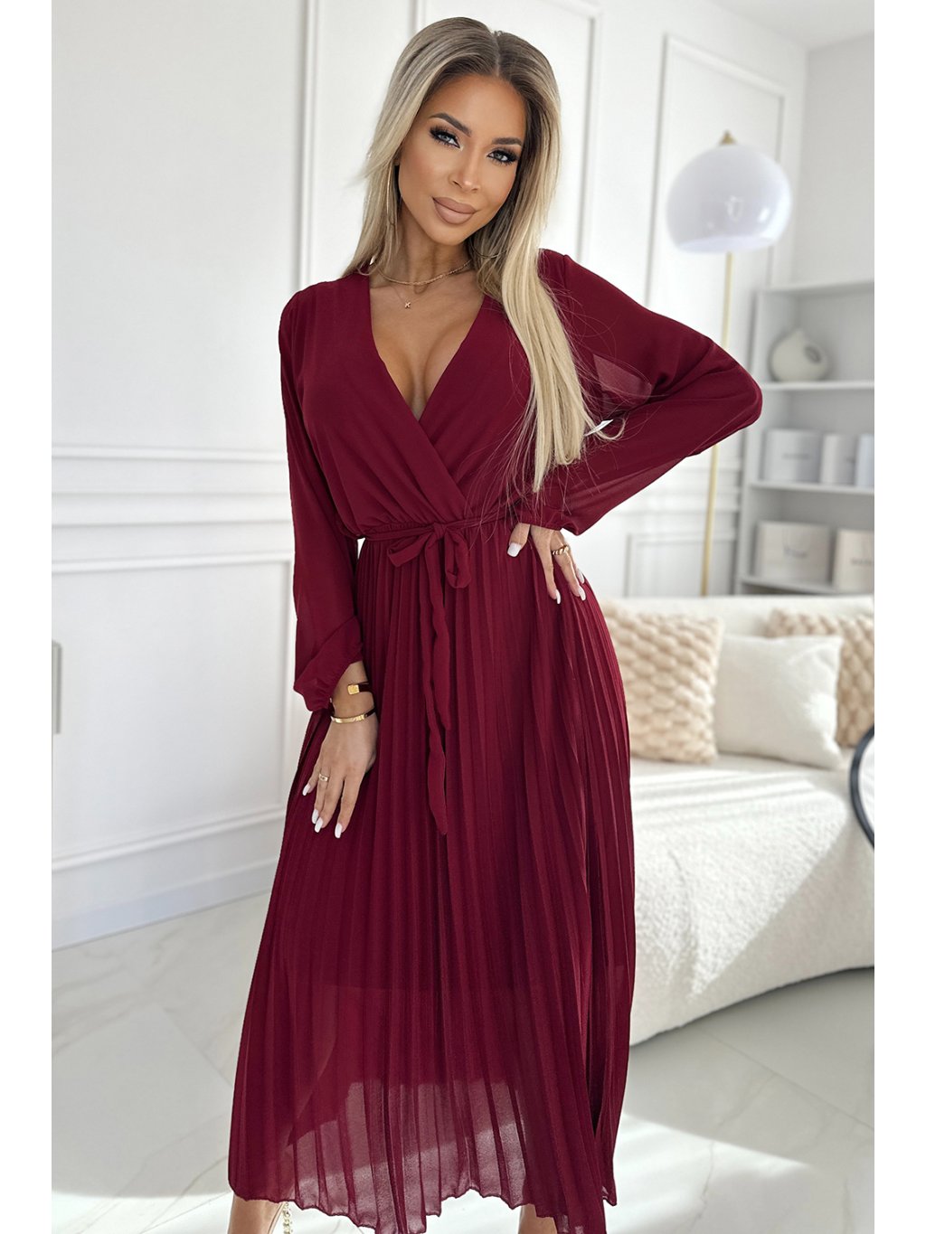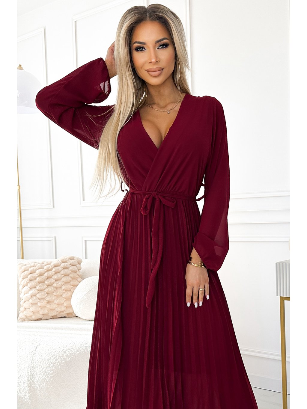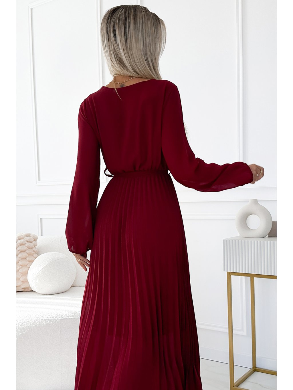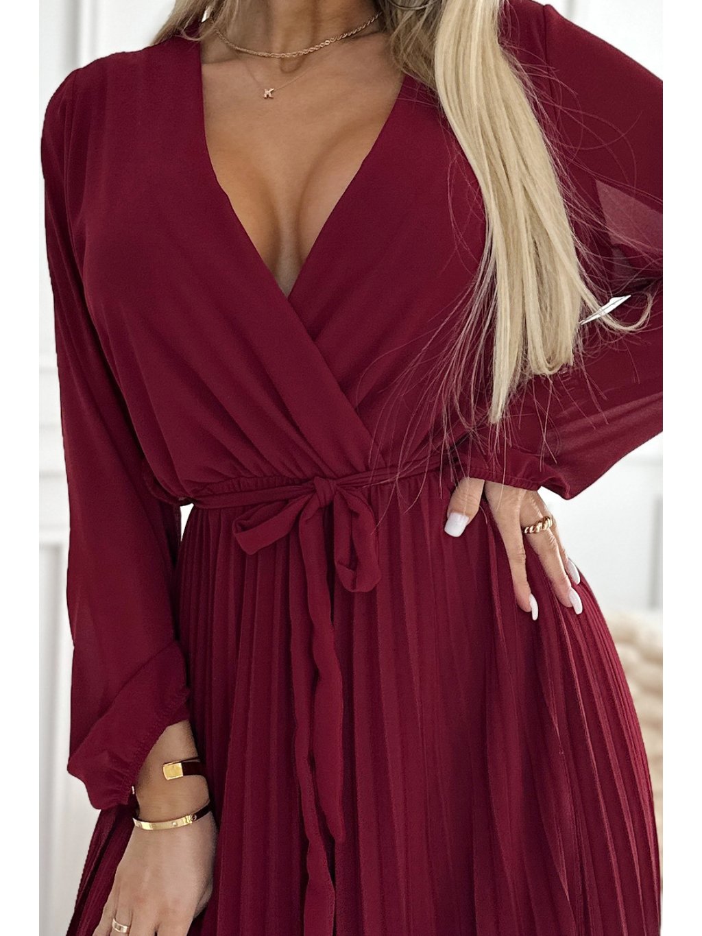Bordó plisované šaty s dlouhým šifónovým rukávem