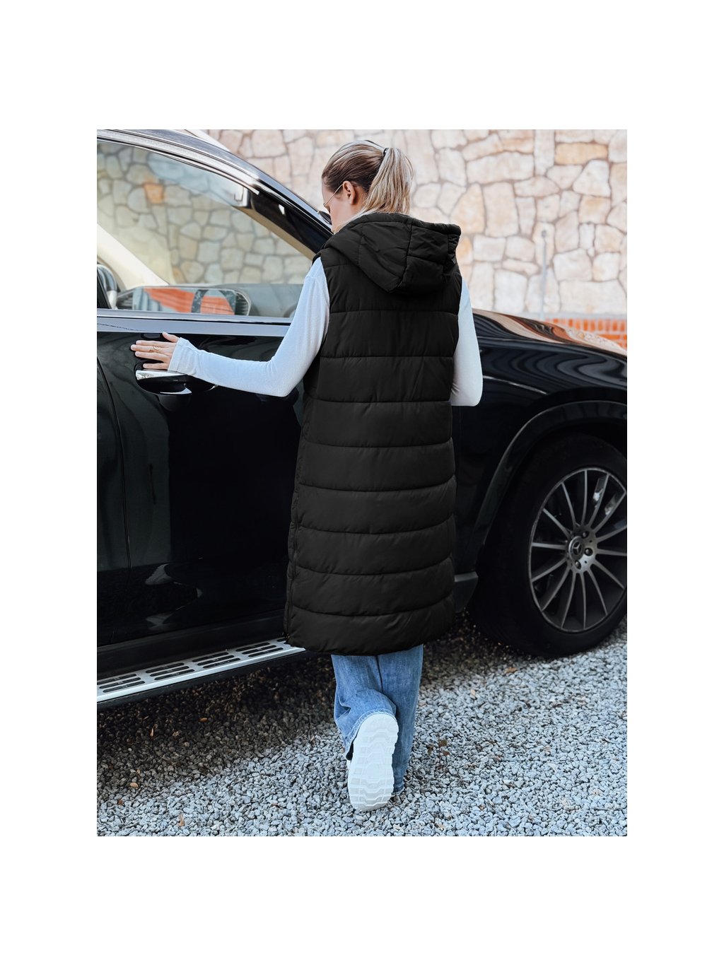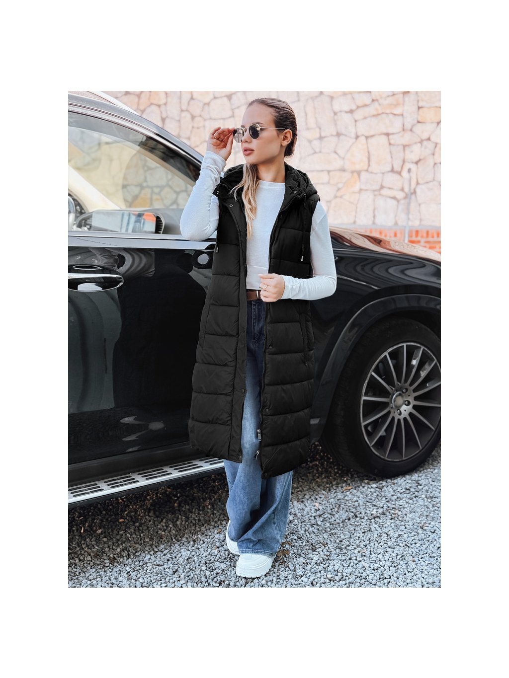 Černá dámská dlouhá prošívaná vesta s kapucí