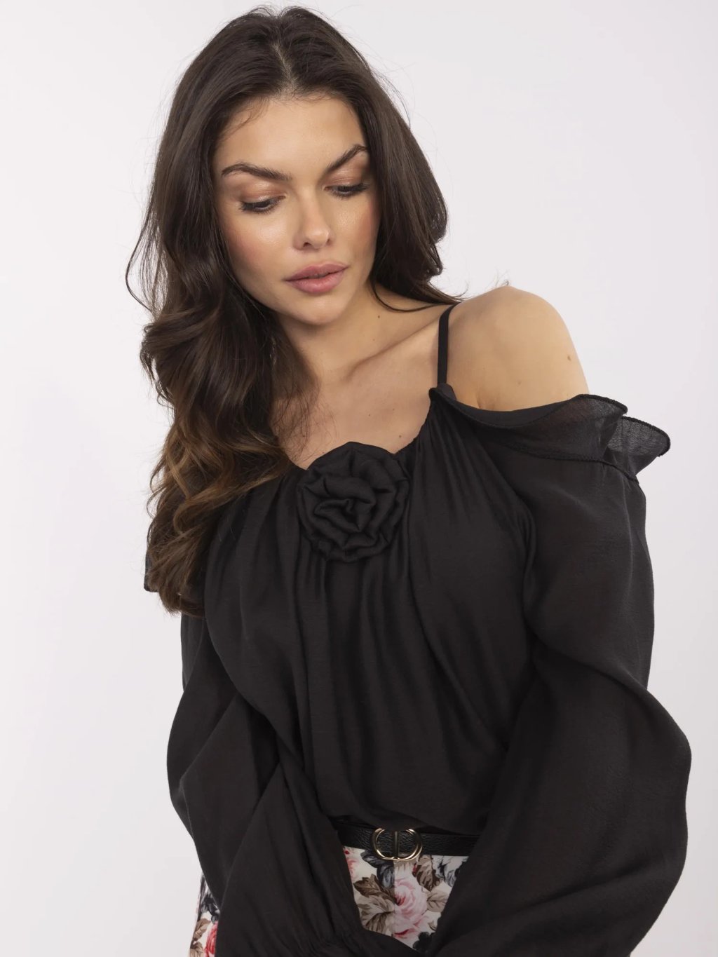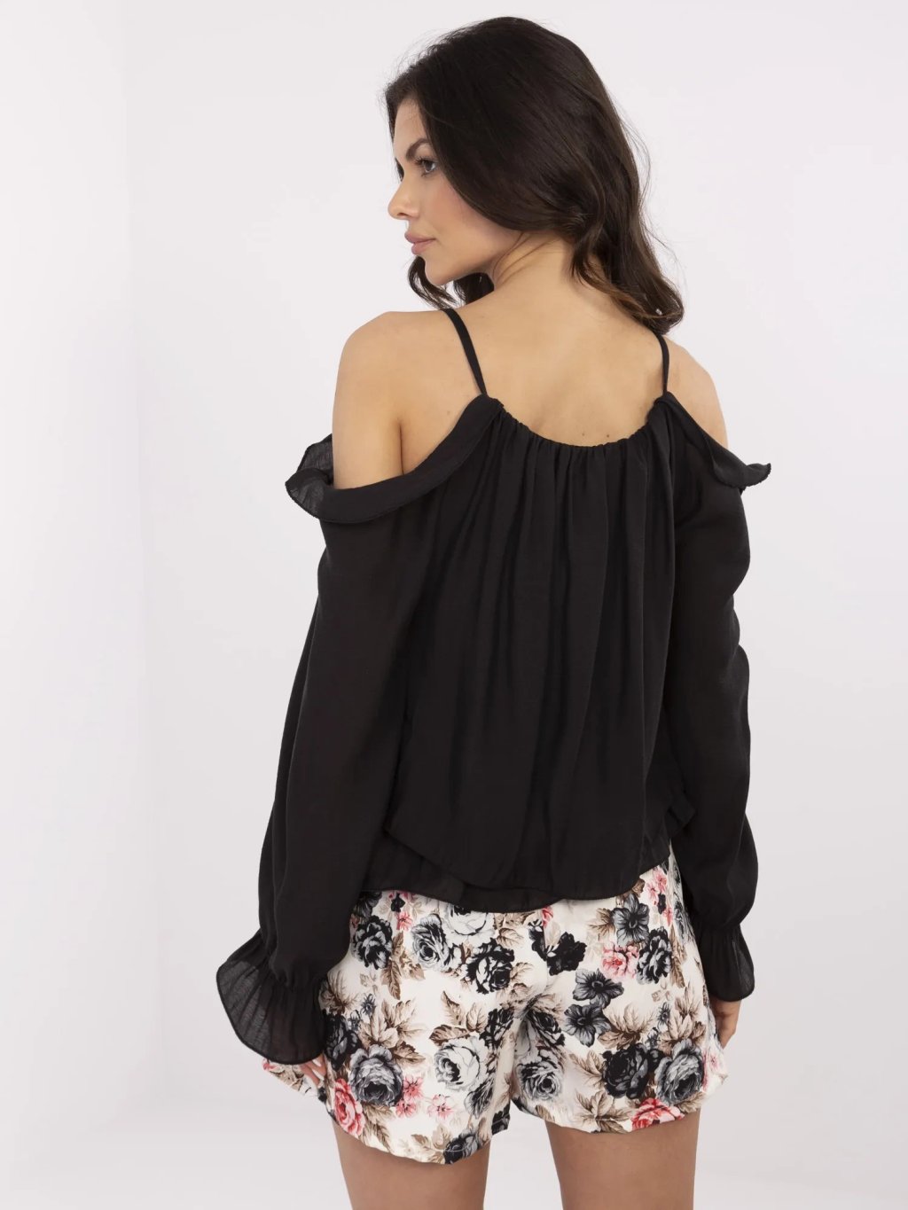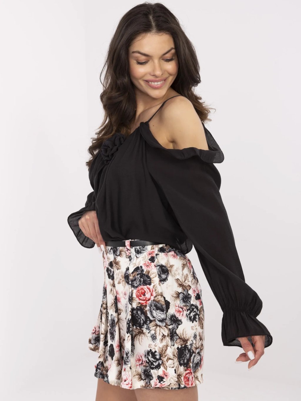Modelka na obrázcích je vysoká 173 cm, obvod přes prsa 89 cm, obvod pasu 65 cm a boky 91 cm.