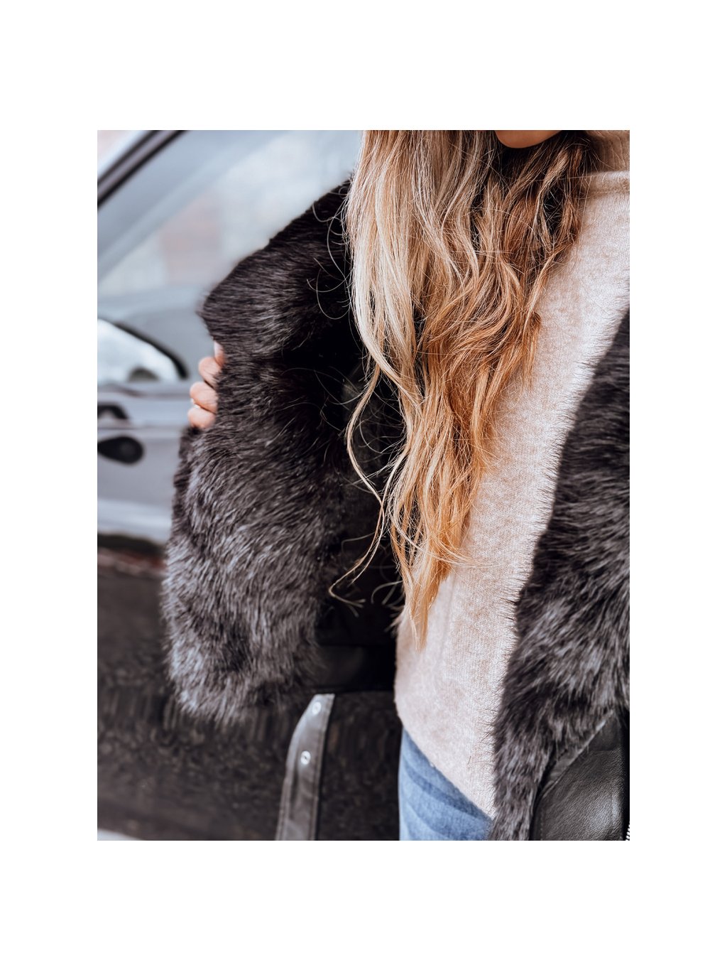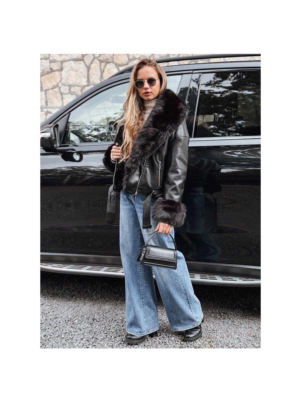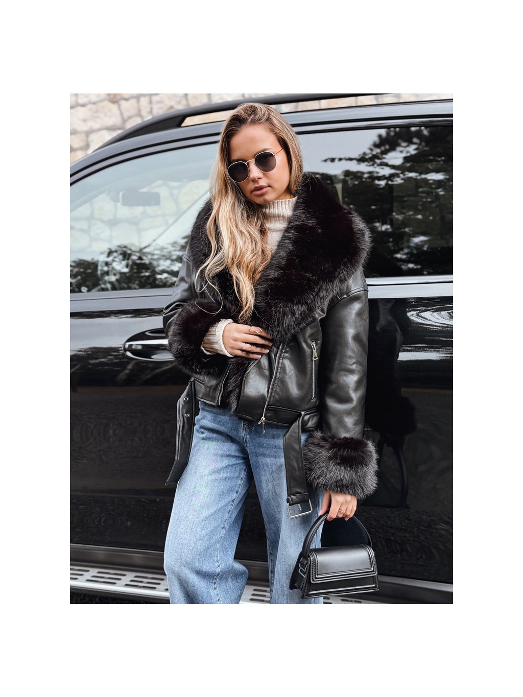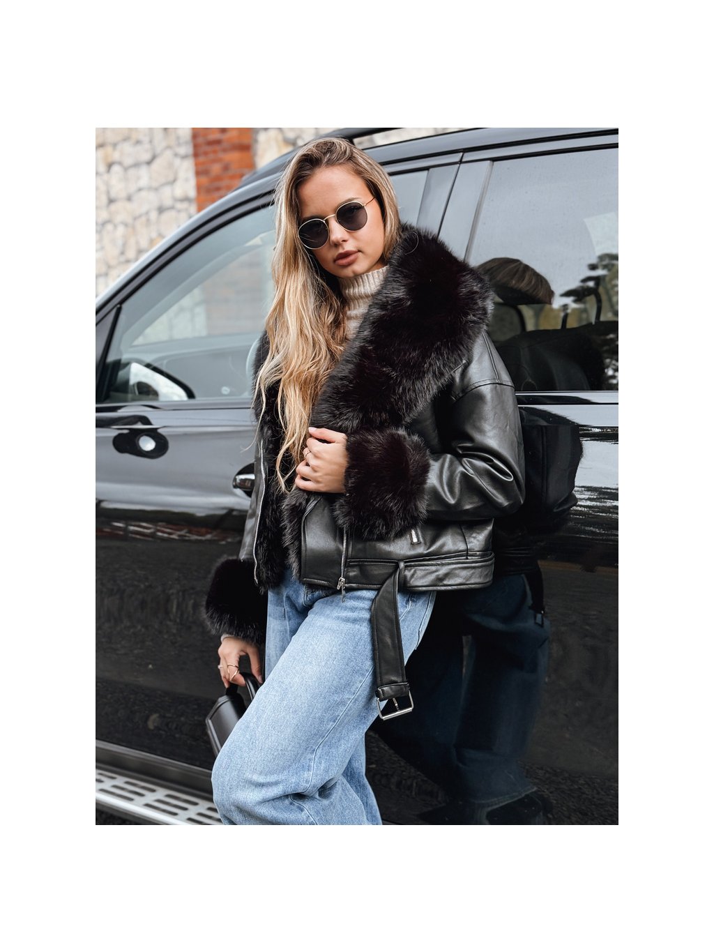 Černá dámská koženková bunda s černou kožešinou