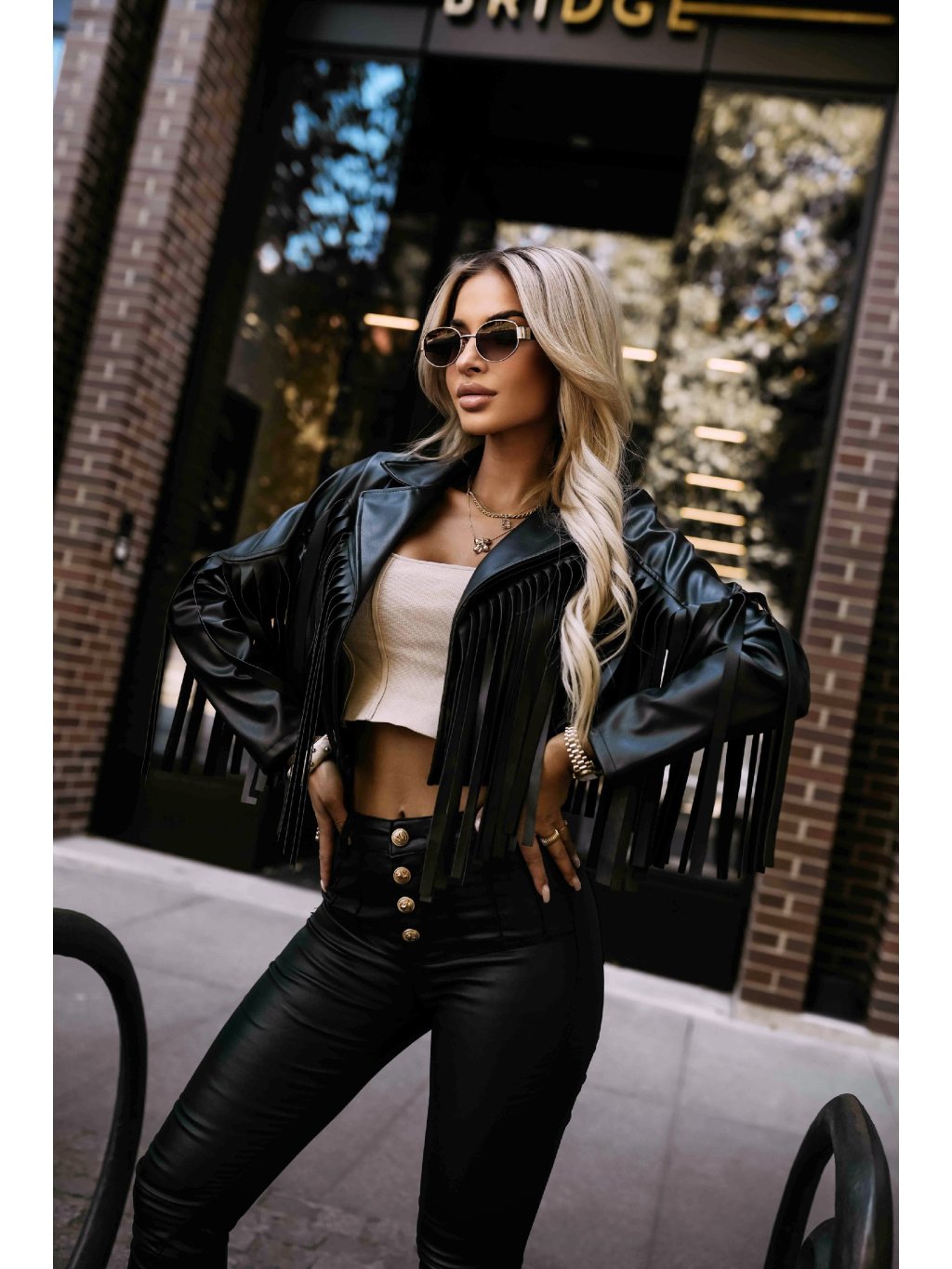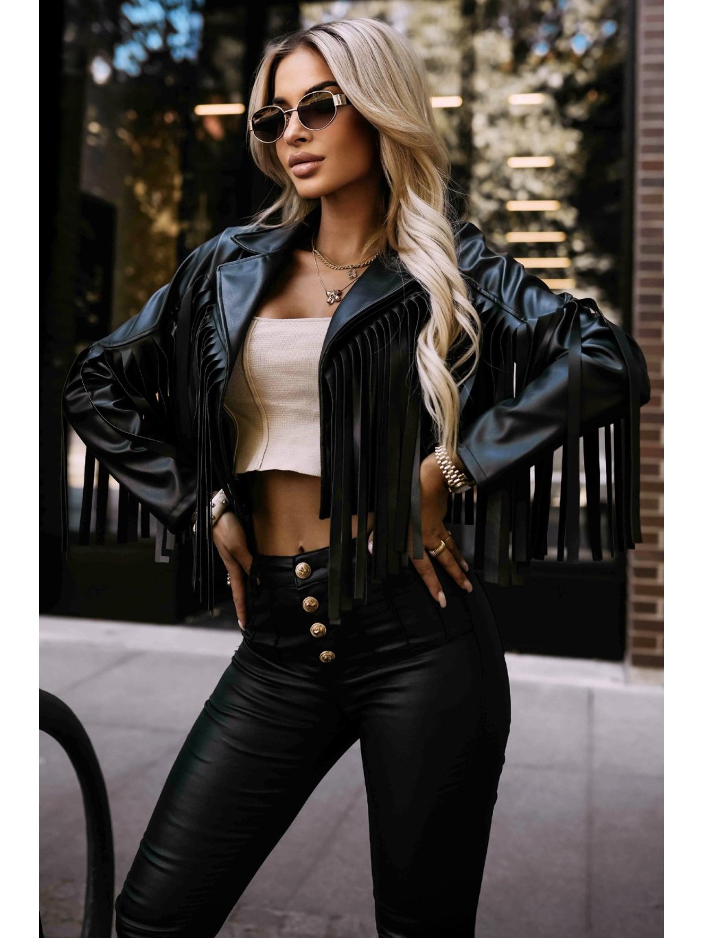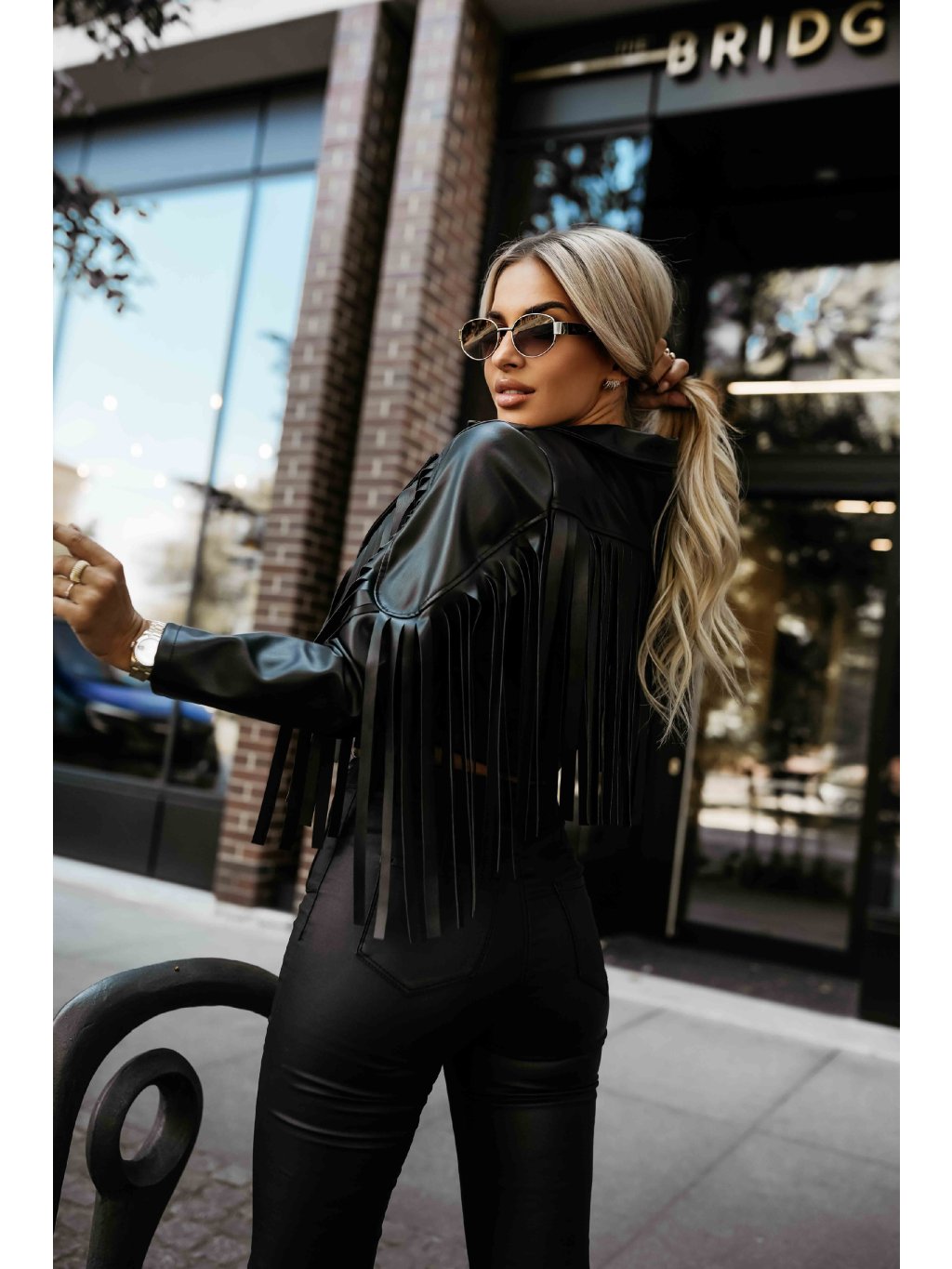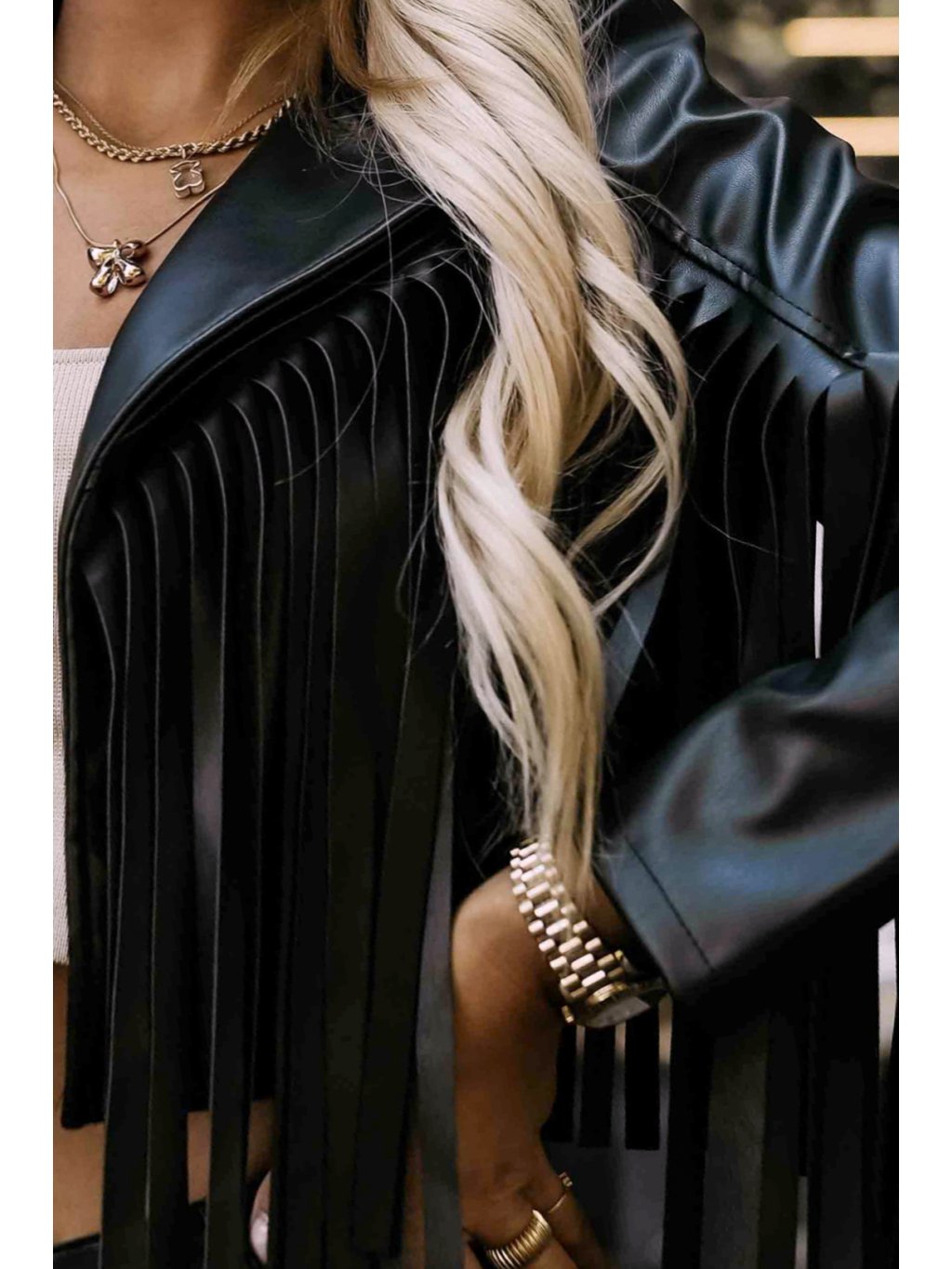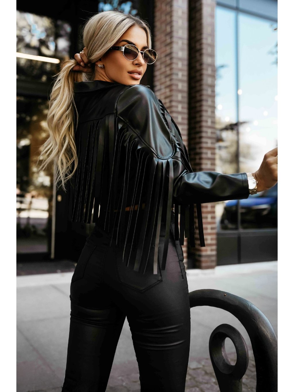 Černá dámská krátká koženková bunda s třásněmi