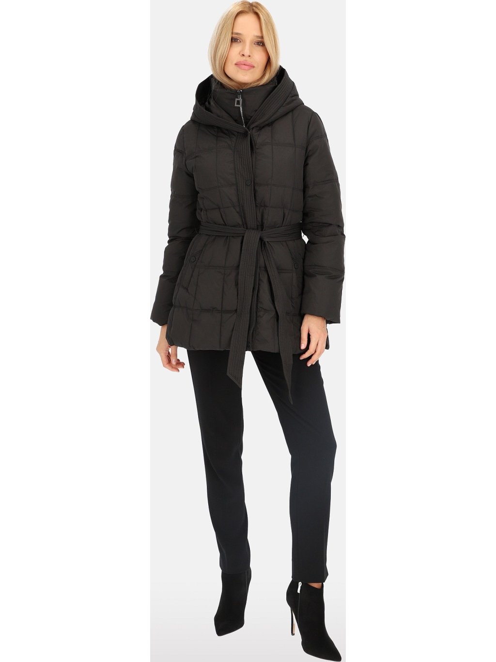 Černá dámská krátká péřová bunda s kapucí a zavazováním