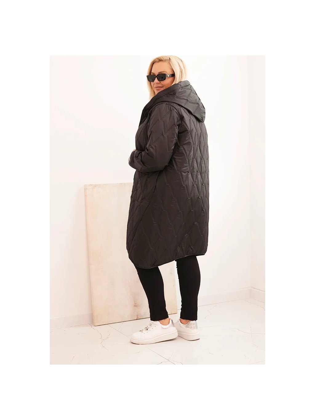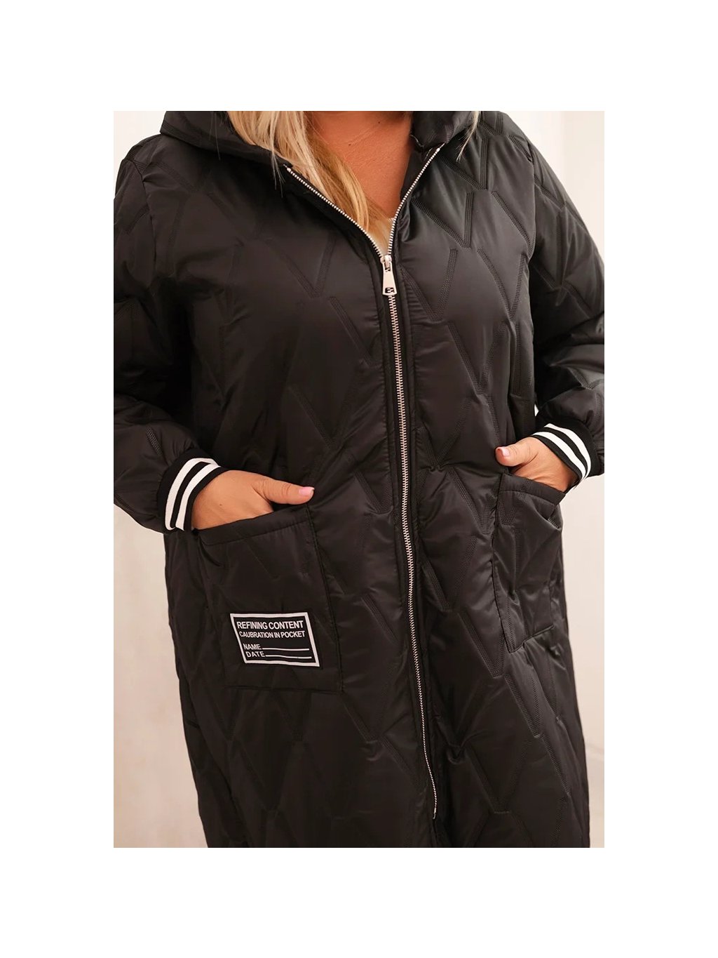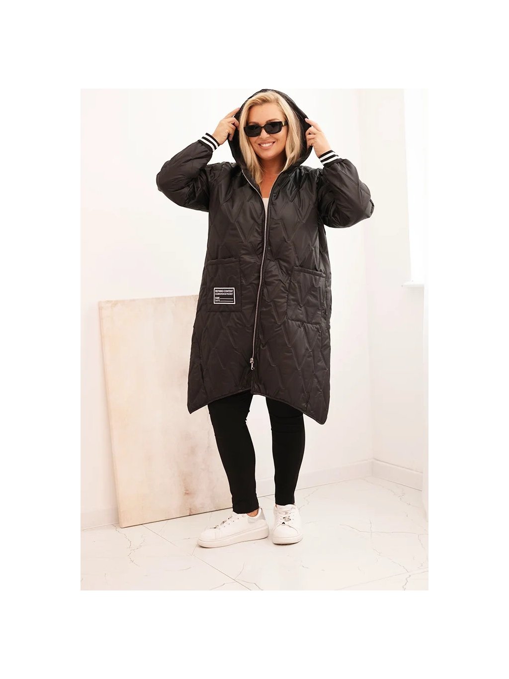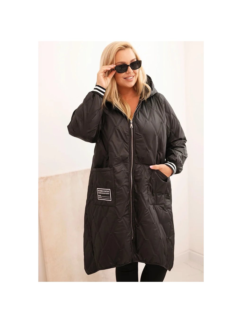 Černá dámská plus size prošívaná bunda s kapucí a manžetami