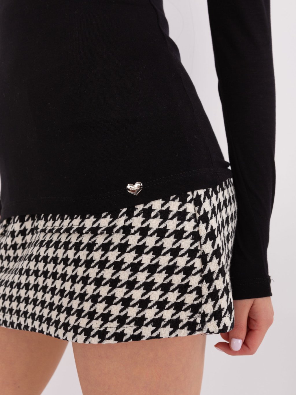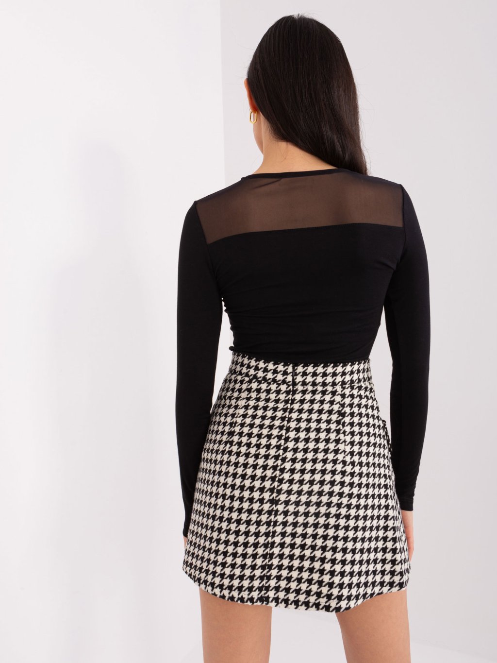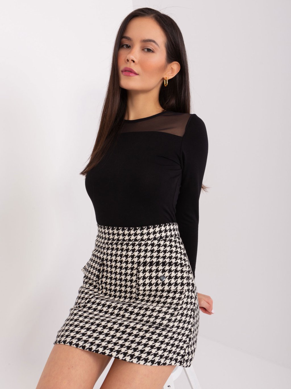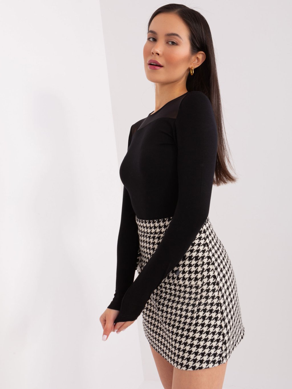 Modelka na obrázcích je vysoká 168 cm, obvod přes prsa 81 cm, obvod pasu 62 cm a boky 90 cm.