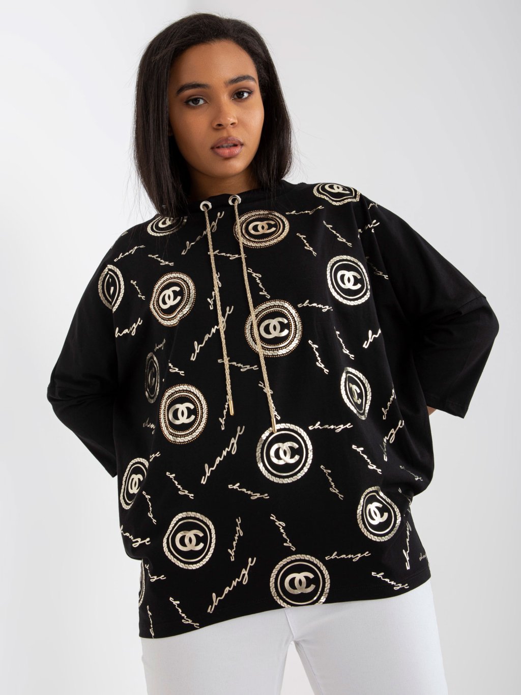 Modelka na obrázcích je vysoká 170 cm, obvod přes prsa 108 cm, obvod pasu 86 cm a boky 120 cm.