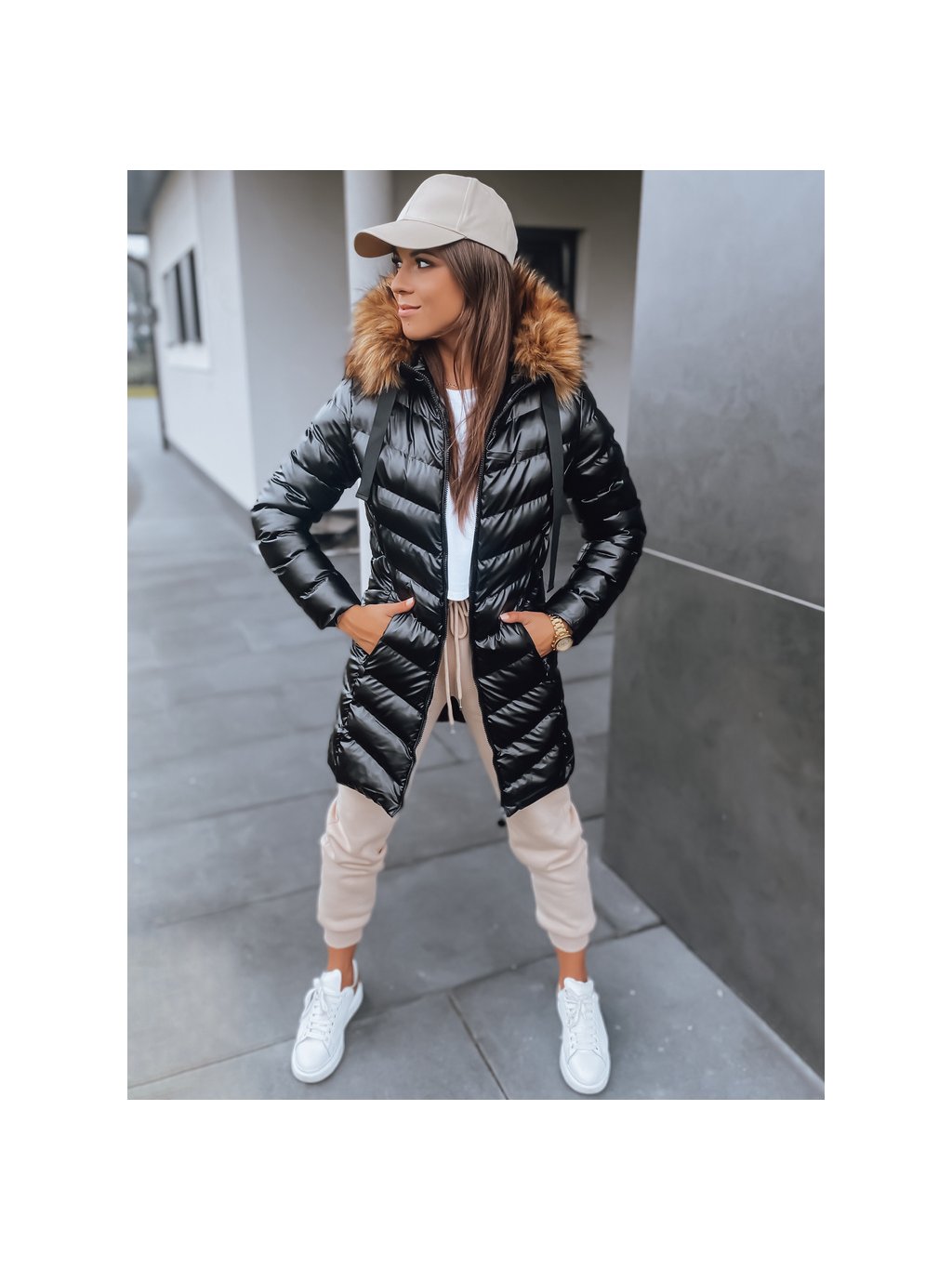 Černá lesklá bunda s kožešinovou kapucí JASMIN