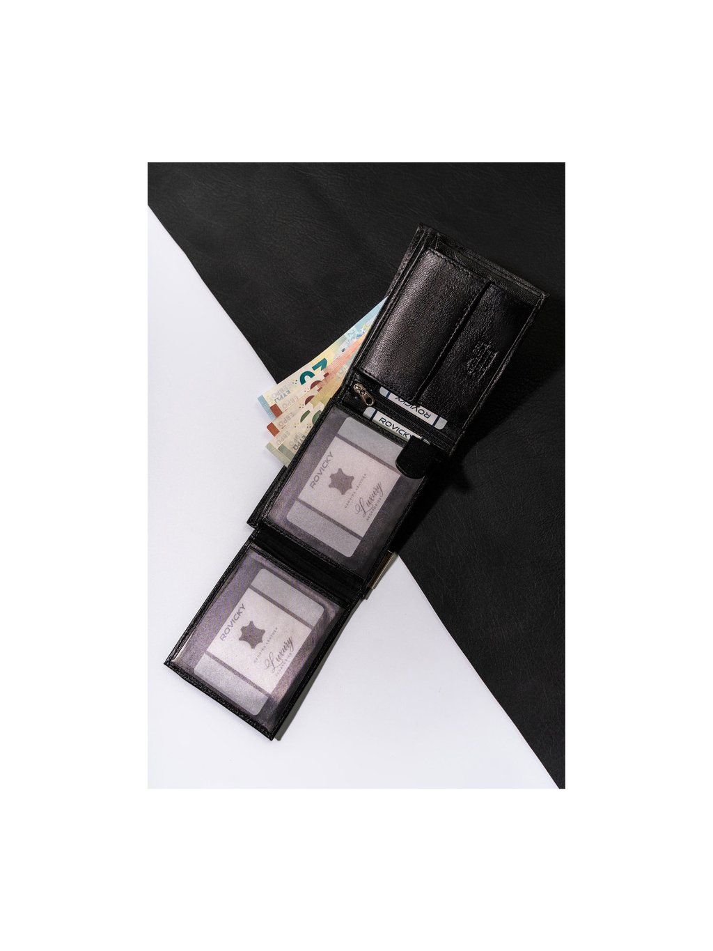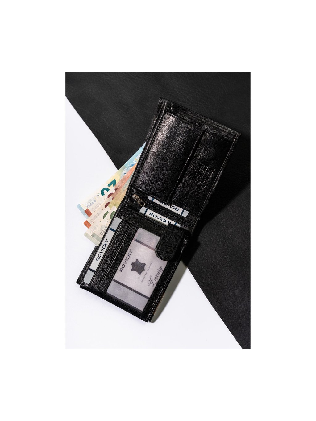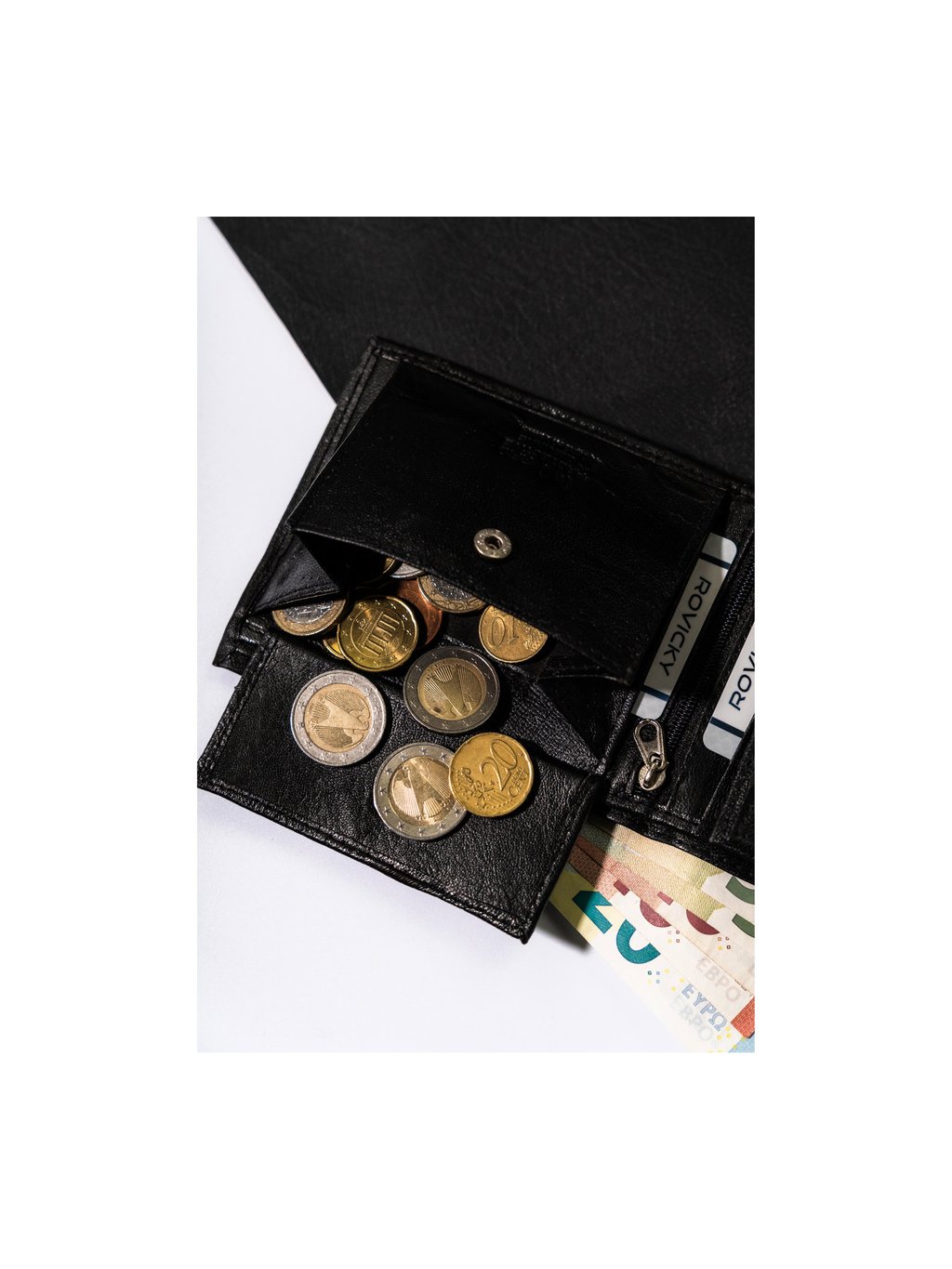 - 1 přihrádka na zip, všitá ve střední části peněženky