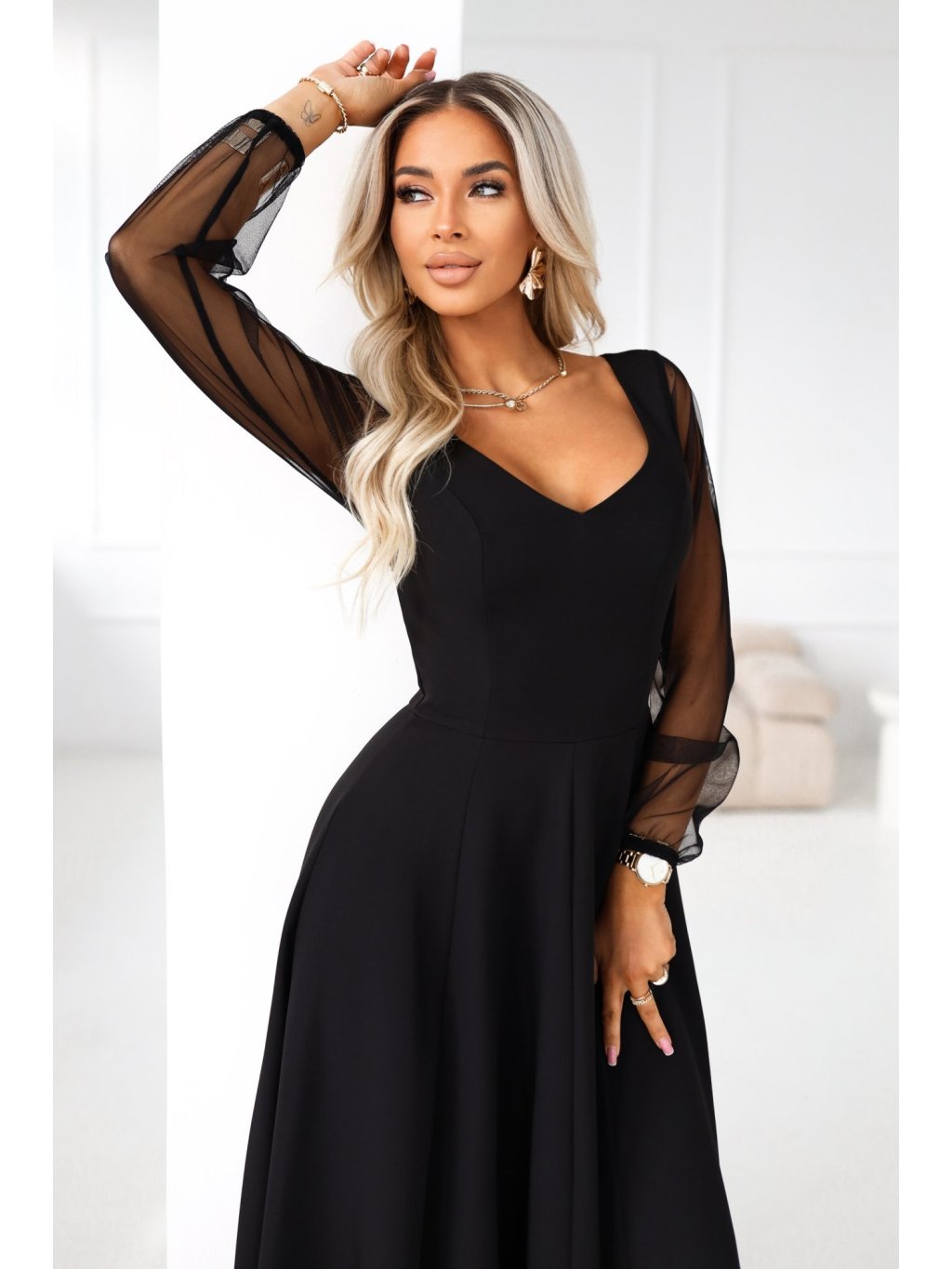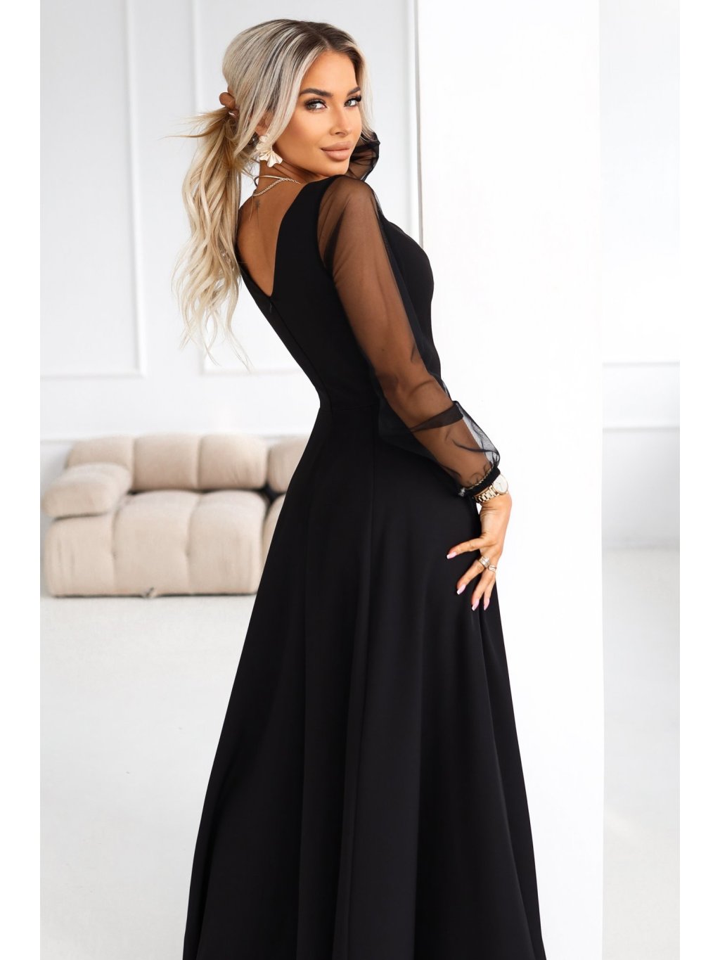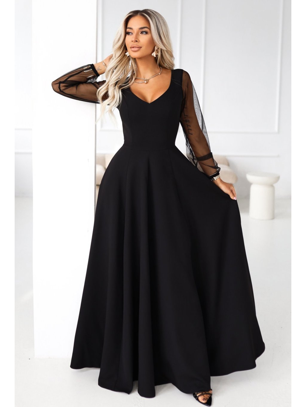 Černé dlouhé šaty s tylovými rukávy