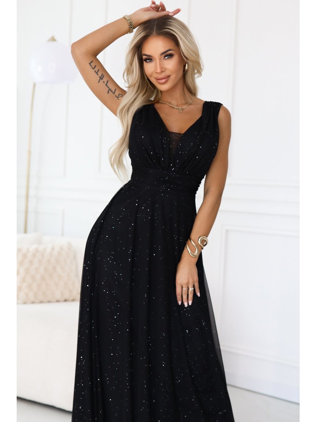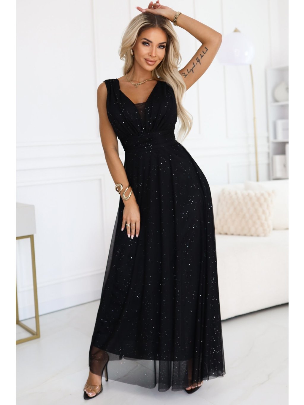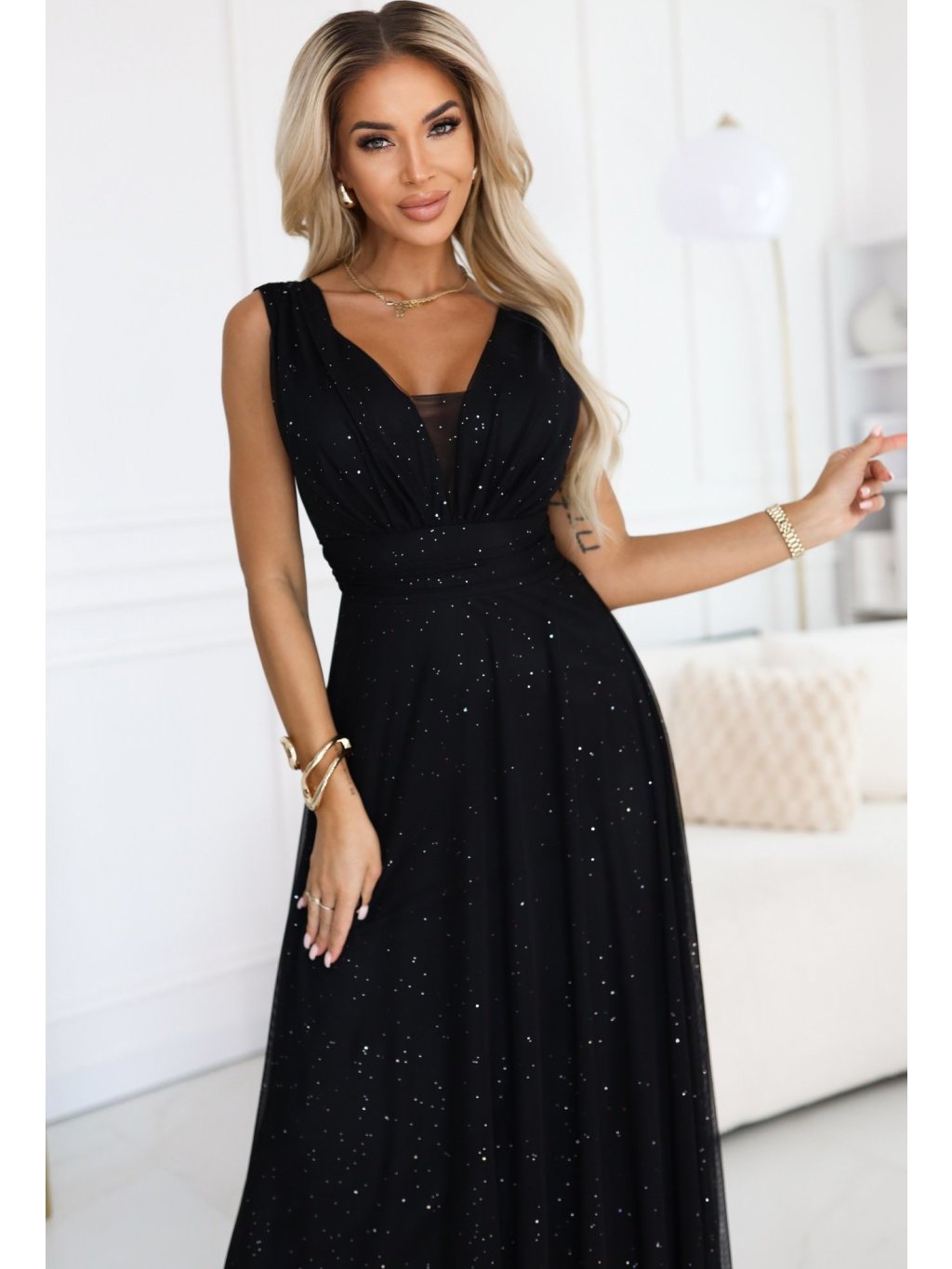 Černé dlouhé večerní třpytivé šaty s hlubokým výstřihem