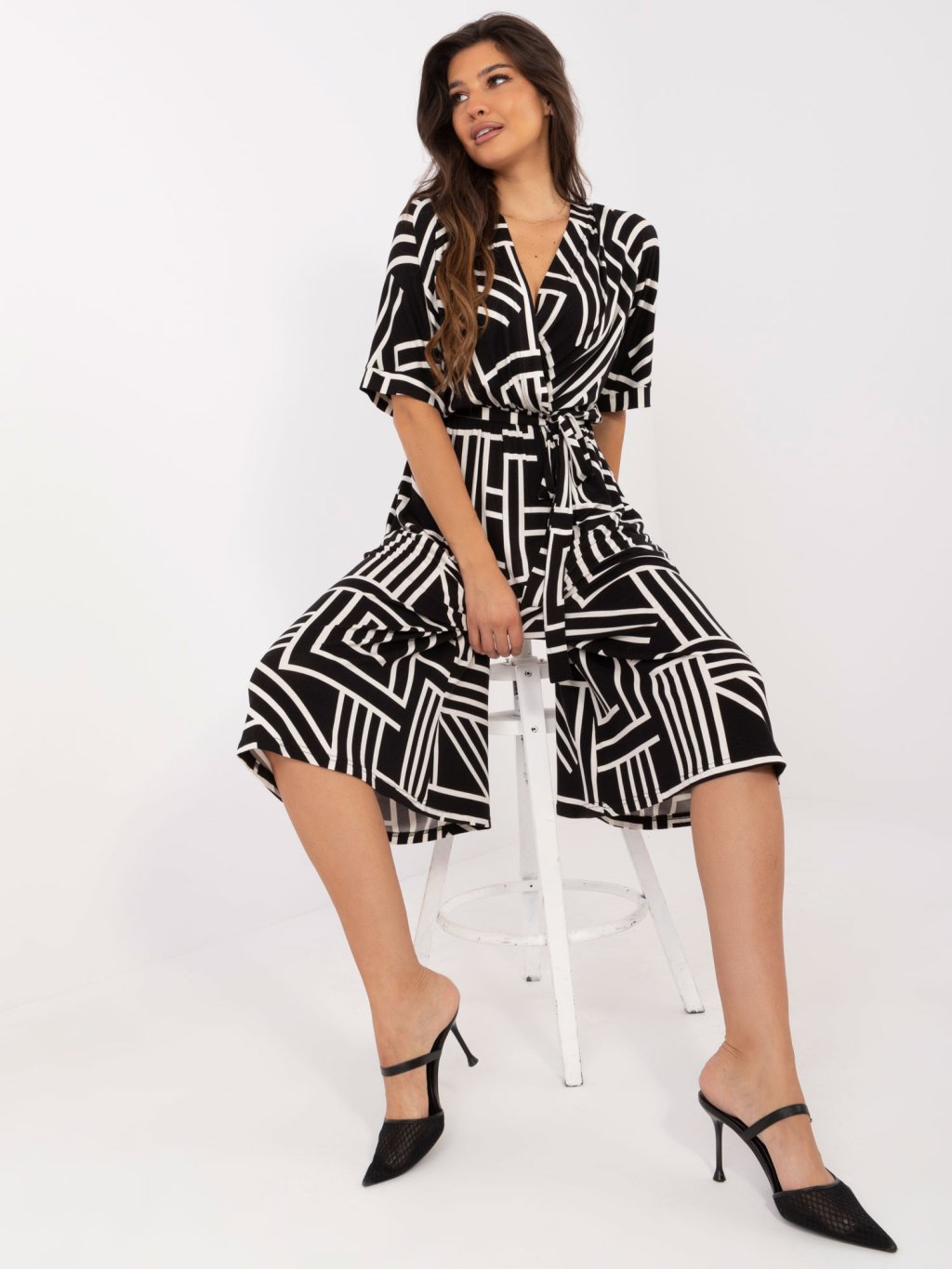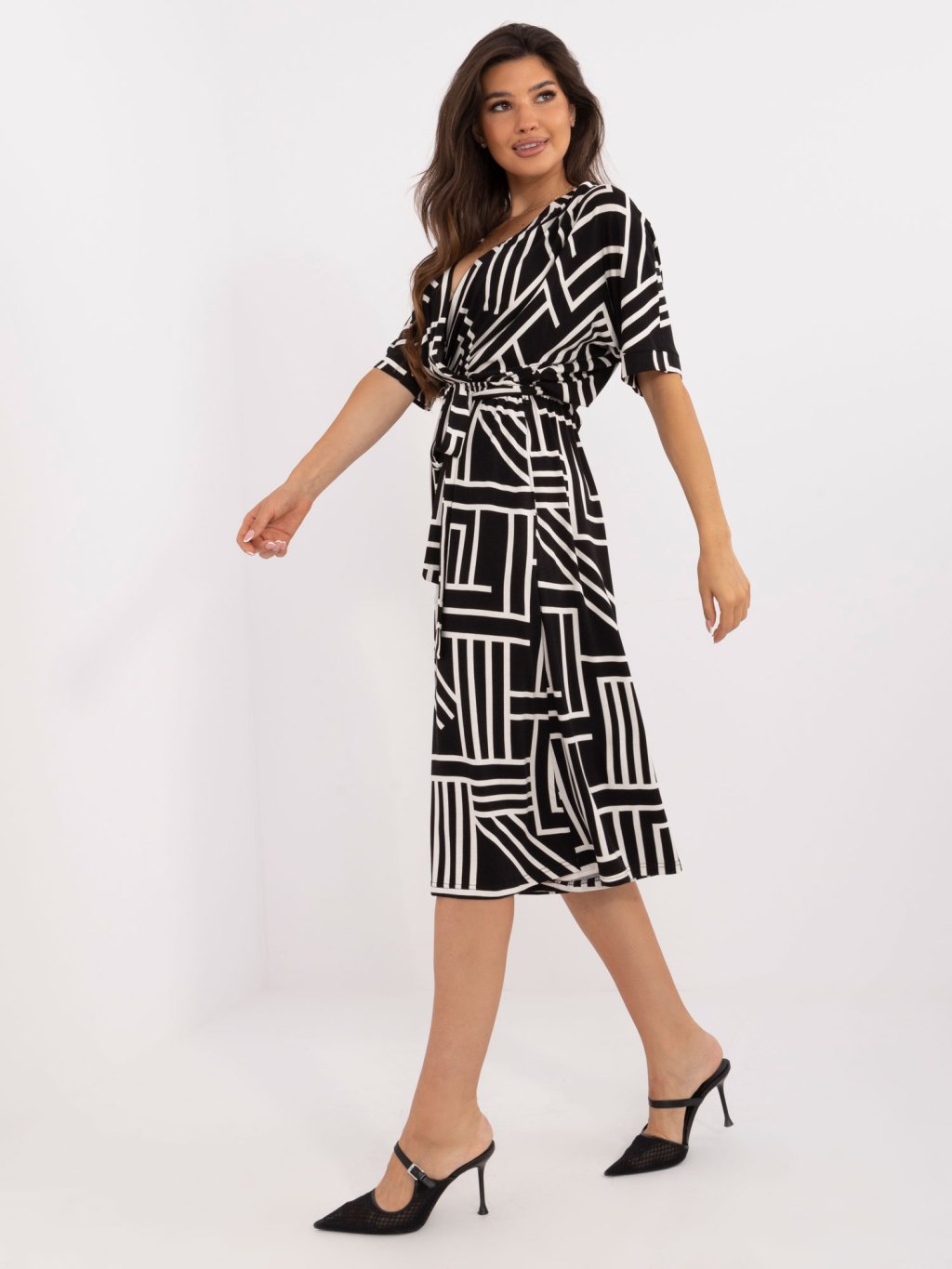 Modelka na obrázcích je vysoká 173 cm, obvod přes prsa má 89 cm, obvod pasu 65 cm a boky 91 cm.