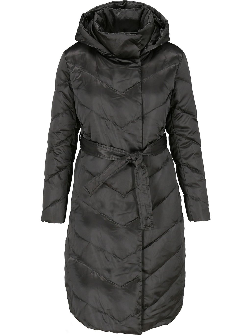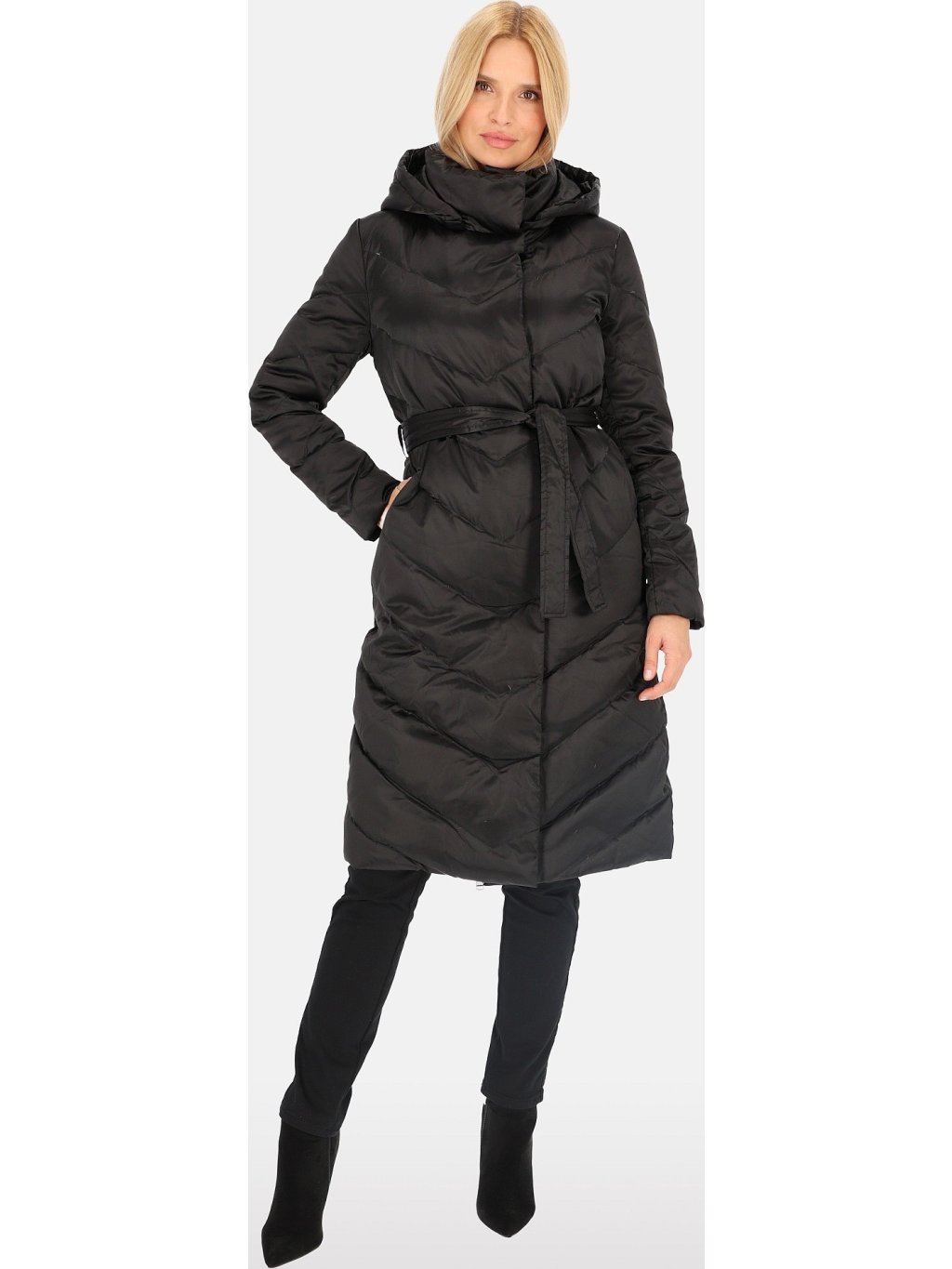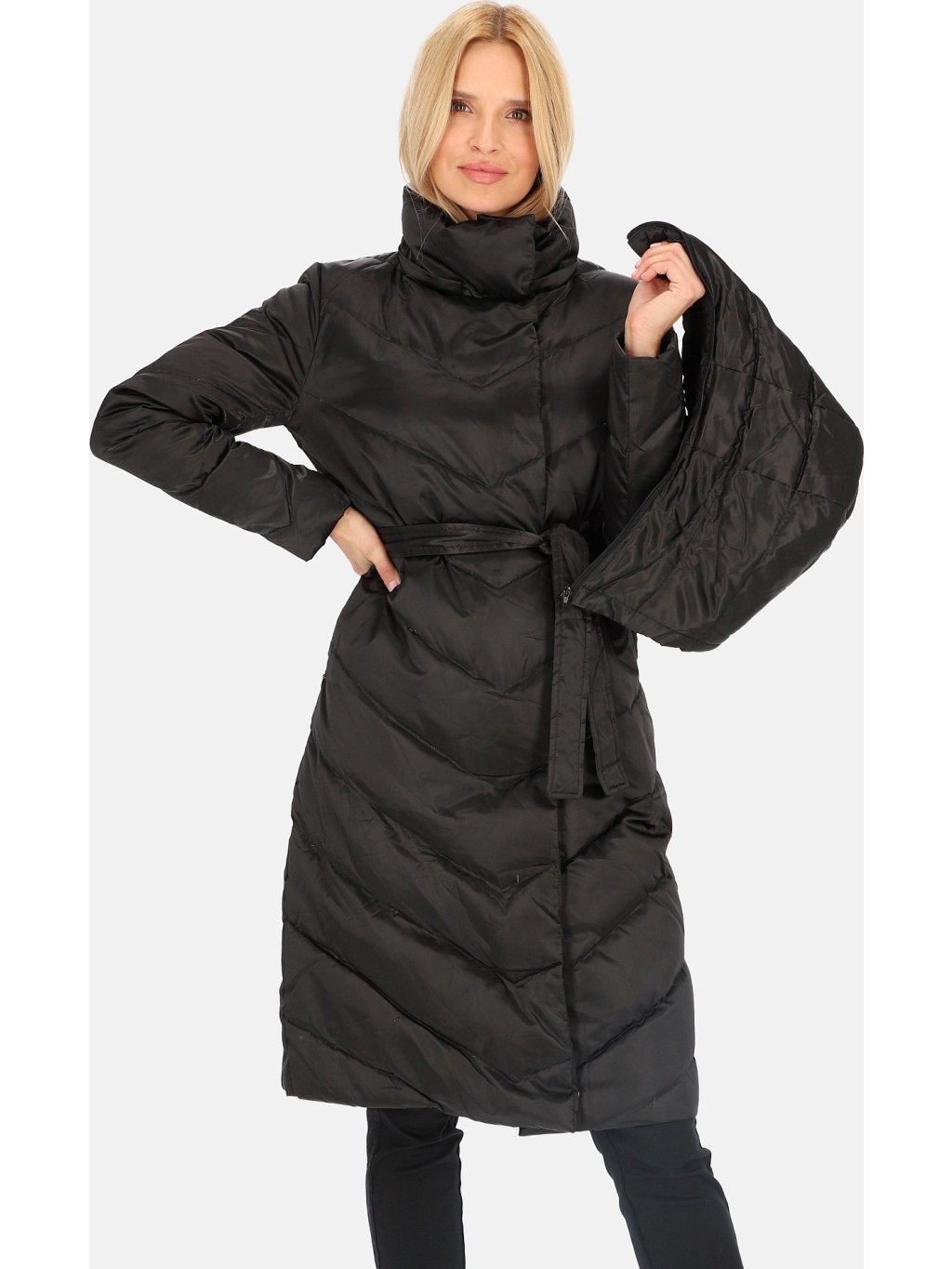 Černý dámský zimní prošívaný kabát s vázáním v pase
