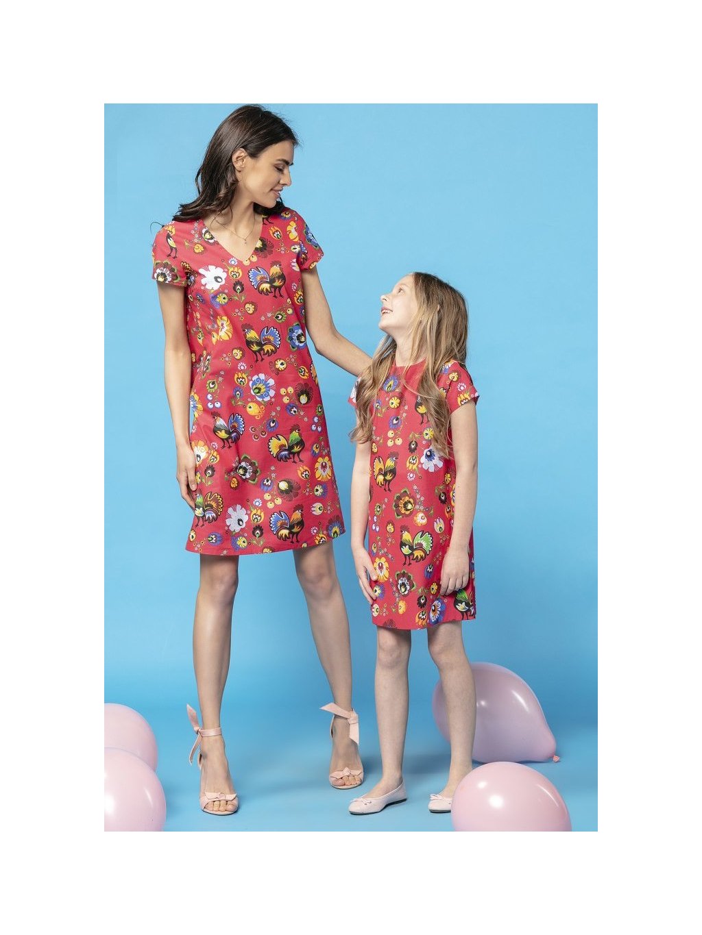Červené dámské jednoduché šaty máma a dcera s barevným vzorem