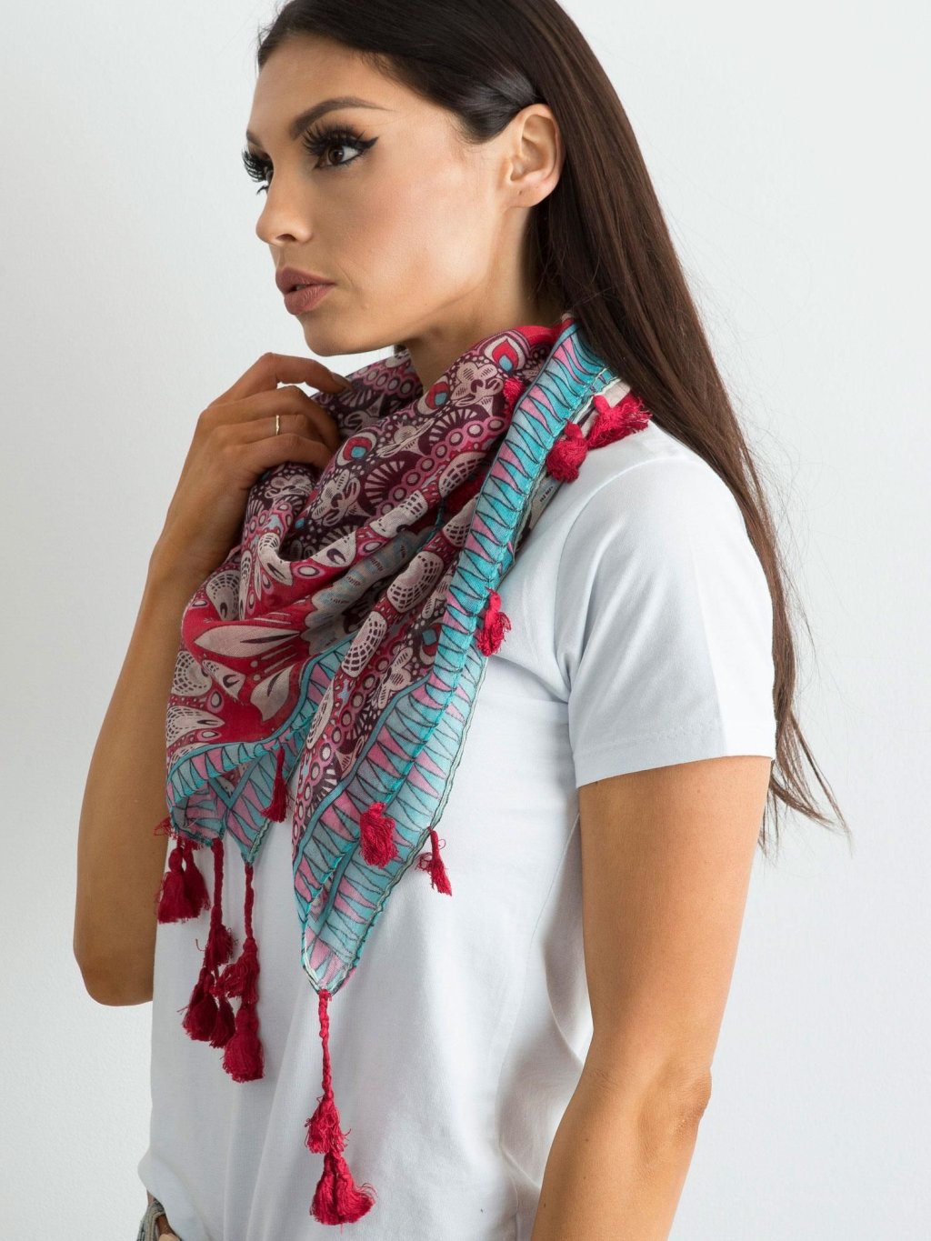 Dámský šátek s bohatě etnickými vzory a třásněmi