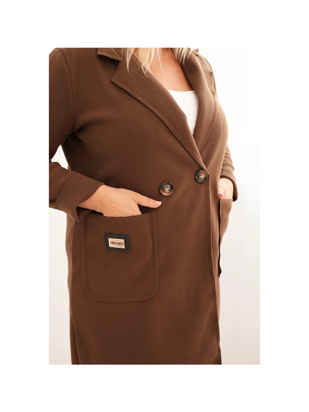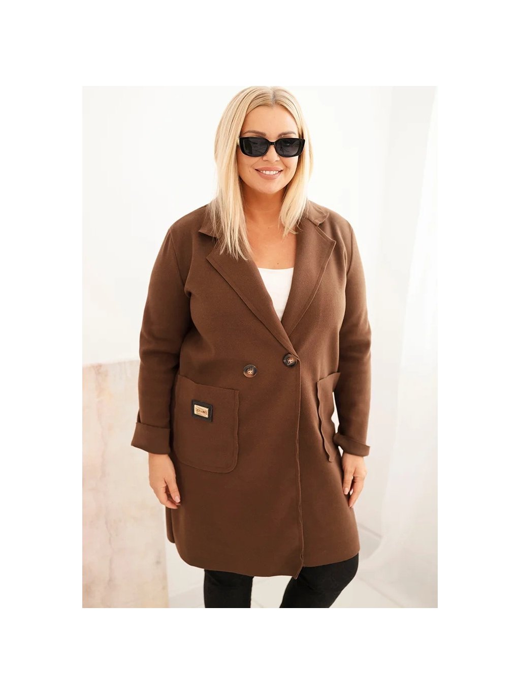 Čokoládově hnědý dámský elegantní plus size kabát s límcem a velkými kapsami