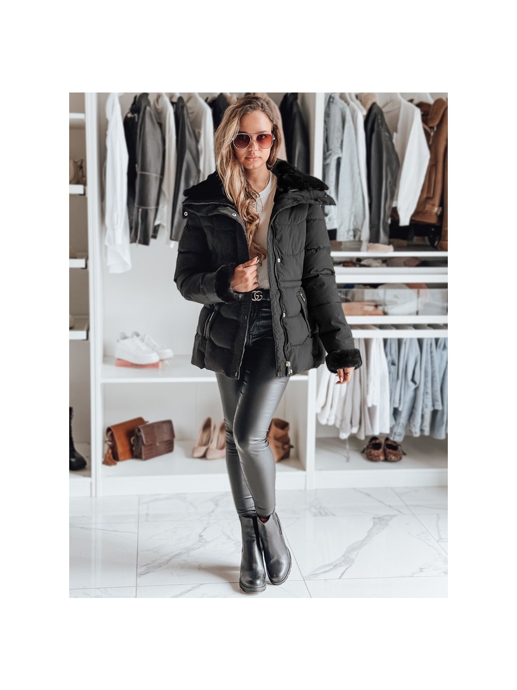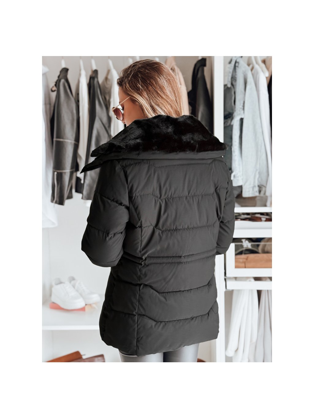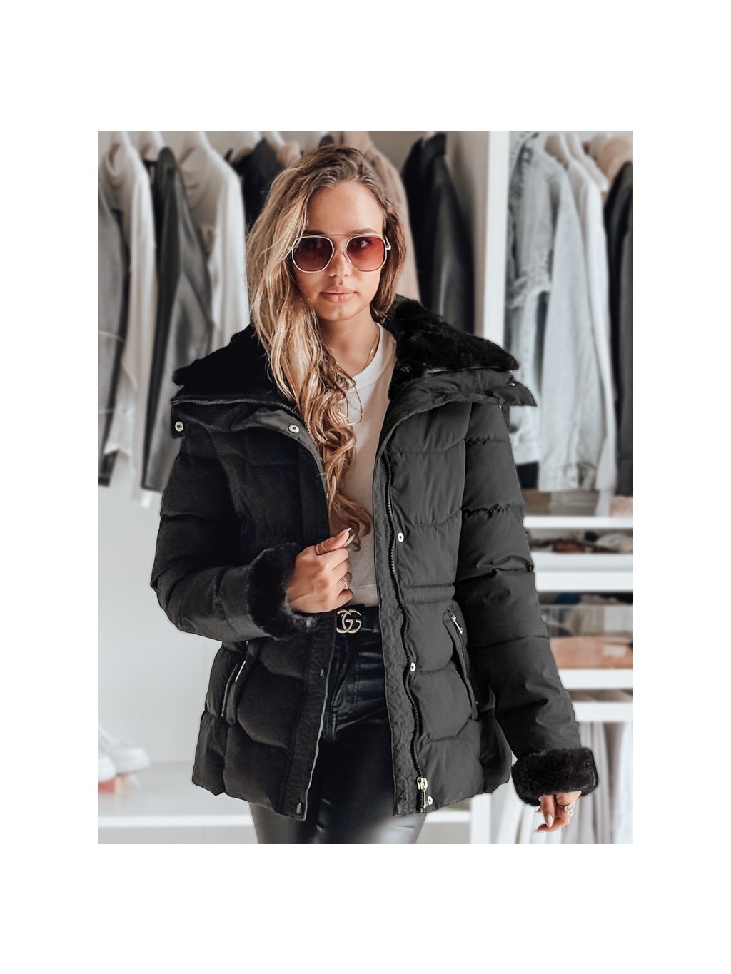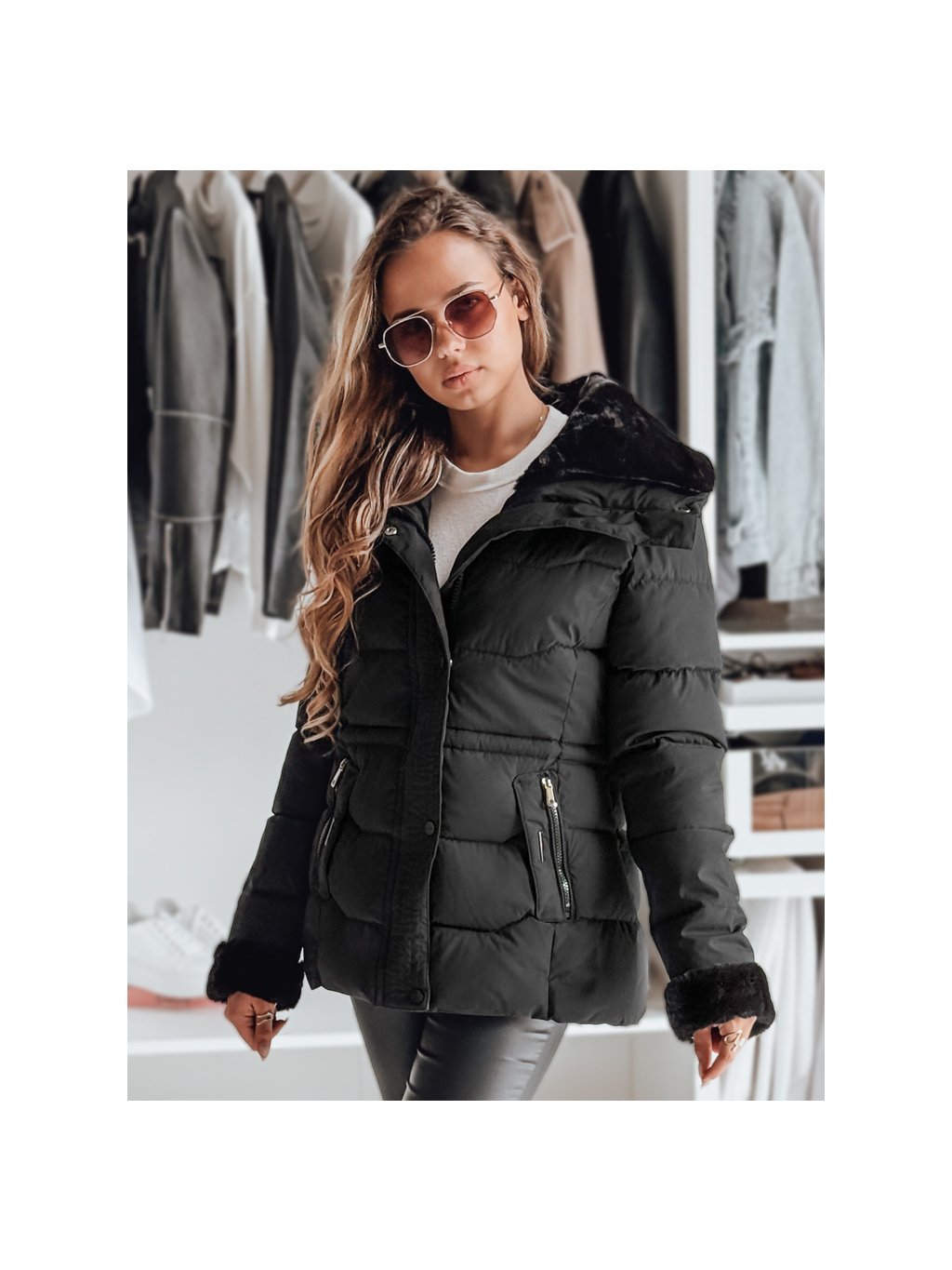 Dámská černá prošívaná bunda s kožešinovým límcem