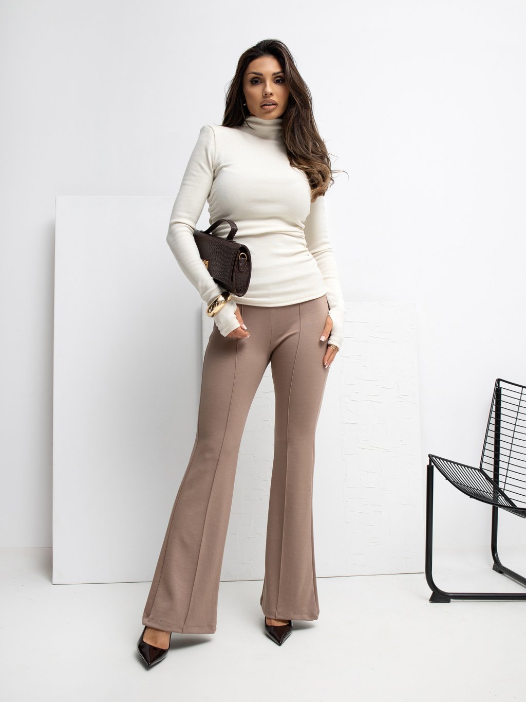Dámské tmavě béžové kalhoty s vysokým pasem