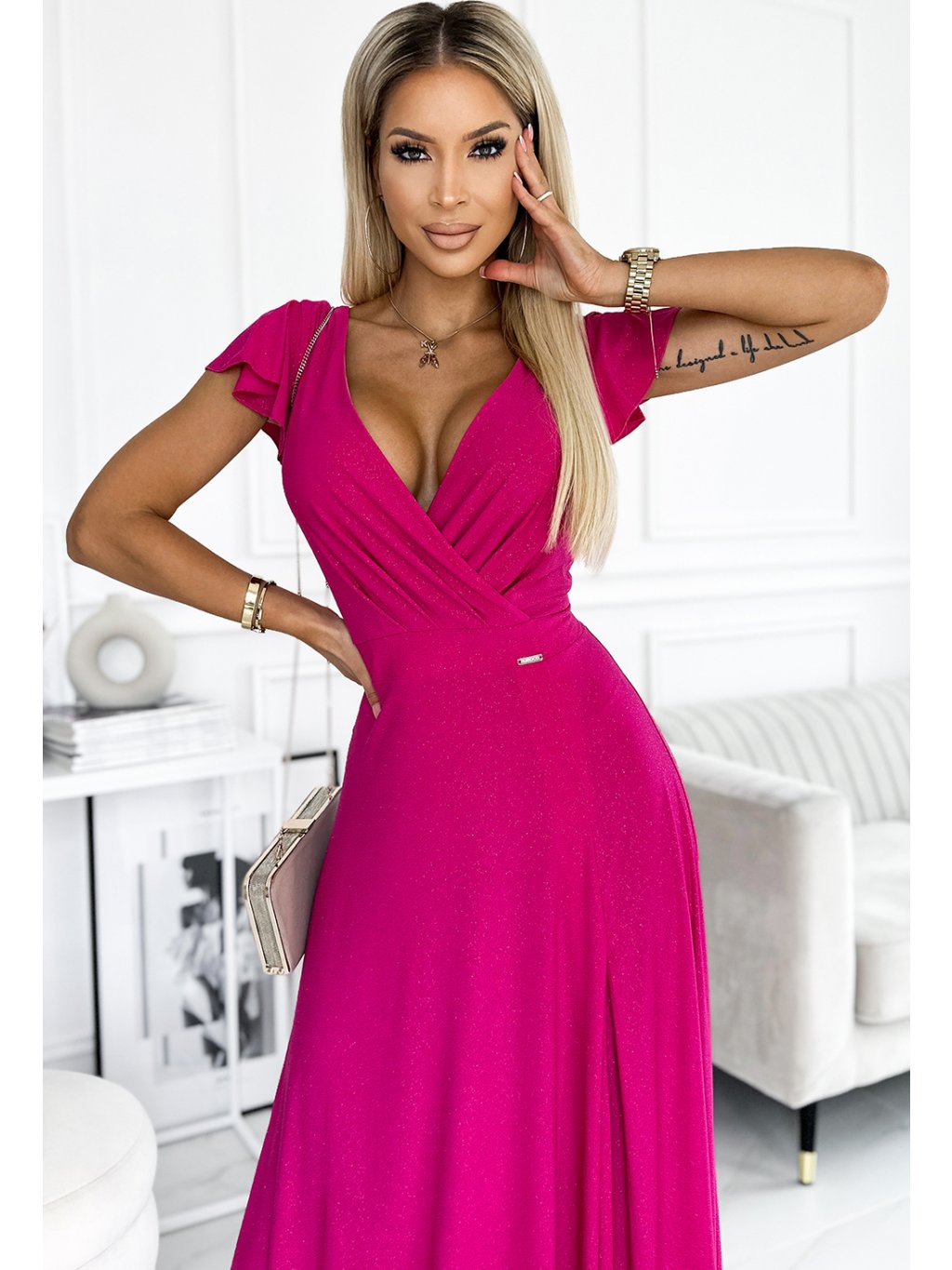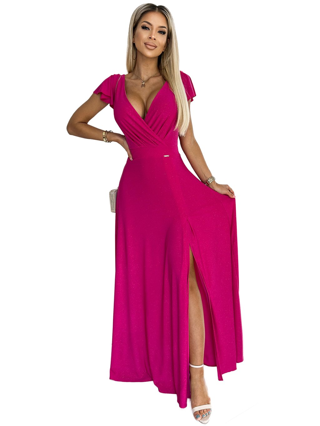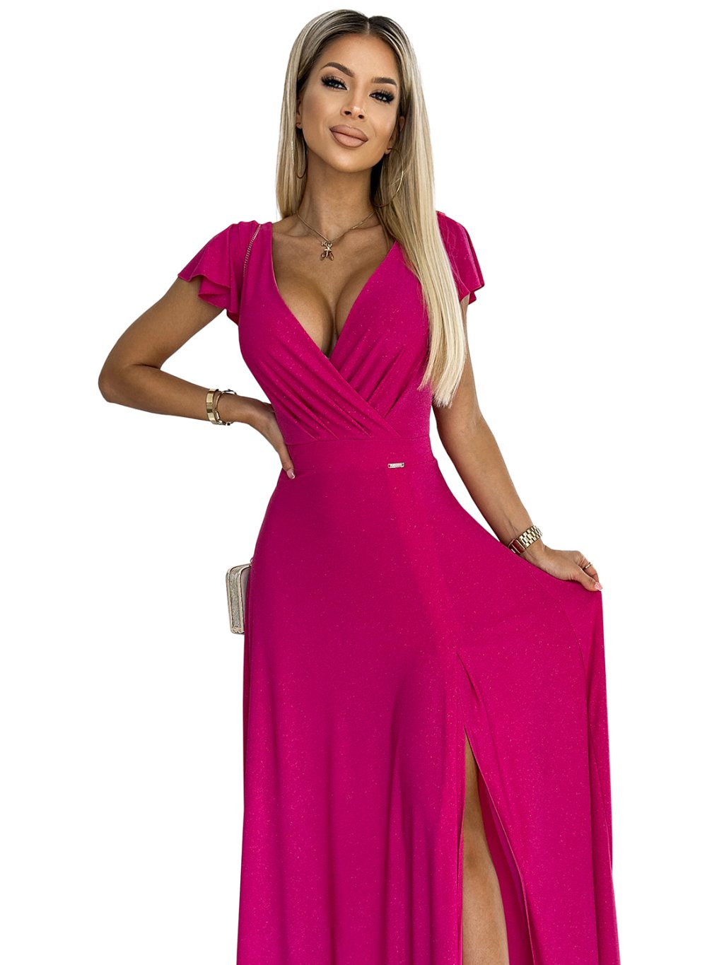 Fuchsiové dlouhé šaty s výstřihem a třpytkami CRYSTAL