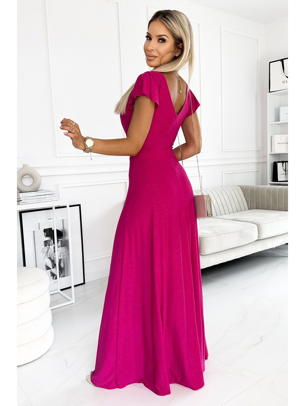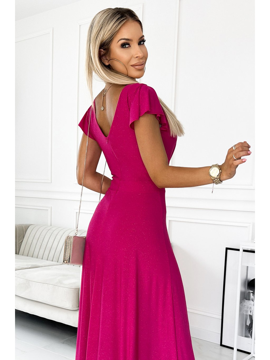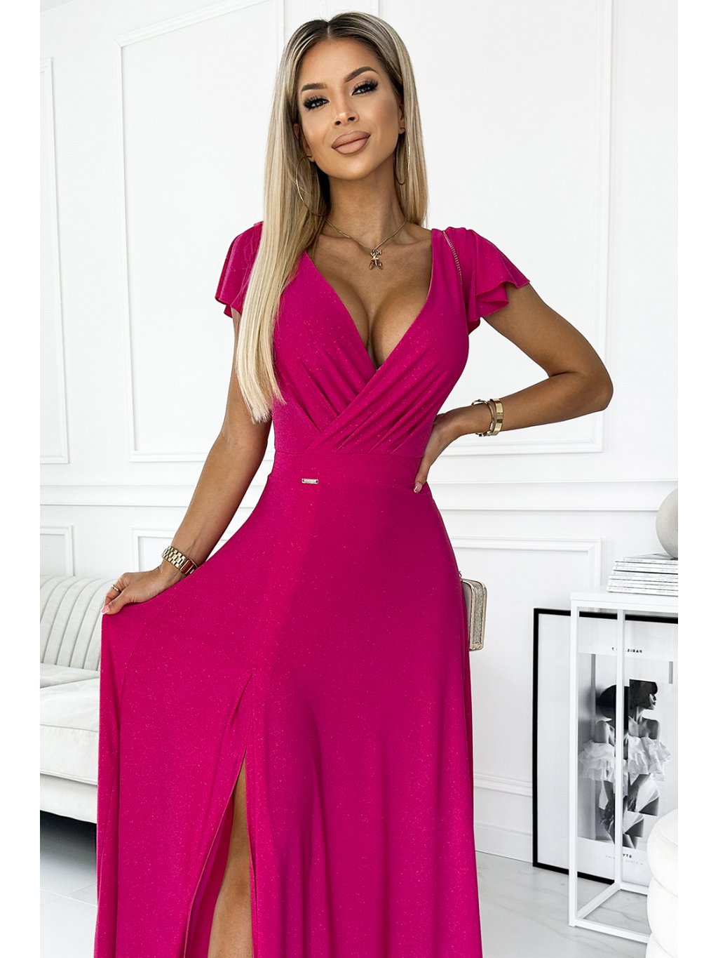 Fuchsiové dlouhé šaty s výstřihem a třpytkami CRYSTAL