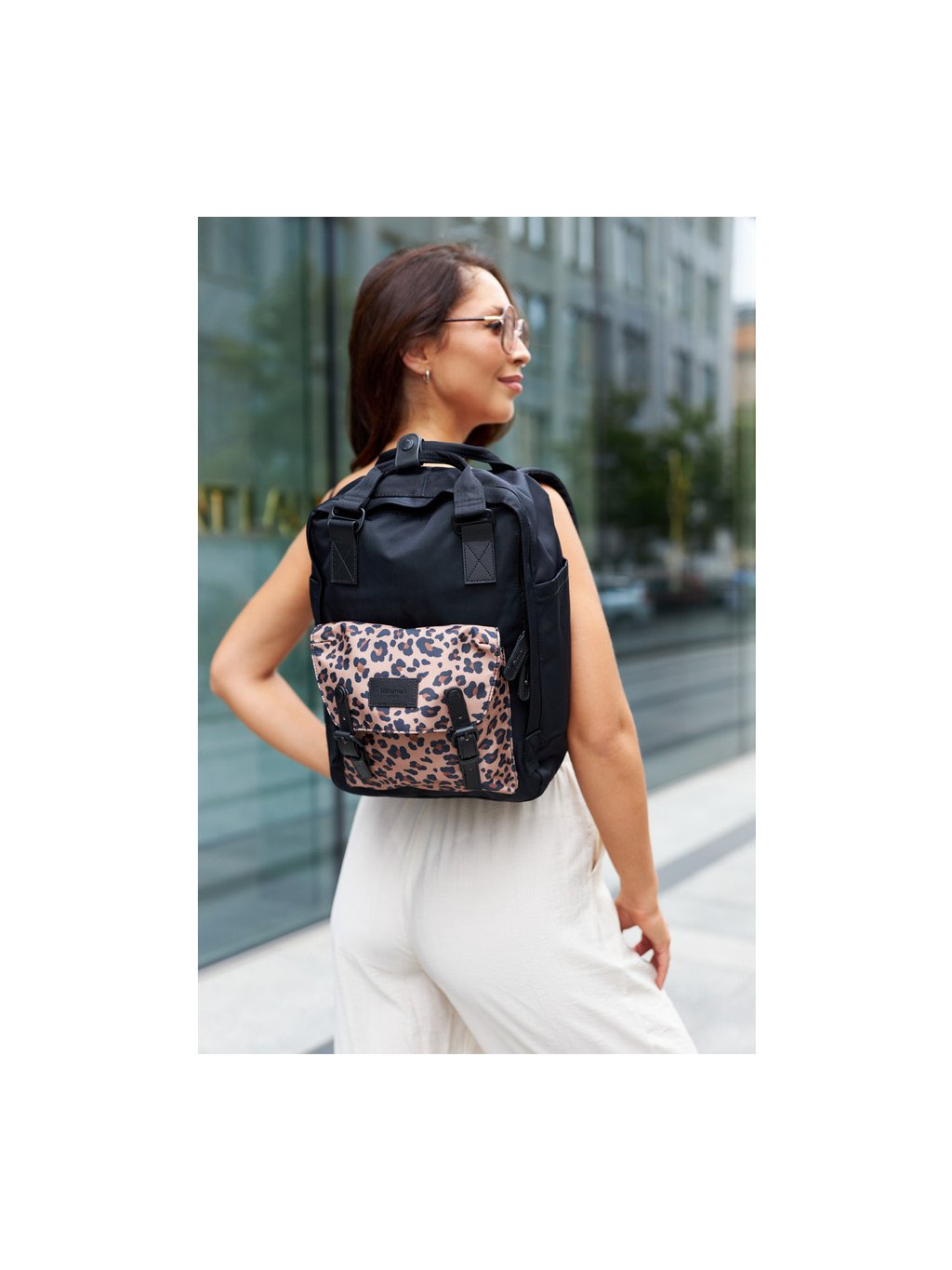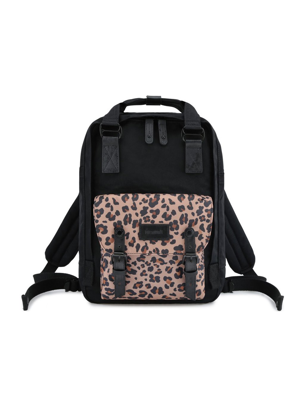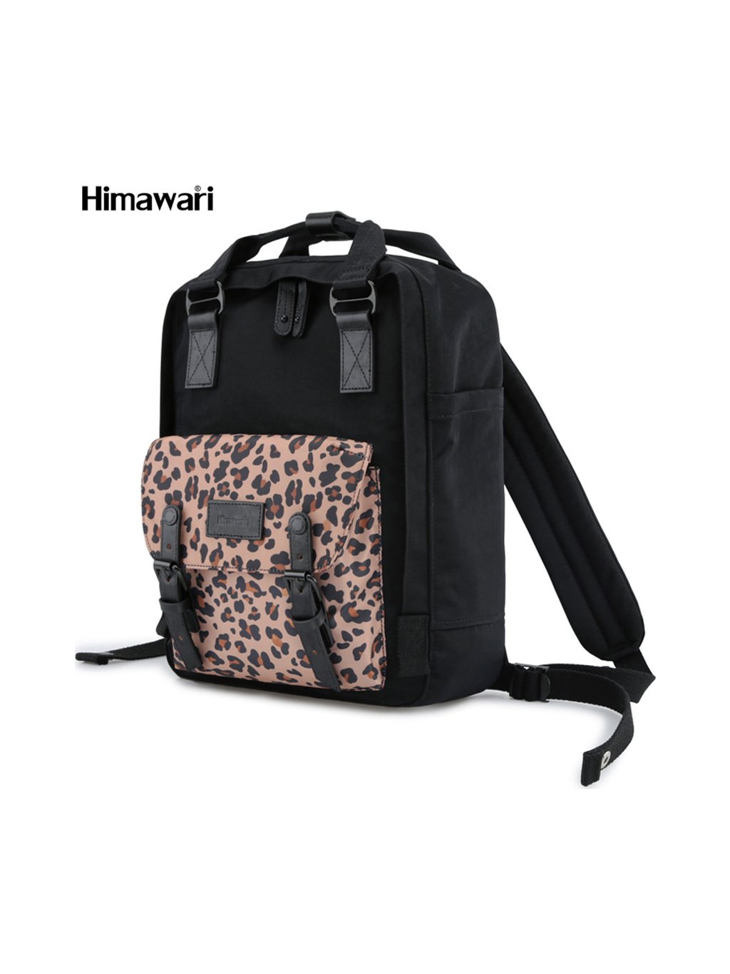 Himawari Černý stylový batoh s kapsou s leopardím vzorem