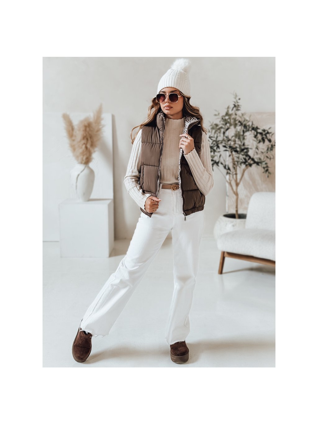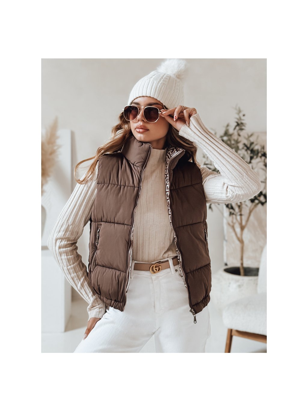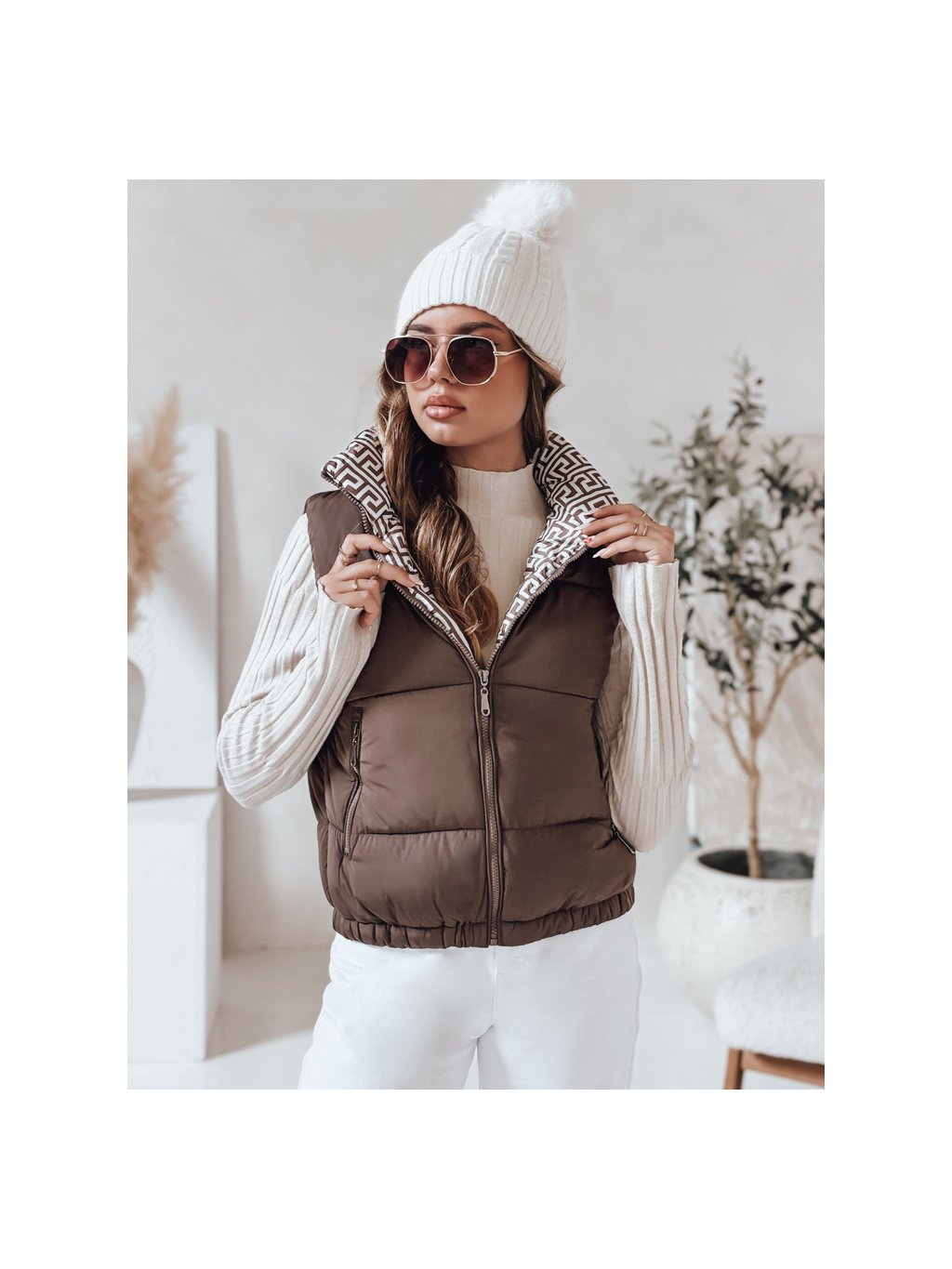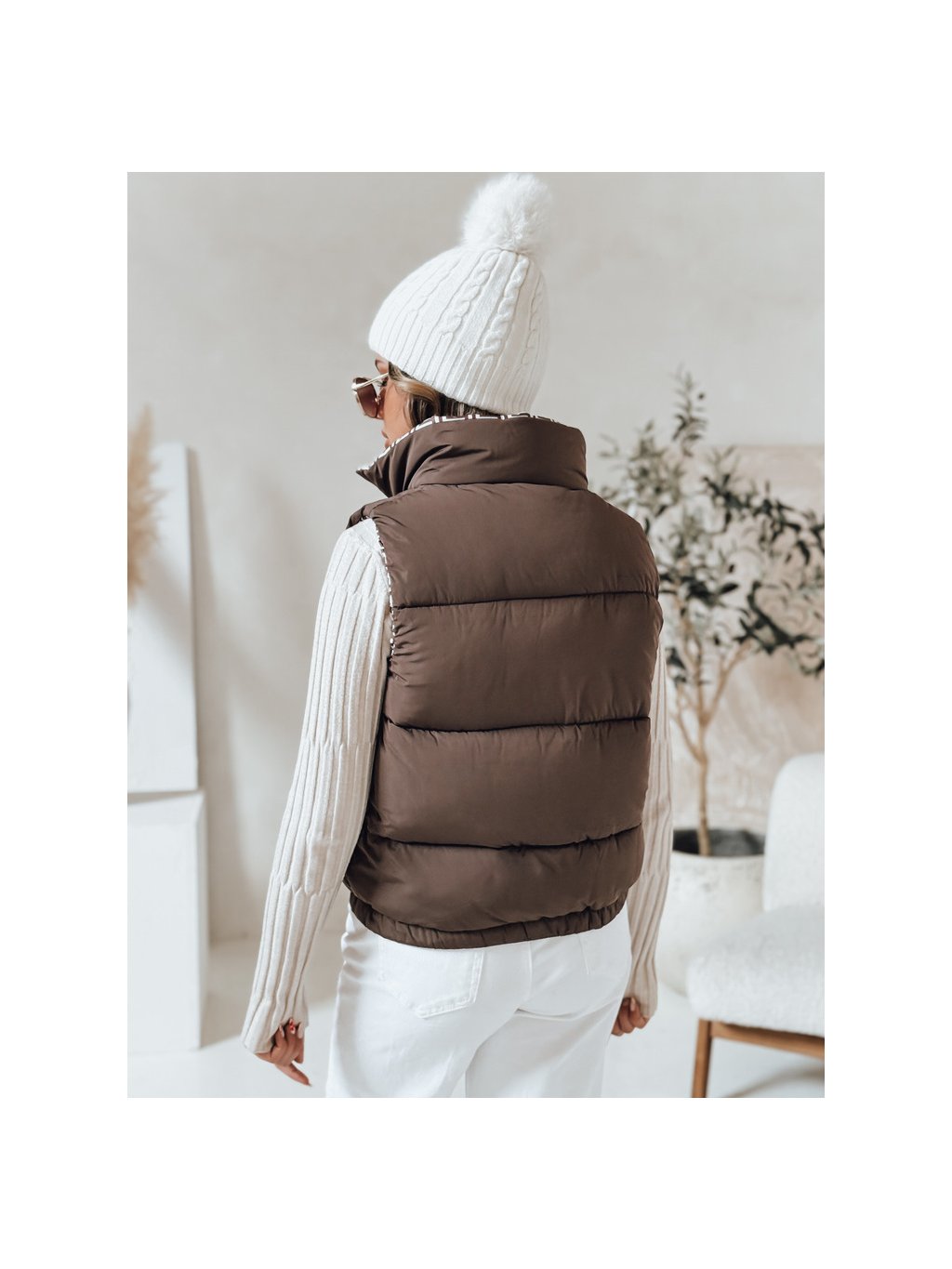 Hnědá dámská krátká prošívaná vesta URBANELLE s elastickým pasem