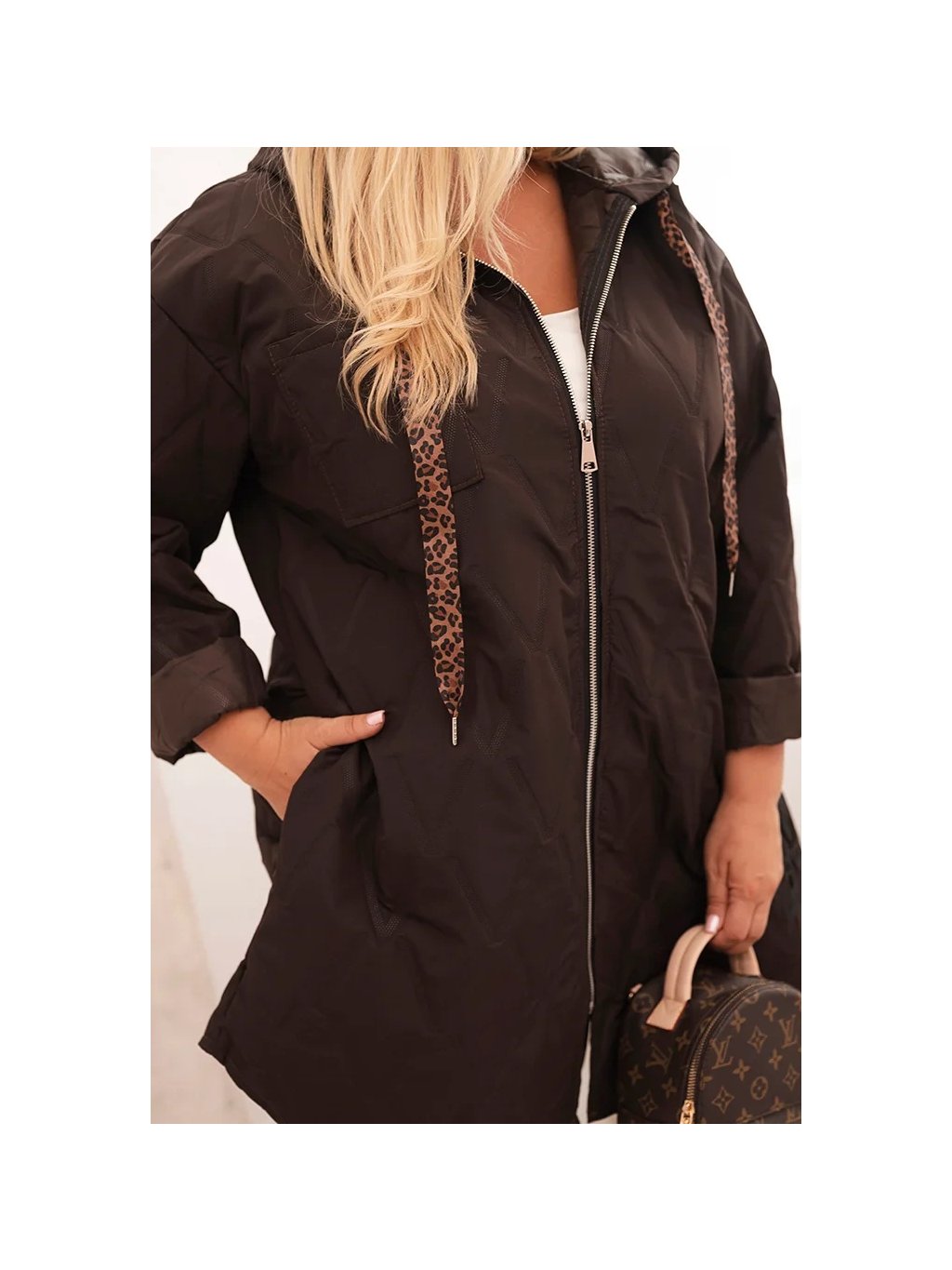 Hnědá dámská plus size prošívaná bunda s kapucí