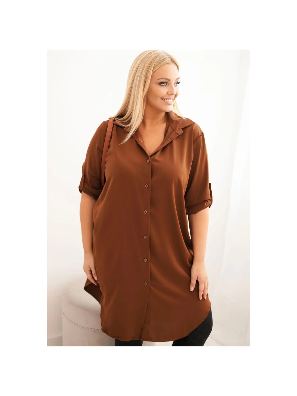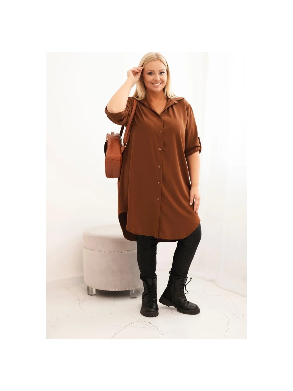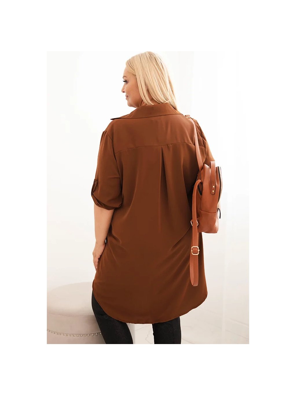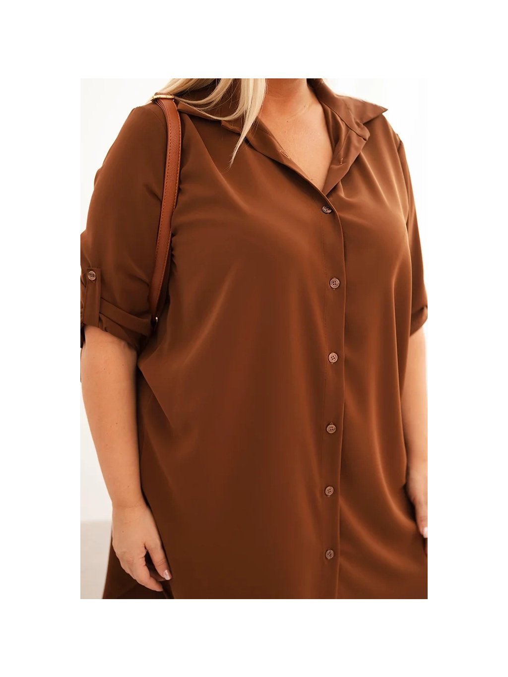 Hnědé asymetrické Plus Size košilové šaty s ohrnovacími rukávy