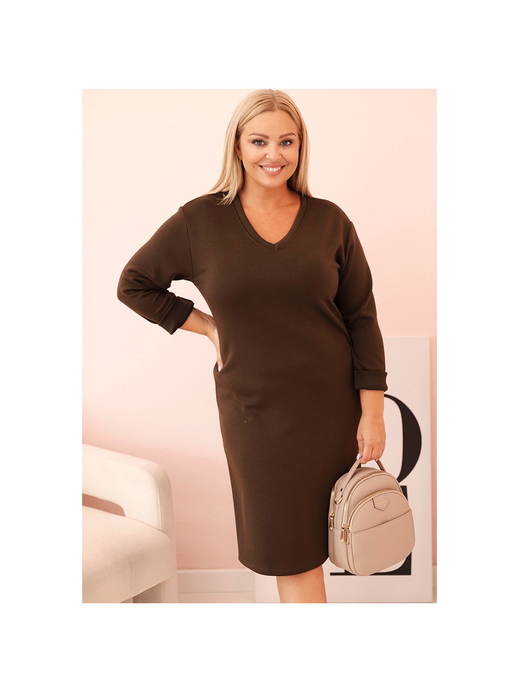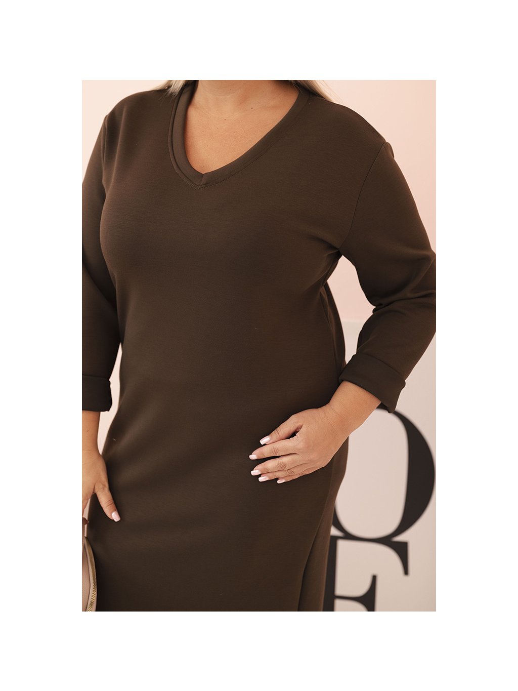 Hnědé Plus Size šaty s výstřihem do V a 3/4 rukávy