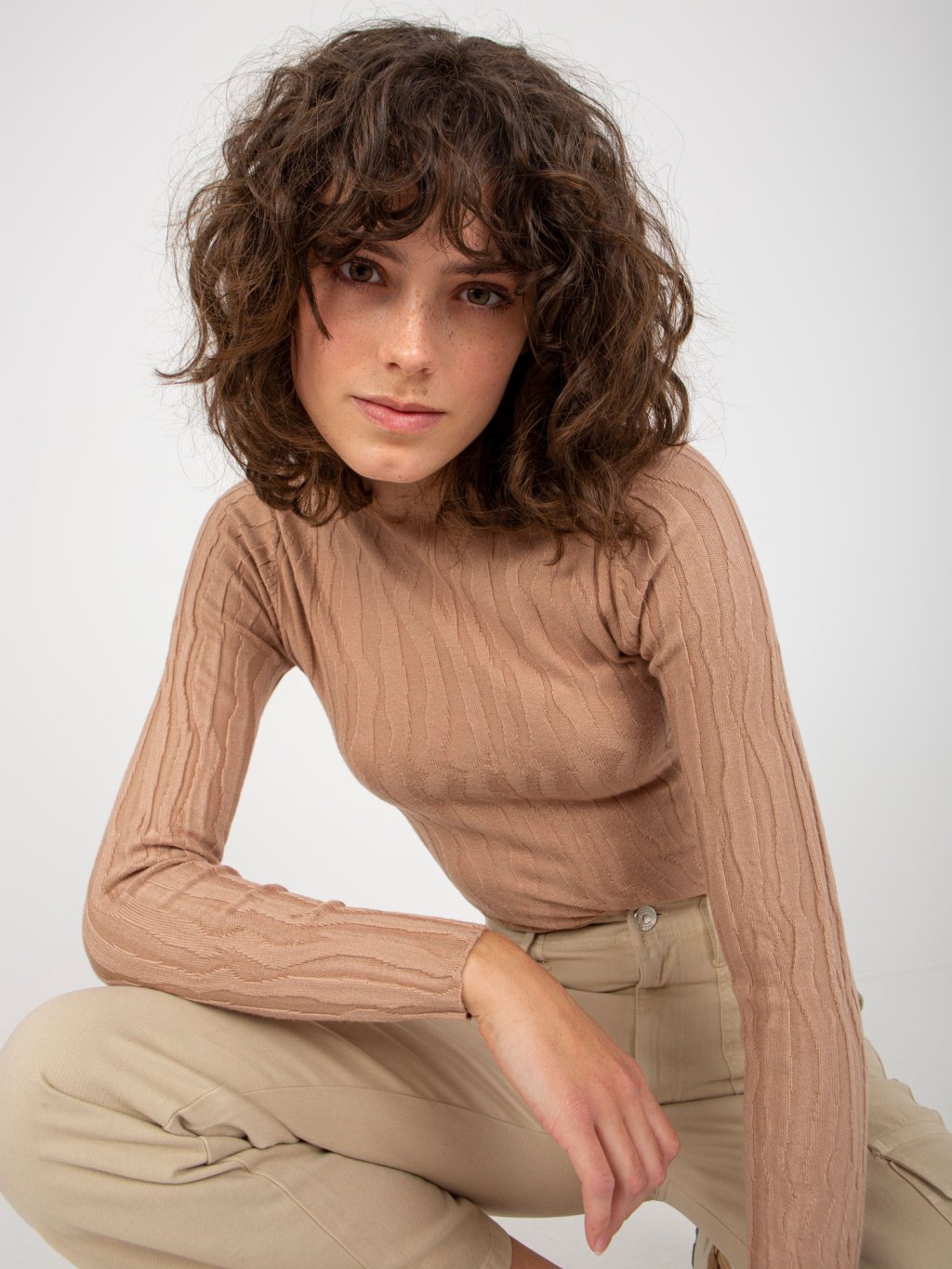 Modelka na obrázcích je vysoká 170 cm, obvod přes prsa 88 cm, obvod pasu 63 cm a boky 89 cm.