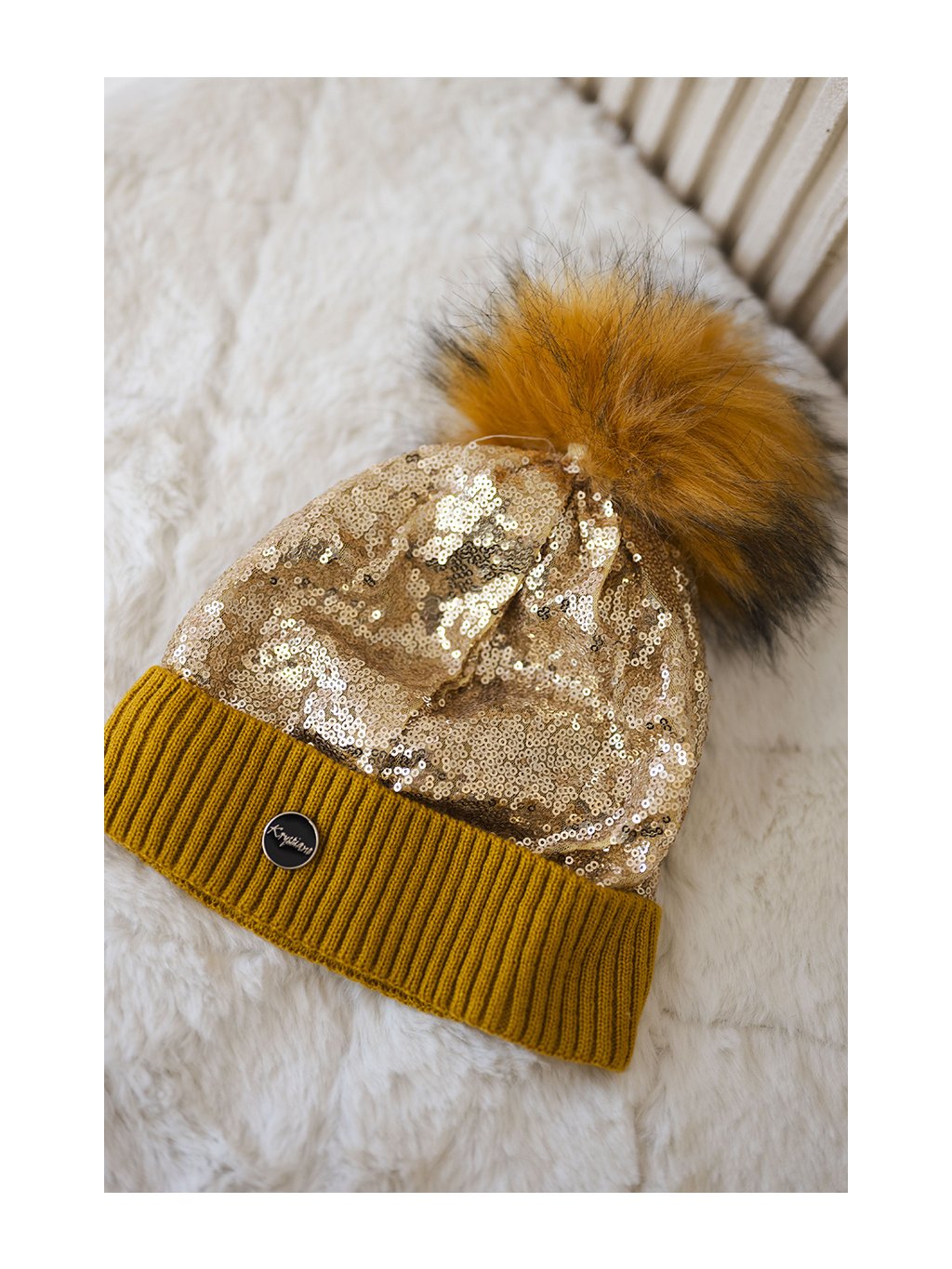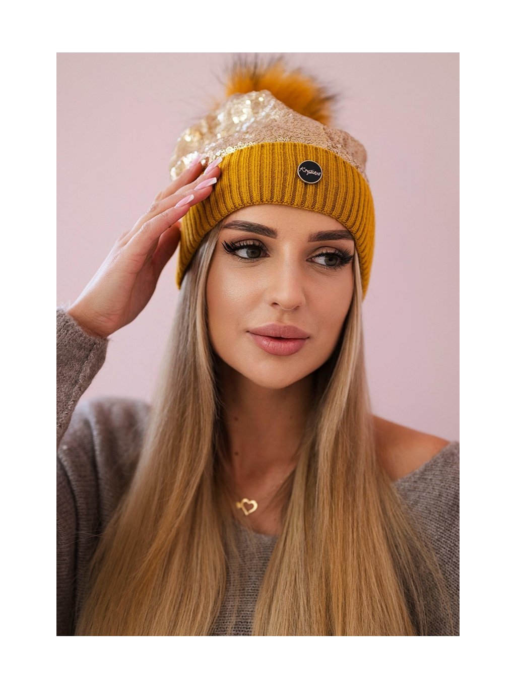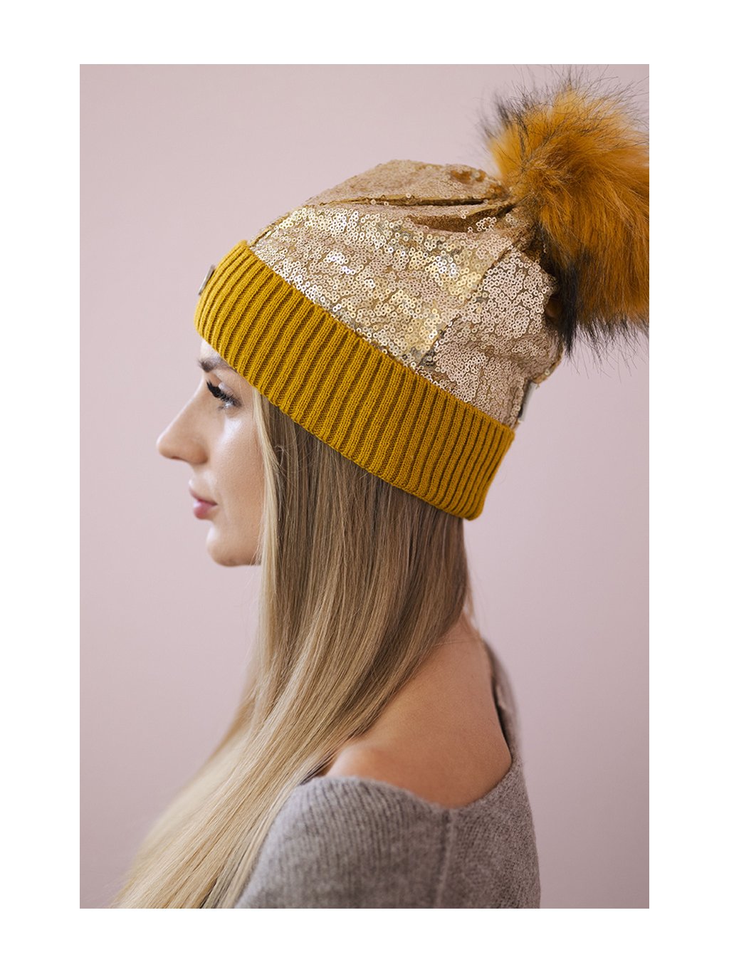 Hořčicová dámská čepice s flitry