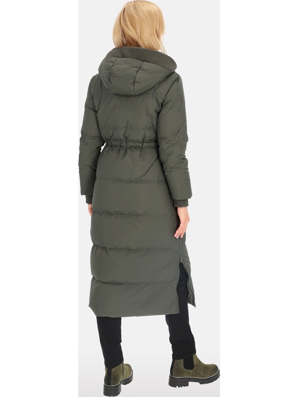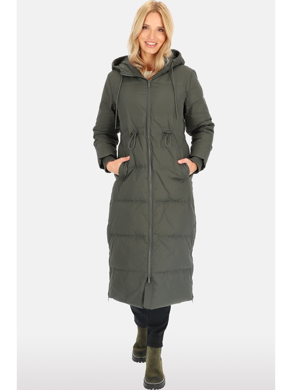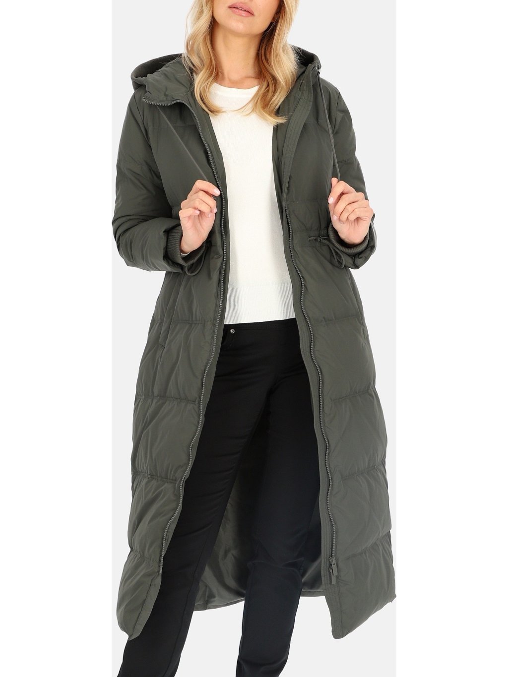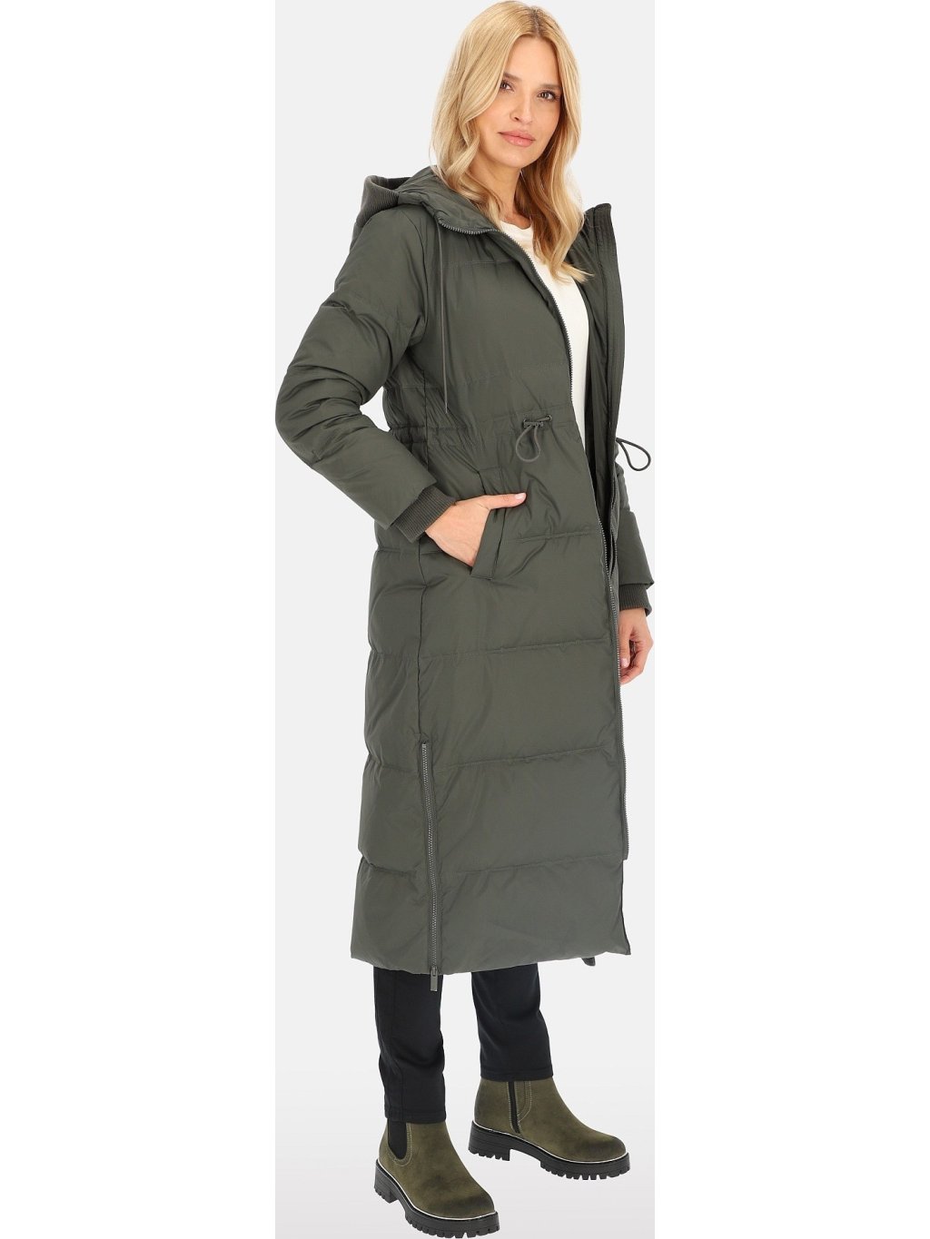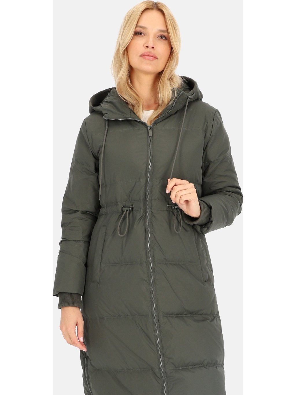 Khaki dámská dlouhá péřová bunda s prošíváním