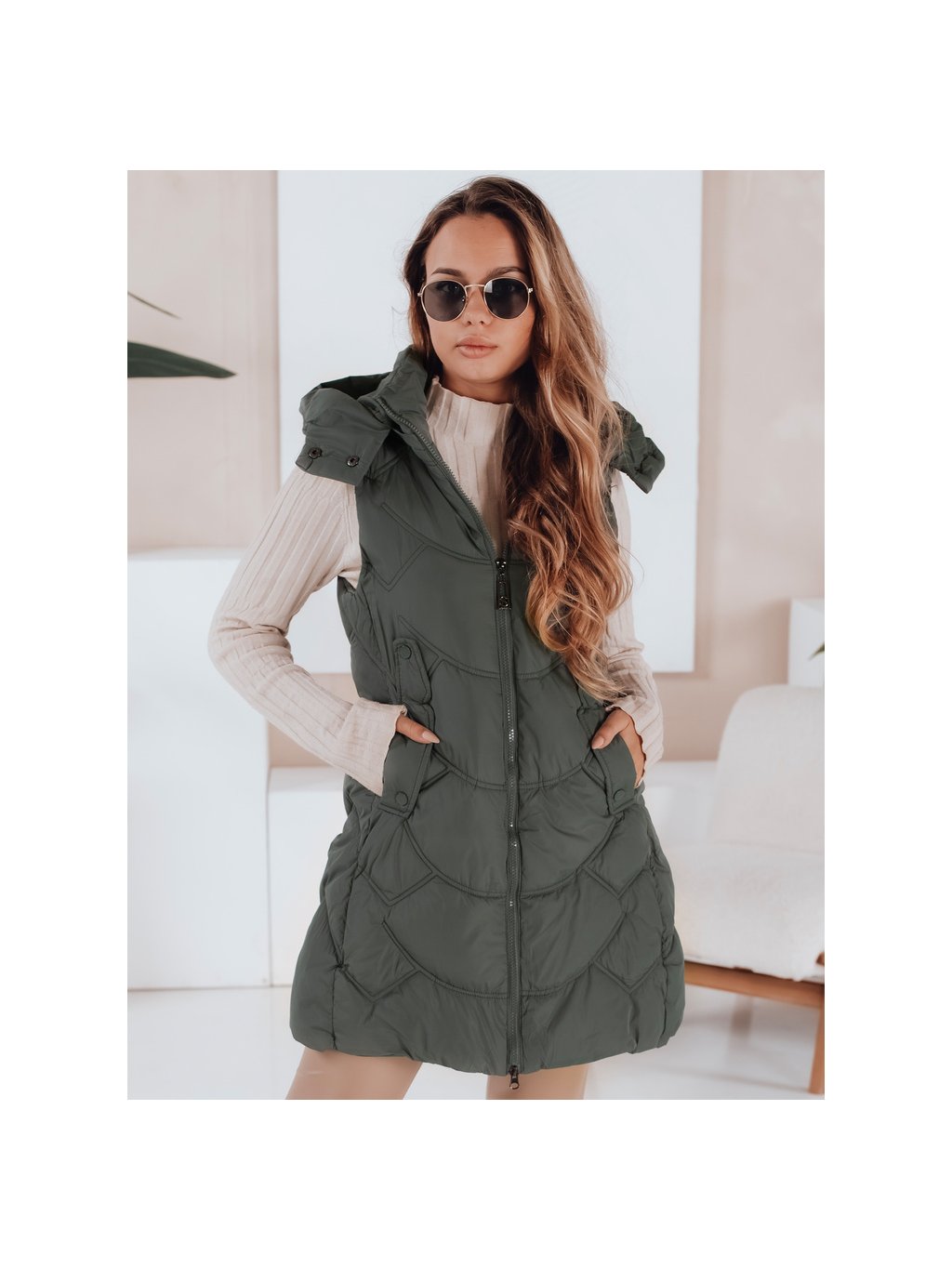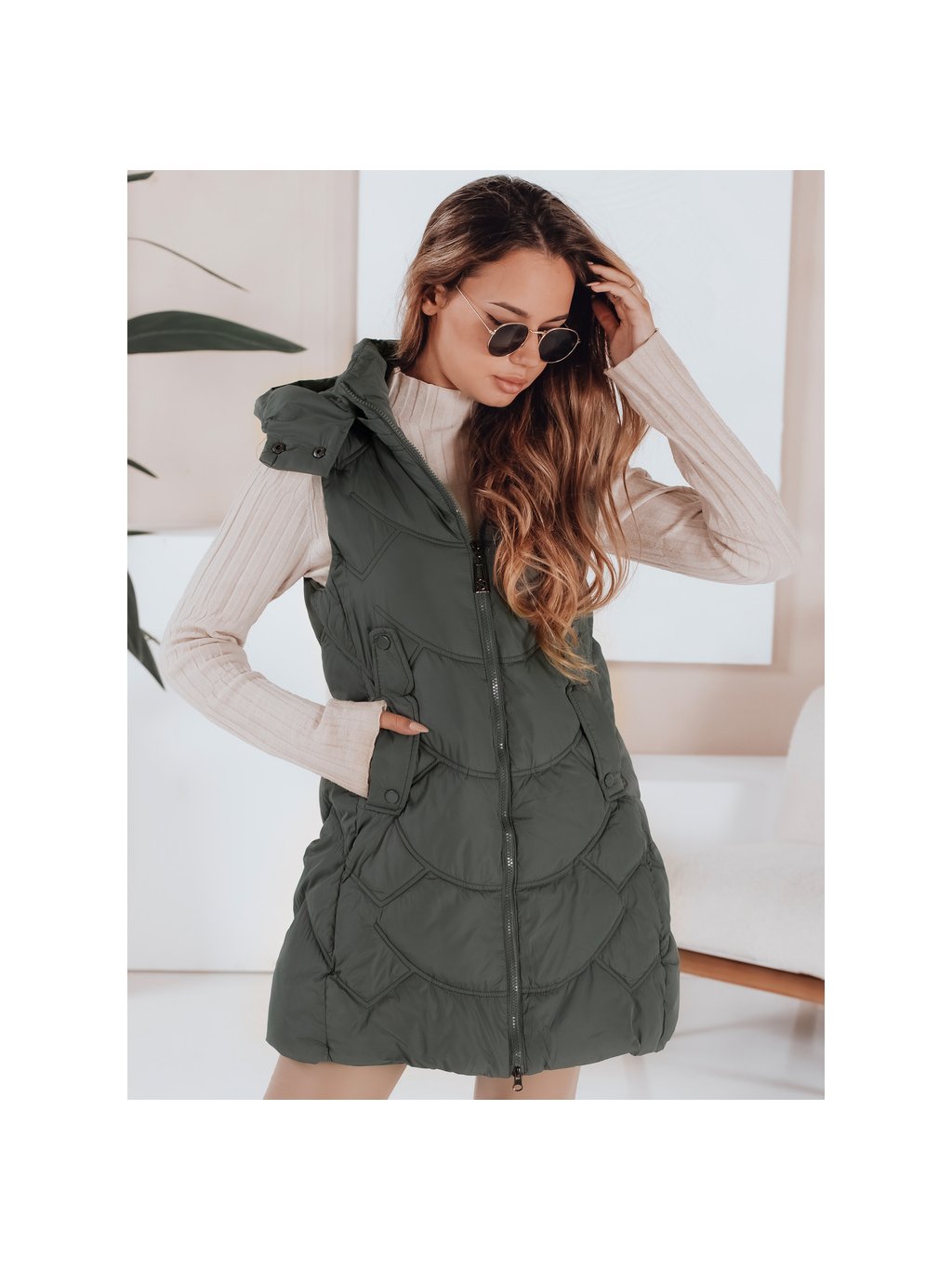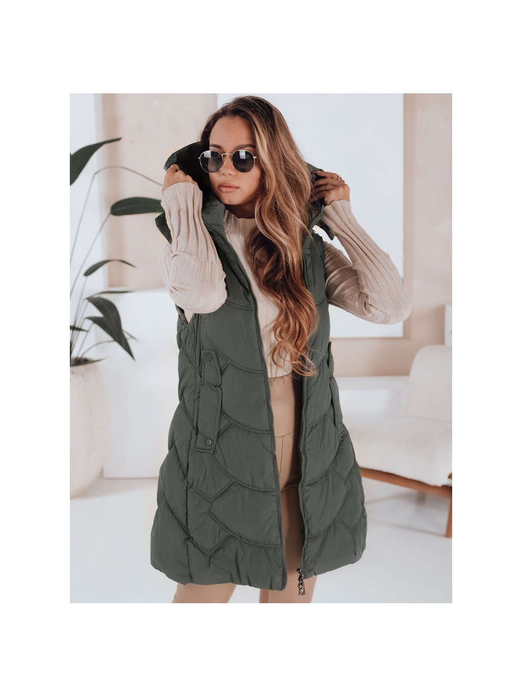 Khaki dámská zateplená vesta s odnímatelnou kapucí