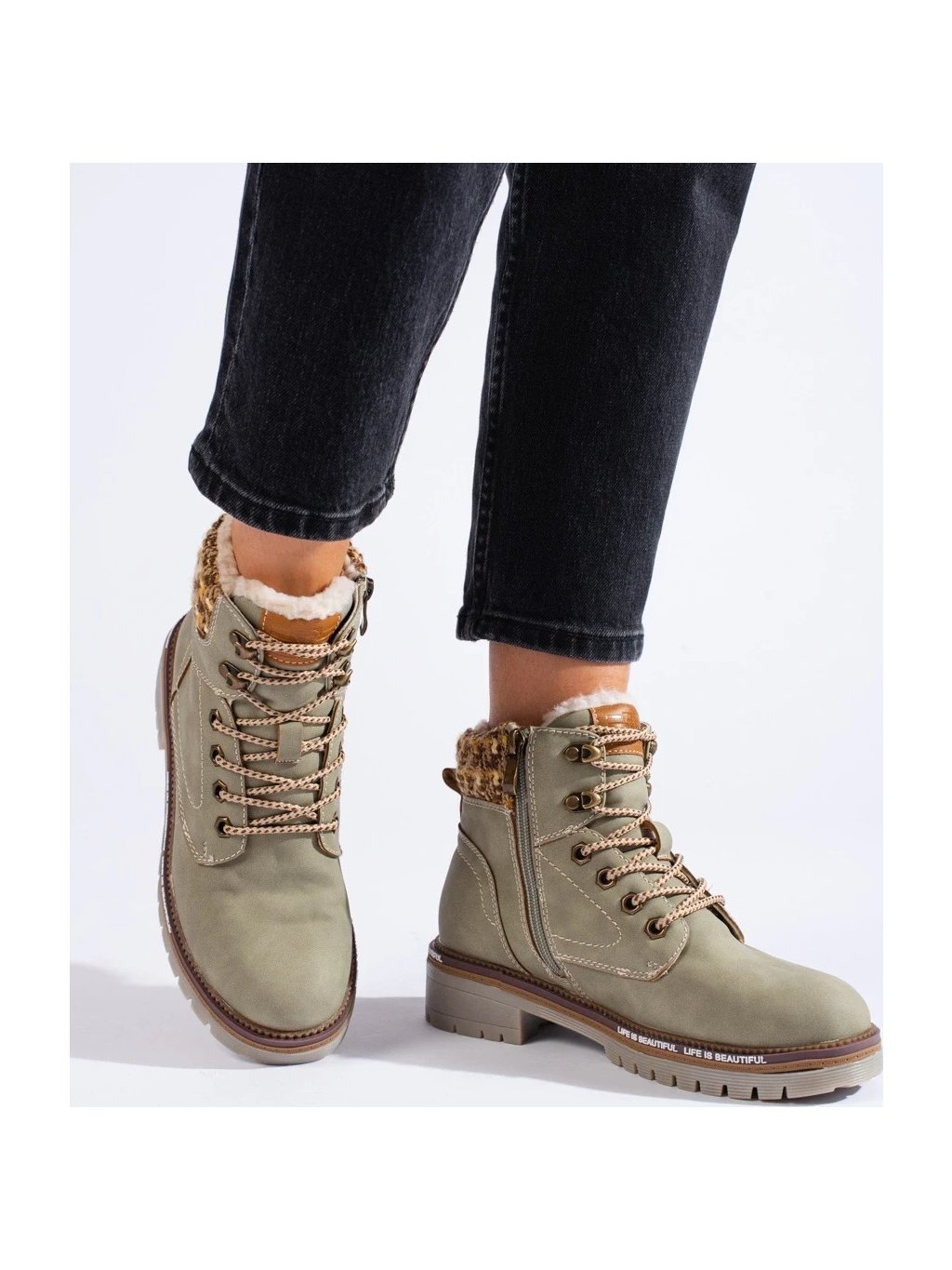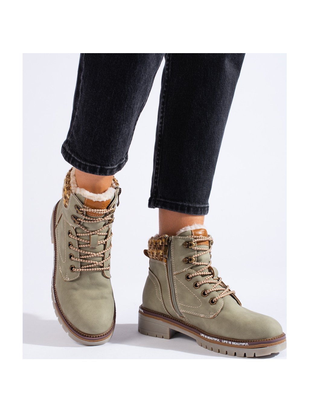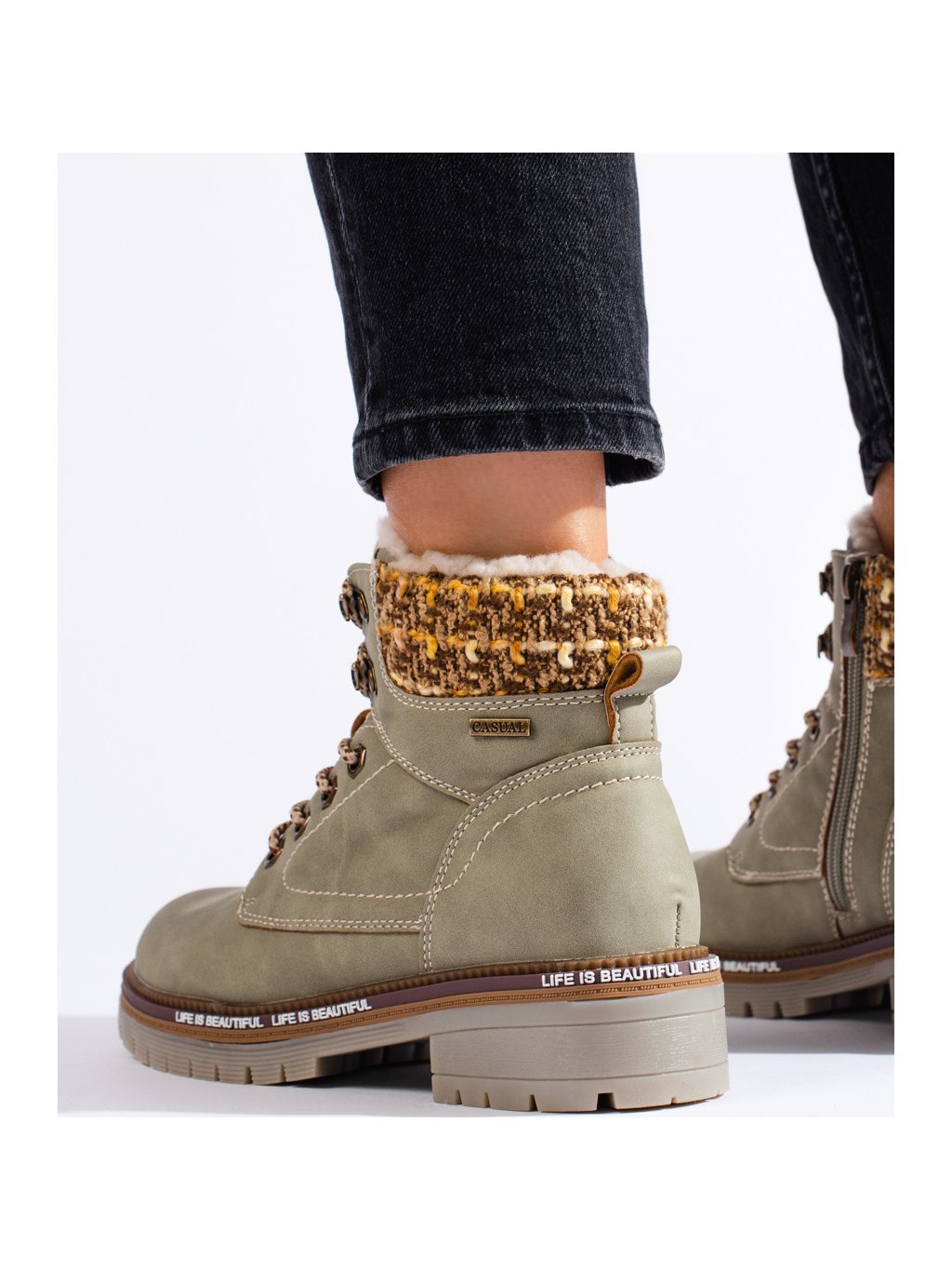 Khaki dámské traperky s pletenou vsadkou
