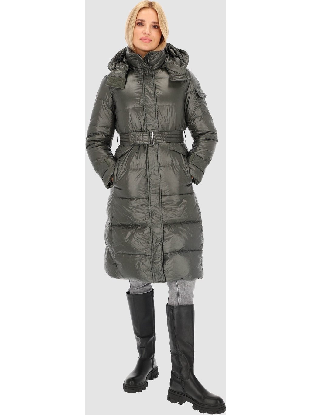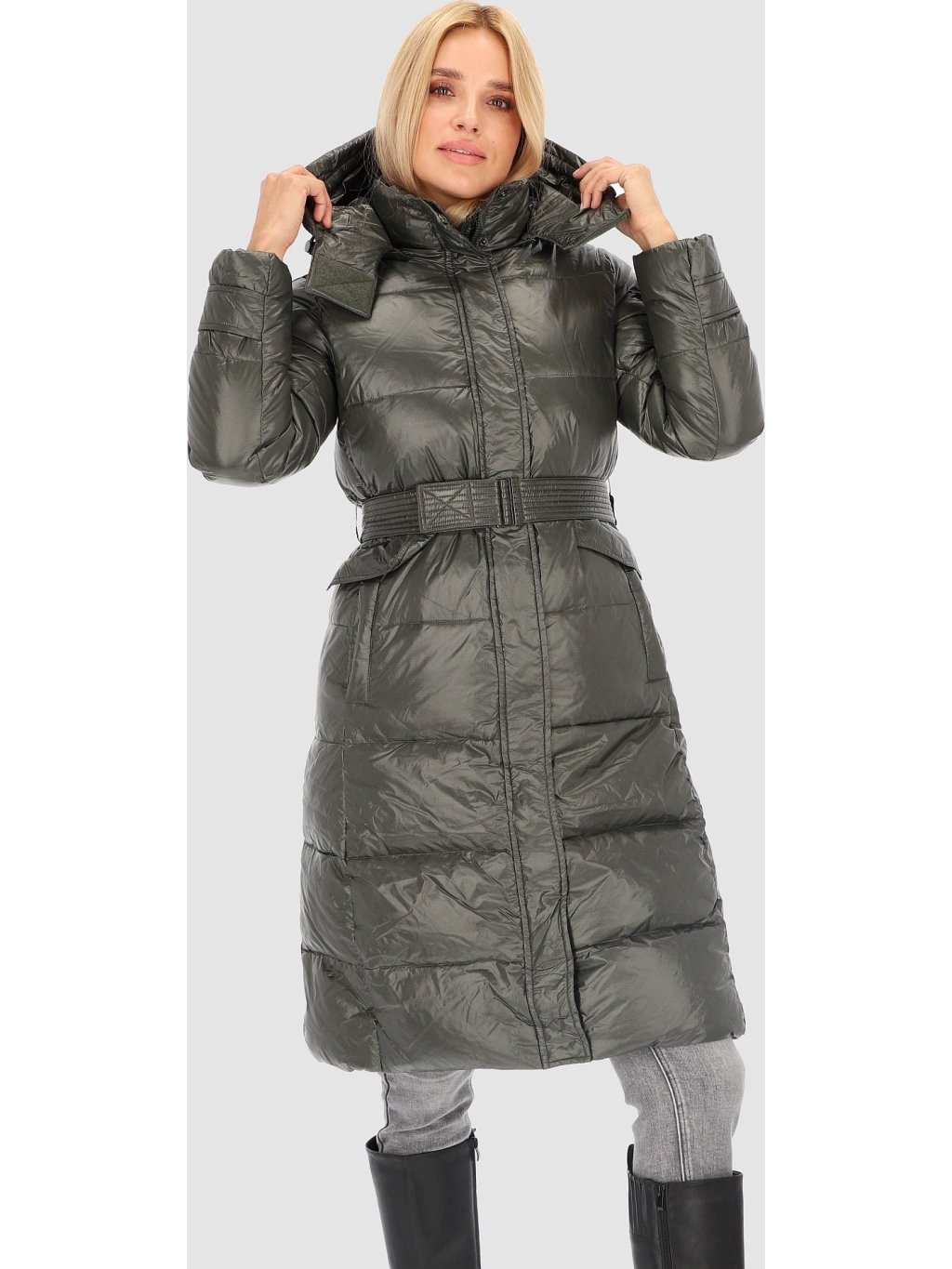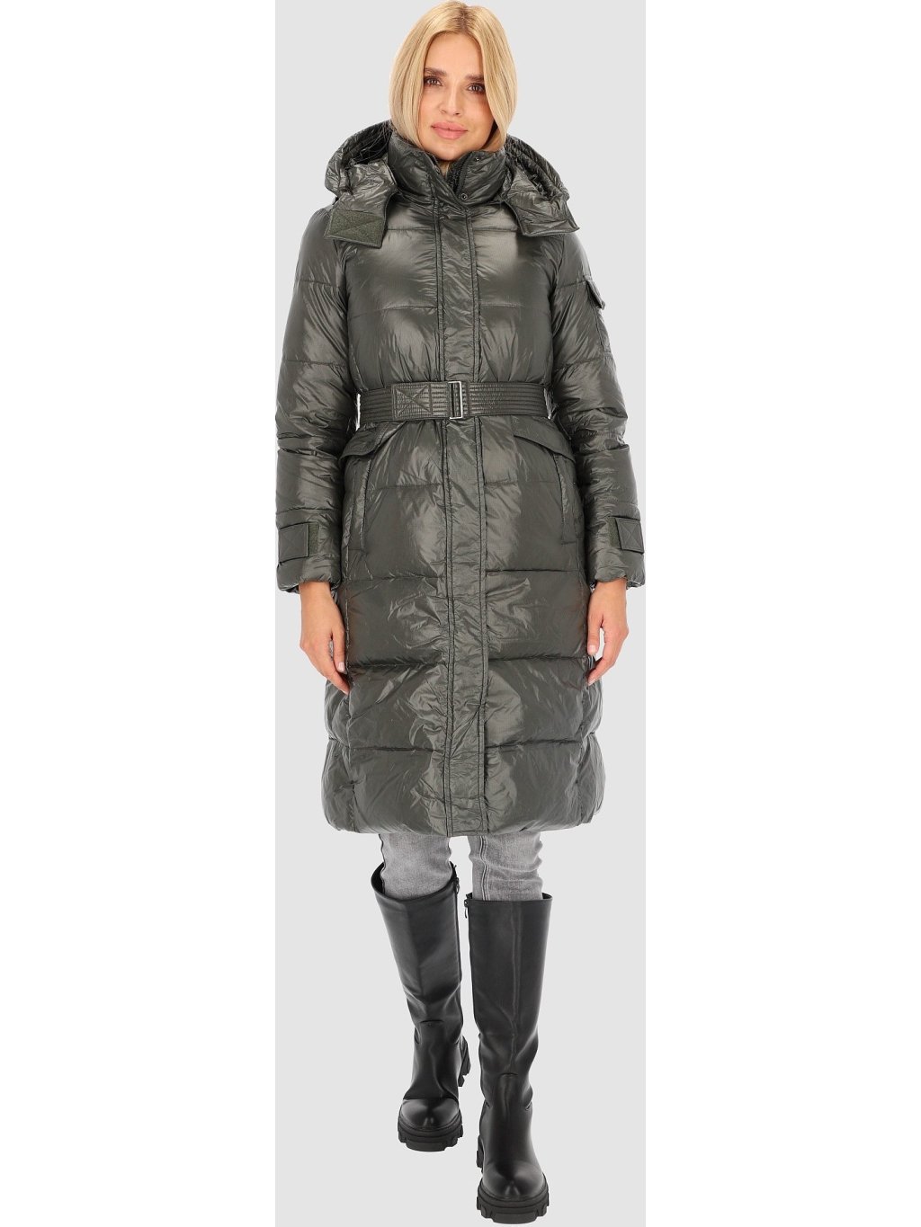 Khaki dámský dlouhý péřový kabát s páskem